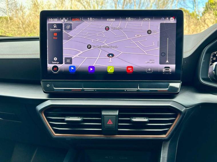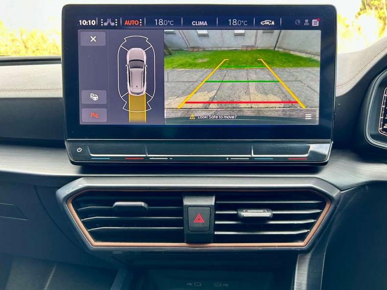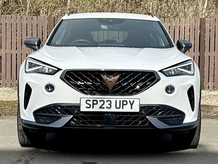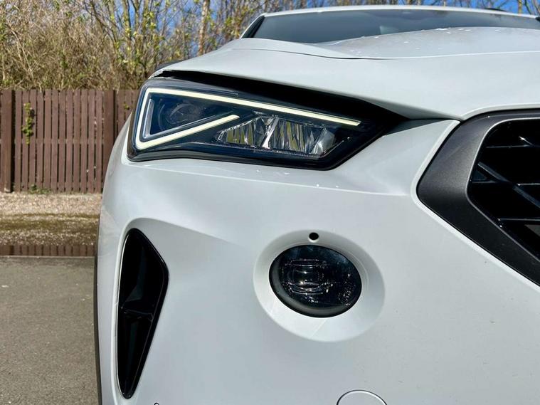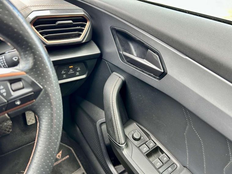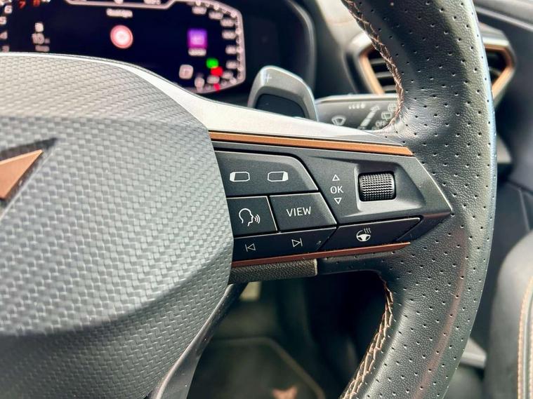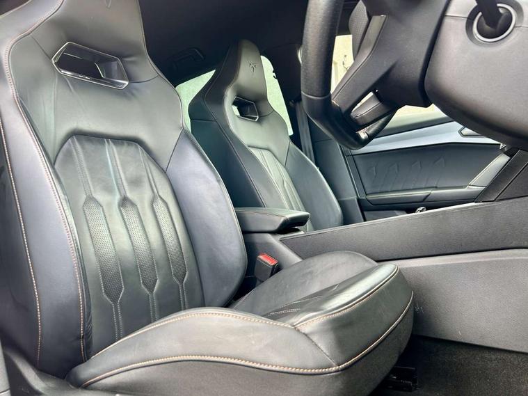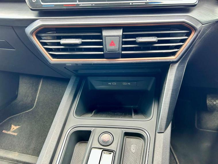 Digital cockpit and configurable dashboard, Driver alert system, Driving profile selection, Forward collision warning with automatic braking, Lane assist, Navigation system with 12'' Touchscreen Display, Park assist (inc front/rear parking sensors), PAS, Predictive adaptive cruise control with speed limiter, Rear view camera, RPM, trip computer, outside temp gauge, instrument light brightness, low fuel warning light, lights on reminder, gearshift indicator, Service interval indicator, Start/stop system with regenerative braking, Voice control system, Wireless apple carplay, Wireless phone charger, Electronic locking differential and dynamic traction support, Standard suspension, 2 front and 2 rear USB type C sockets, Auxiliary input socket, DAB radio, Auto dimming rear view mirror, Body colour door handles, Body coloured bumpers, Dark grey wing mirror, Daytime running light with automatic headlight control and coming home feature, Dynamic headlight range control, Electric front/rear windows, Electrically adjustable heated and folding door mirrors with memory function, Front fog lamps with cornering function, Gloss black roof rails and window surrounds, LED Headlights, LED Taillights with dynamic indicator, Rain sensing wipers, Rear diffuser with black simulated exhaust pipes, Rear side wing doors, Rear wash/wipe, Third brake light, Tinted rear windows, Welcome lights, 12v power supply in centre console, 12V socket, 12v socket in loadspace, 2 front and 2 rear reading lights, 230V socket, 3 seat bench in 2nd row, 60/40 split rear bench seat with armrest and mechanical seat release, Black headlining, Dust/pollen filter, Front and rear head restraints, Front centre armrest, Height/reach adjust steering wheel, Illuminated interior front door sills, Illuminated sunvisor with mirror, Isofix, Leather multi function heated steering wheel with gear shift paddles, Luggage tie-down hooks, Single front passenger seat, Three zone climate control with control panel in rear, Variable luggage/load compartment floor, Wraparound lighting, Genuine Nappa leather Pack - Cupra, 3 point seatbelts on all rear seats, ABS, Brake control system - ESC and brake booster, Child proof door locks, Driver and front passenger airbags with front passenger airbag de-activation, Electronic parking brake, Front and rear disc brakes, Front side curtain airbags, Hill hold control, Public e-call, Seat belt reminder for front and rear seats, Tyre pressure monitoring system, Anti theft alarm system, Keyless entry and start system (KESSY), Locking wheel bolts, Copper and aluminium interior detailing, 19" 'Exclusive' machined sport matte black and silver alloy wheels,