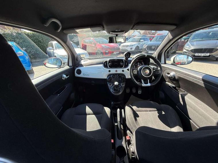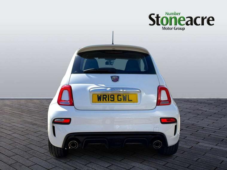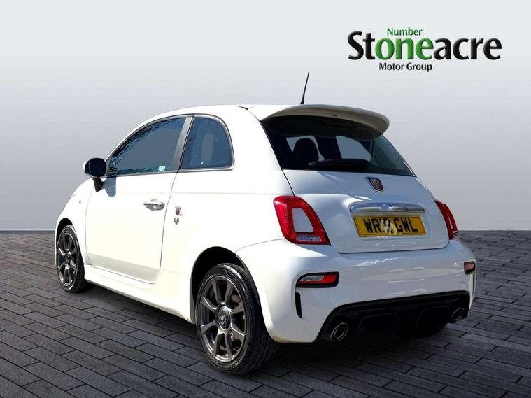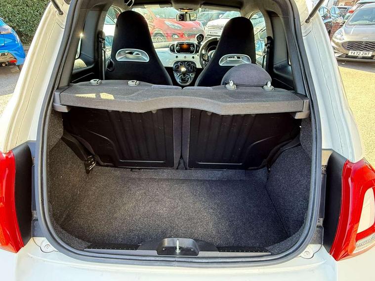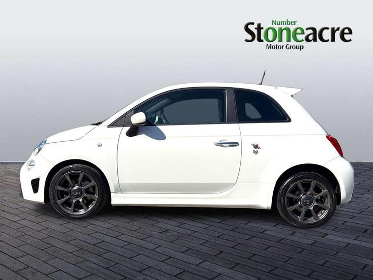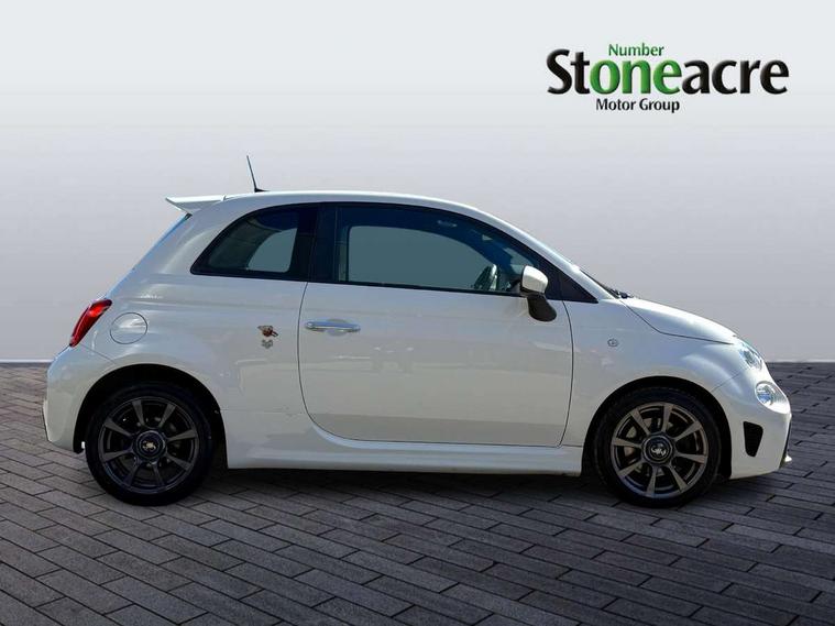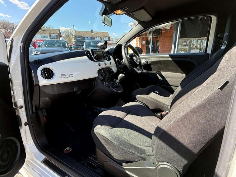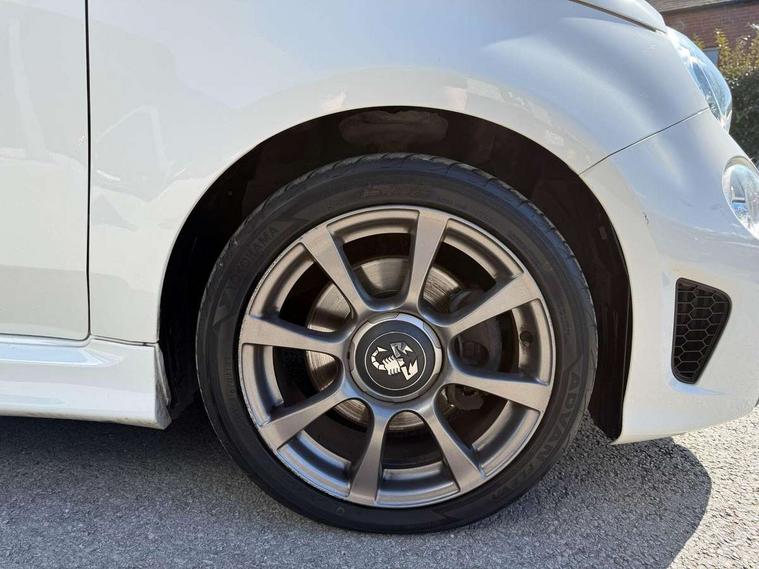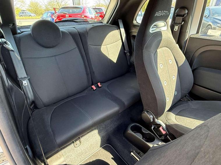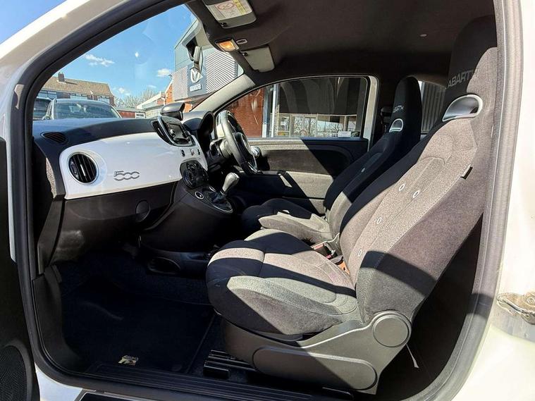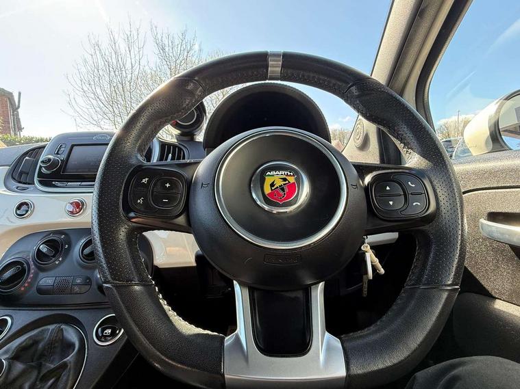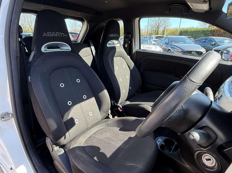 Dualdrive PAS, Sports button, TFT display screen, Trip computer, U-connect access via mobile, Front suspension with FSD technology (Frequency selective Damping), Torque transfer control (TTC), Bluetooth audio streaming, Body coloured bumpers, Electric front windows, Front bumper with honeycomb grille and embossed Abarth logo, Front fog lights, LED daytime running lights, Matt black front and rear bumper insert, Rear wiper, Satin chrome exterior door handles, Twin exhausts with satin steel tailpipes, 12V socket, Chrome gear knob, Driver/front passenger seat height adjustment, Front head restraints, Front passenger seat memory, Glovebox, Height adjustable steering wheel, Interior stowage net, Rear headrests, Sports leather multifunction steering wheel with controls and satin chrome detailing, Sports seats, Stainless steel sports pedals, 3x3 point rear seatbelts, ABS, Driver and passenger airbags, Drivers knee airbag, ESP + ASR/MSR + HBA + Hill holder, Front side airbags, High performance brakes, Rear brake discs, Tyre pressure monitoring system, Ventilated front disc brakes, Window airbags, Alarm, Central locking, Immobiliser, Remote central locking, Fix and go kit,