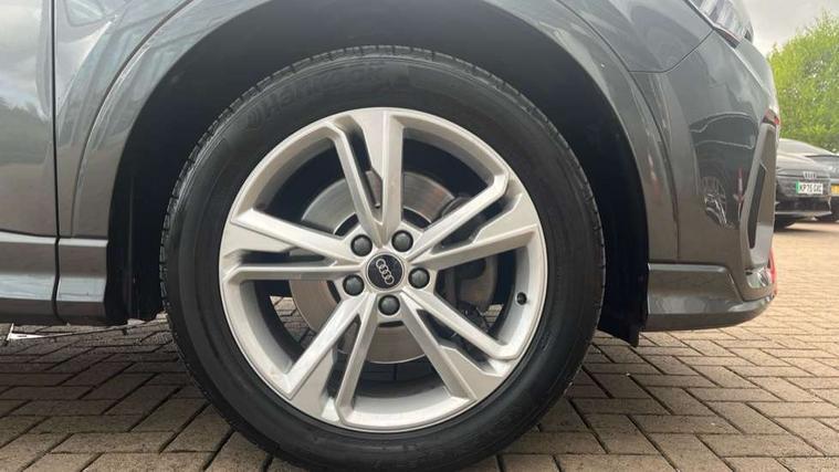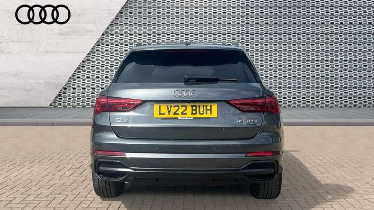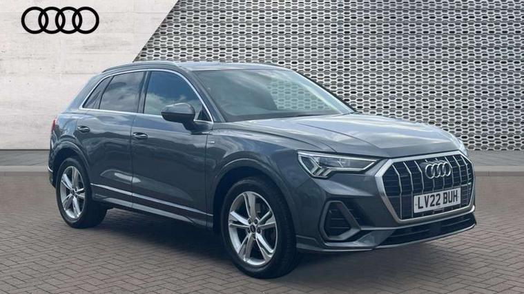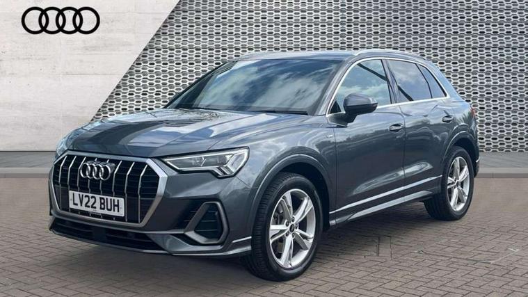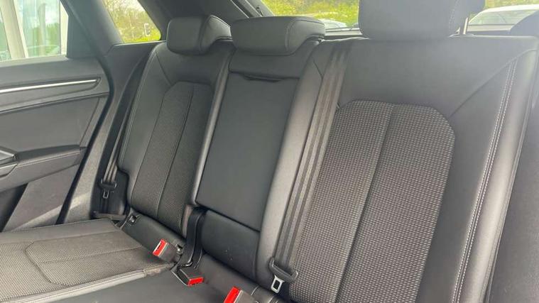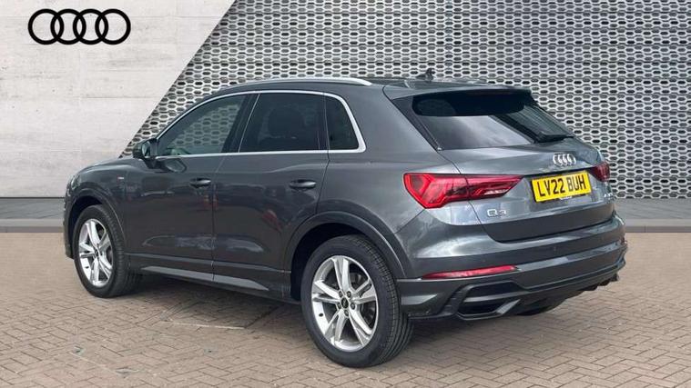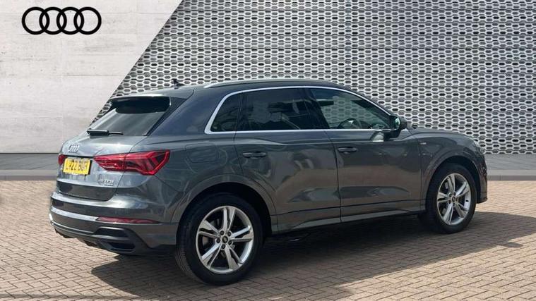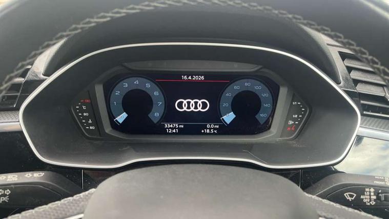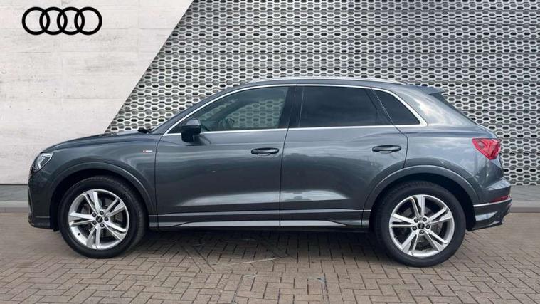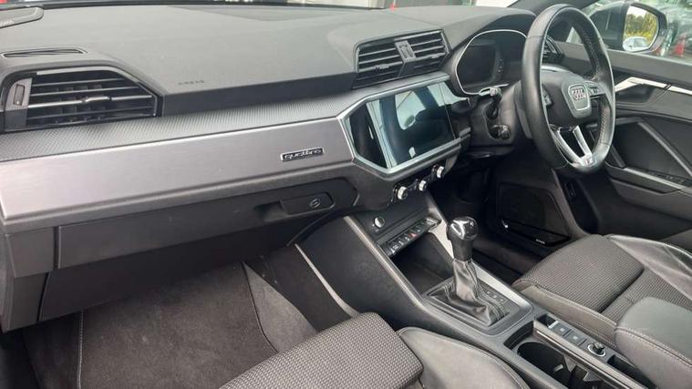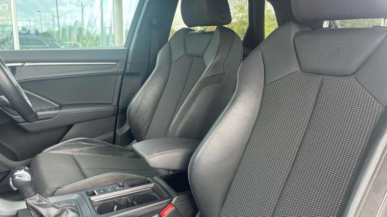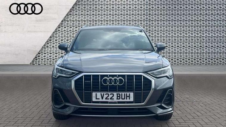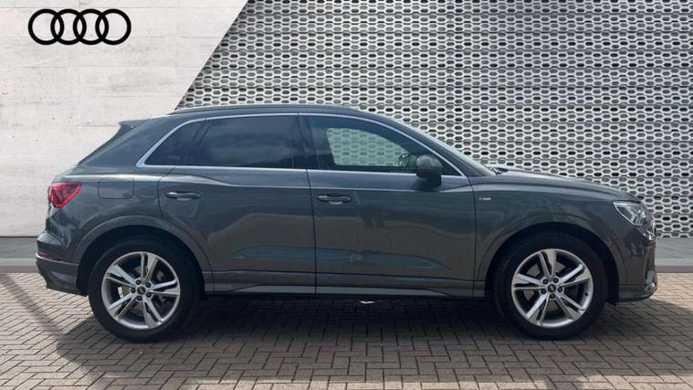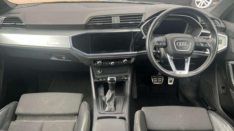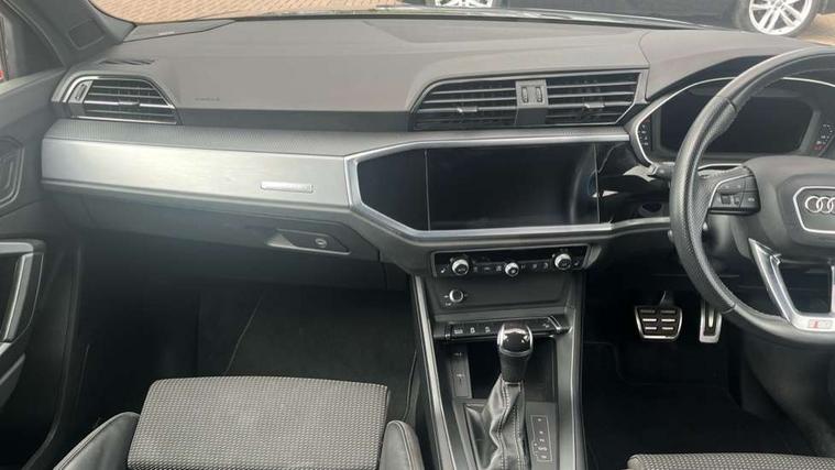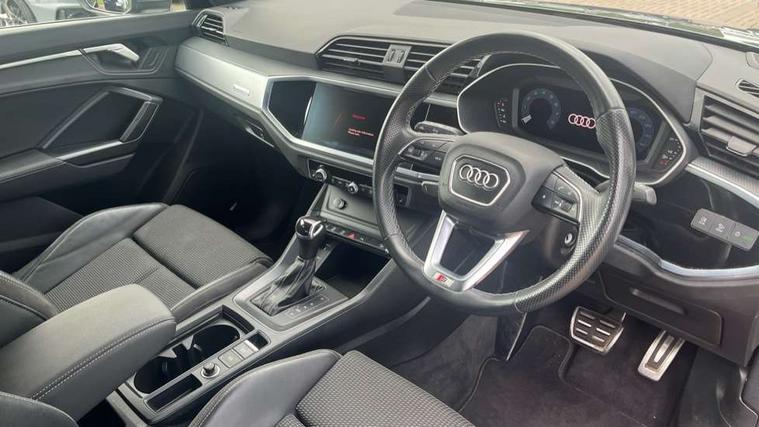 Amazon alexa Integration, Audi connect safety and service (e-call), Audi drive select, Audi lane departure warning, Audi Virtual Cockpit - 10.25" display, Bluetooth interface, Camera based traffic sign recognition, MMI Navigation Plus with high resolution 10.1 inch touchscreen colour display, Power operated tailgate, Progressive steering, Service interval indicator, Smartphone interface includes wireless Apple carplay/Android Auto, Start stop system with recuperation, Voice control system with natural language interaction, Sports suspension, 2 USB-C ports with charge and data functions, 6 passive loudspeakers, DAB digital radio module, Acoustic windscreen, Aluminium roof rails, Aluminium window trim, Auto dimming frameless rear view mirror, Body coloured bumpers, Electrically folding, adjustable and heated door mirrors with integrated LED side indicators and kerb view function for passenger side, Front and rear electric windows, Front fog lights, Front side air inlets in matt platinum grey, Front spoiler blade in matt platinum grey, Grille vertical bars in aluminium silver/Matt, High gloss black finish B and C pillars, LED headlights with LED daytime running lights, LED rear lights, LED third brake light, Privacy glass dark tinted rear and rear-side windows (from B-pillar backwards), Rain and light sensors, Rear diffuser strip in matt titanium black, Rear side wing doors, Rear wiper, S line badges on front wings, S Line front and rear bumpers, Side skirt insert in matt Platinium grey, Silver chrome grille surround, Tinted rear windows, Titanium black radiator grille, Variable front intermittent wipers, 12V socket in rear centre console, 3 seat bench in 2nd row, 40:20:40 folding with manual adjustment for 60:40 forwards/backwards position and backrest angle, Adjustable rear seat bench/backrest with centre armrest and cupholder, Black cloth headlining, Dual zone electronic climate control, Front and rear black floor mats with contrast stitching in rock grey, Front and rear headrests, Front and rear roof module including reading lights, Front centre armrest, Glove compartment lighting, Height and reach adjustable steering wheel, Illuminated door sill trims with S logo, ISOFIX child seat mounting for front passenger with airbag deactivation and outer rear seat including top tether attachment point for outer rear seats, Luggage compartment light, Manual front seats with height adjustment, Perforated leather gearknob, Single front passenger seat, Stainless steel luggage compartment sill finisher, Stainless steel pedals, Non smoking pack - Q3, 3x3 point rear seatbelts, 6 airbags - Driver, front passenger, curtain and side windows, Audi pre-sense front with pedestrain and cyclist recognition, Electrically operated child locks on rear doors, Electromechanical parking brake, Electronic stabilisation control including ABS, ASR and EDL, Front seatbelt reminder, Hill descent control, Hill hold assist, Pre sense basic, Seatbelt monitoring, Tyre pressure warning, Warning triangle and first aid kit, Anti theft alarm, Anti theft wheel bolts, Immobiliser, Remote central locking, Dark matt brushed aluminium inlay, Detail dashboard around MMI touch colour display in glass look, black with surround in aluminium look, Leatherette door armrest,