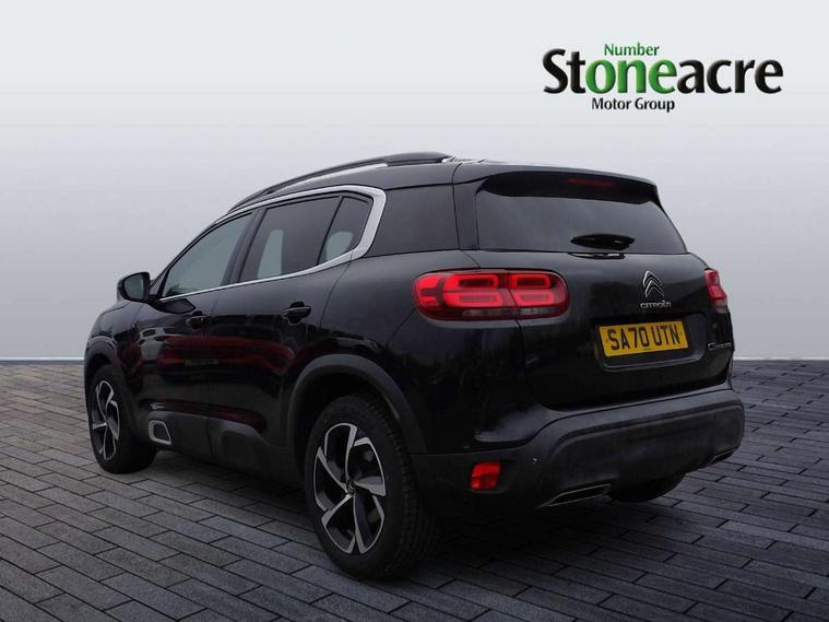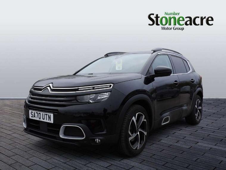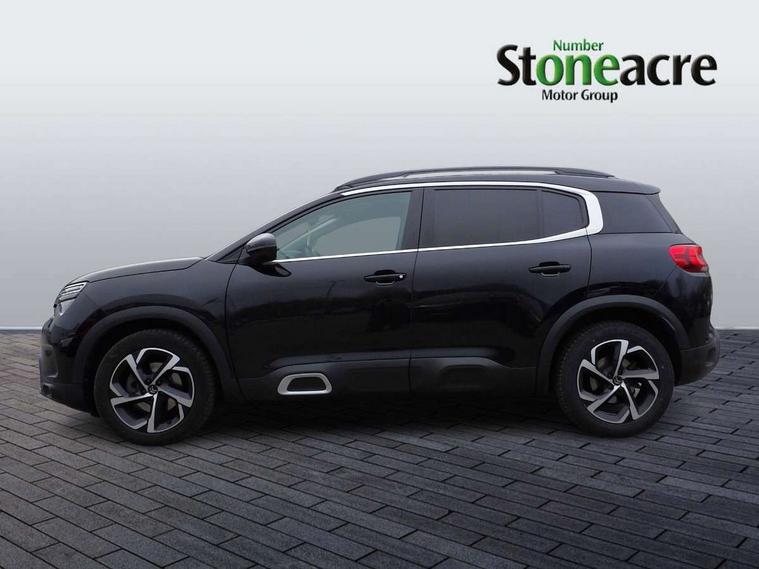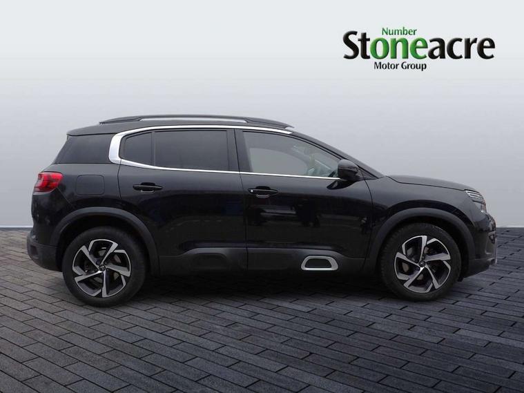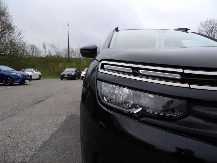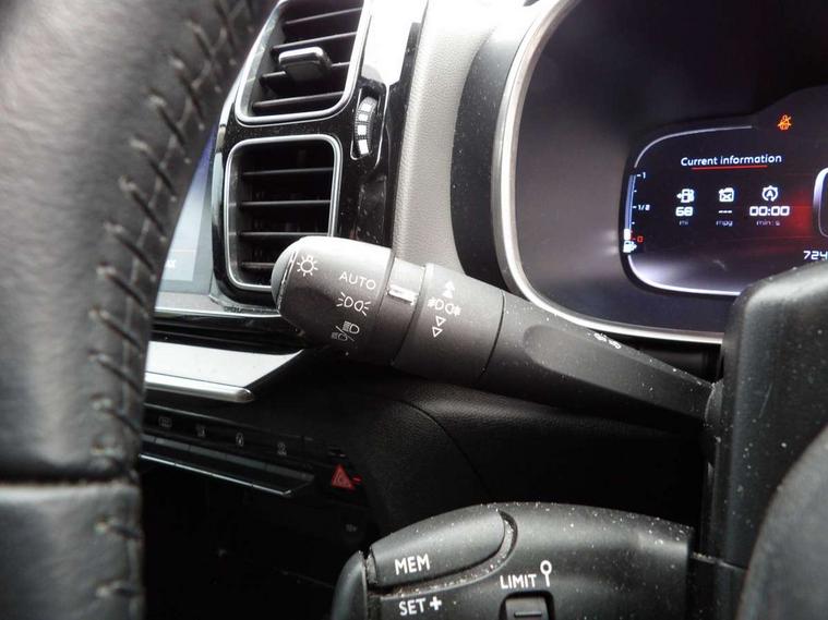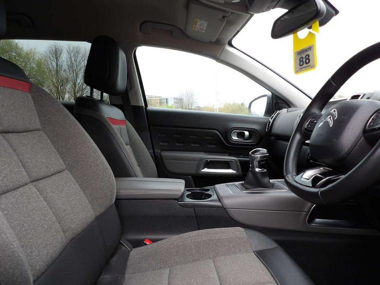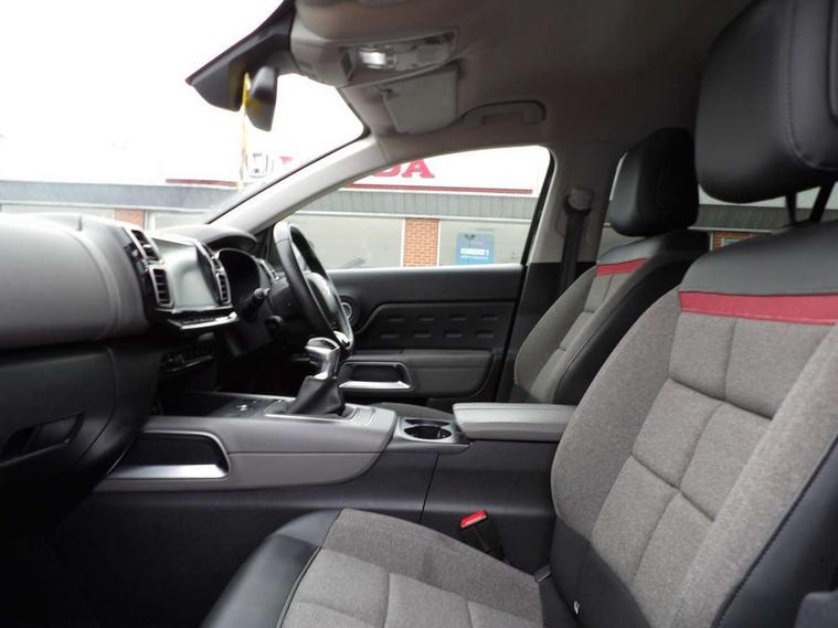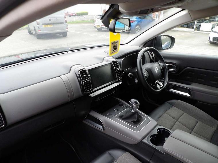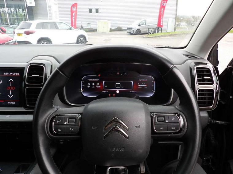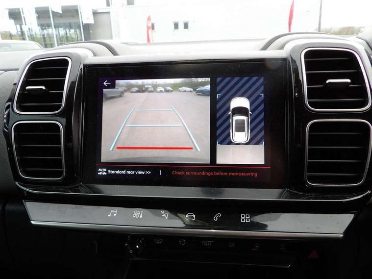 12.3" customisable TFT instrument display, Active blind spot monitoring system, Active lane departure warning system, Bluetooth telephone facility, Central 8" capacitive touch screen, Citroen connect box emergency assist system, Citroen connect Nav with connect box, Coffee Break Alert, Eco+ mode, Electric power steering, Exterior temperature indicator with ice warning, Gear efficiency indicator, Mirror screen with Apple CarPlay and Android auto, Multi function trip computer, Programmable cruise control and speed limiter, Rear parking sensors, Speed limit recognition and recommendation, Traffic sign recognition and recommendation, Suspension with Progressive Hydraulic Cushions, 2 USB sockets, Auxiliary input socket, DAB (Digital Audio Broadcasting), AM/FM and MP3 compatible radio with two tweeters and four speakers, Voice recognition for radio, navigation and telephony features, 3D effect LED rear lights, Acoustic laminated windscreen with rain and brightness sensors, Airbump panels with colour insert on lower portion of the doors, Auto dimming electrochrome rear view mirror, Automatic headlight activation via windscreen mounted sensors, Automatic triggered rear windscreen wiper in reverse gear, Automatic windscreen wipers, Body colour door handles, C5 Aircross monogram on boot rear, Citroen logo and monogram on rear, Dark tinted rear windows and rear windscreen, Electric, heated and folding door mirrors with integrated LED indicator and kerb puddle light, Front fog lights with cornering function, Front windscreen wiper with magic wash cleaning system, Gloss black finish on A and B pillar and aerodynamic trim, Guide me home headlight function, Halogen headlights, Halogen rear fog lights, Halogen rear number plate lights, Headlights left on audible warning, Heated rear windscreen with integrated antenna, High level LED centre brake light, LED daytime running lights, LED front indicators, Longitudinal roof bars, Matte black lower rear skirt, Matte black rear bumper facia, Matte black side sill with anodised silver colour touch, Matte black upper and lower grille, Matte black wheel arch extensions, One touch electric front/rear windows with pinch protection, Painted front bumper, Painted rear bumper, Roof coloured rear spoiler, Satin chrome C signature, Satin chrome window surround, Twin exhaust effect trim, 12V socket in boot, 12V socket in cabin, 2 cup holders in the front and rear centre console, 2 Position boot floor, 2 way lumbar adjustment for driver, 2x Rear coat hooks, 3 Independent full size rear seats with adjustable recline angle, 3x Grab handles retractable with damping, Advanced comfort seats, Air recirculation when reverse gear is engaged, Anti odour and pollen filter, Central front armrest with butterfly wing opening and illuminated storage compartment, Dashboard closed glove box with lid and illumination, Dashboard open central storage compartment, Dimmable white mood lighting, Dual zone automatic climate control, Fixing rings 4 in load compartment, Front and rear LED welcome/LED rear reading lights, Front door pockets store up to 1.5L bottle and A4 note pad, Front interior light with 2 reading spotlights and rear interior light with timer, Front seat back map pockets, Height and reach adjustable leather steering wheel with 2 control zones, Hinged rear parcel shelf, Isofix child seat preparation for front passenger seat, Leather effect interior door handles, Leather steering wheel with satin chrome inserts and radio controls, Manual driver seat adjustment (height, fore/aft and backrest angle), Manual passenger seat adjustment (height, fore/aft and backrest angle), Multi function steering wheel, Open central storage area below touch screen, Rear centre console ventilation system, Rear door pockets store up to 0.5L bottle, Rear passenger air vents, Satin chrome digital instrument panel and touchscreen trim, Satin chrome gear lever, Satin chrome interior door handles, Seatbelt not fastened audible and visual alert for front seats, Seatbelt unfastened on the move audible and visual alert for front and rear seats, Smooth opening flocked glove box with lighting, City camera pack with front parking sensors - C5 Aircross, Safety plus pack - C5 Aircross, 2x Isofix child seat fitting on outer rear seats, 3x Rear three point retractable seatbelts with pretensioners and force limiters in the outer rear seats, ABS/EBD, Adaptive driver and front passenger airbags with passenger airbag deactivation function, Collision risk alert, Driver and front passenger side airbags, DSC (Dynamic Stability Control) and ASR (Electronic Anti-skid System), Electric child locking functionality on rear windows and doors, Electronic parking brake, ESP including traction control and stability programme, Front and rear curtain airbags, Front optimised safety headrests and 3 x rear retractable headrests with height adjustable, Front three point retractable seatbelts height adjustable with pre tensioners and force limiters, Front ventilated disc brakes and rear disc brakes, Hill start assist, Two tone horn, Tyre under inflation indicator, Alarm - perimetric and volumetric alarm with anti-lifting mechanism, Automatic door locking, Automatic hazard light activation upon heavy brake application, Electronic code immobiliser, Keyless entry and start, Remote central locking + deadlocks, Gloss black touch screen surround with integrated tactile buttons and chrome finisher, Leather effect dashboard facia, Satin chrome air vent decors, Soft touch matte dashboard with grey insert, 18" Swirl two tone diamond cut alloy wheels,