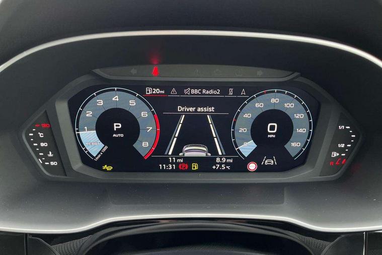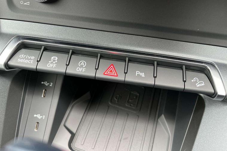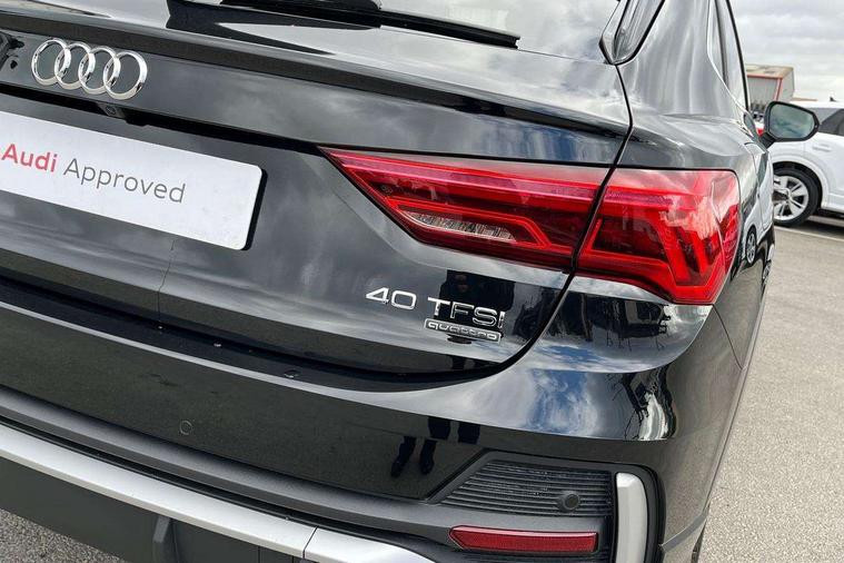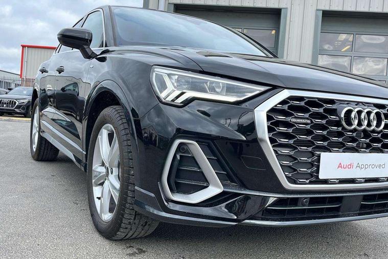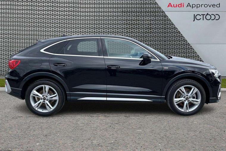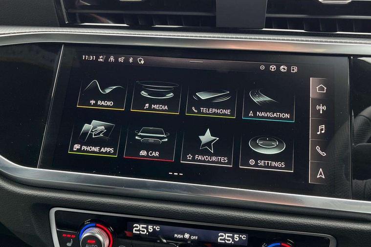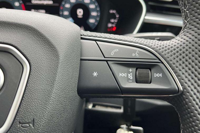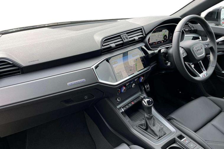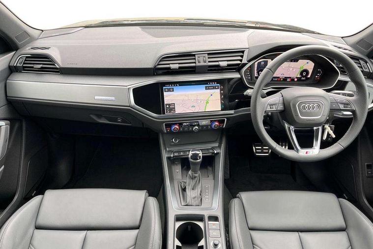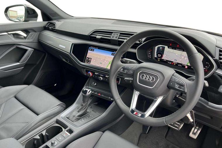 Audi connect safety and service, Audi drive select, Audi lane departure warning, Audi Virtual Cockpit - 10.25" display, Bluetooth interface, Camera based traffic sign recognition, Distraction and Fatigue warning, Legal emergency call, MMI Navigation Plus with high resolution 10.1 inch touchscreen colour display, Power operated tailgate, Progressive steering, Service interval indicator, Smartphone interface includes wireless Apple carplay/Android Auto, Start stop system with recuperation, Voice control system with natural language interaction, Sports suspension, 2 USB-C ports with charge and data functions, 6 passive loudspeakers, DAB digital radio module, Acoustic windscreen, Aluminium window trim, Auto dimming door mirrors, Auto dimming frameless rear view mirror, Electrically folding, adjustable and heated door mirrors with integrated LED side indicators and kerb view function for passenger side, Front and rear electric windows, Front fog lights, Front side air inlets in matt platinum grey, Front underbody protection in manhattan grey paint finish, Grille surround in aluminium silver matt, High gloss black finish B and C pillars, Honeycomb design radiator grille in matt anthracite black, LED Dynamic rear indicators, LED headlights with LED daytime running lights, LED rear lights, LED third brake light, Privacy glass dark tinted rear and rear-side windows (from B-pillar backwards), Rain and light sensors, Rear diffuser grille in grained matt black, Rear diffuser strip in matt anthracite black, Rear side wing doors, Rear underbody protection in matt black, Rear wiper, S line badges on front wings, S Line front and rear bumpers and side skirts, Side skirt insert in matt Platinium grey, Variable front intermittent wipers, 12V socket in rear centre console, 3 seat bench in 2nd row, 3 spoke leather multifunction steering wheel features S badging and grips in perforated leather with contrast stitching, 40:20:40 folding with manual adjustment for 60:40 forwards/backwards position and backrest angle, Adjustable rear seat bench/backrest with centre armrest and cupholder, Black carpet mats, Black cloth headlining, Dual zone electronic climate control, Electric lumbar support, Front and rear black floor mats with contrast stitching in rock grey, Front and rear headrests, Front centre armrest, Height and reach adjustable steering wheel, Horizontal trim strip in matt platinum grey, Illuminated door sill trims with S logo, ISOFIX child seat mounting for front passenger with airbag deactivation and outer rear seat including top tether attachment point for outer rear seats, Luggage compartment sill protection in stainless steel, Manual front seats with height adjustment, Perforated leather gearknob, Single front passenger seat, Stainless steel pedals, Twin leather upholstery with front sport seats + S embossing, Non smoking pack - Q3, 3x3 point rear seatbelts, 6 airbags - Driver, front passenger, curtain and side windows, Audi pre-sense front with pedestrain and cyclist recognition, Electrically operated child locks on rear doors, Electromechanical parking brake, Electronic stabilisation control including ABS, ASR and EDL, Front seatbelt reminder, Hill descent control, Hill hold assist, Pre sense basic, Seatbelt monitoring, Tyre pressure warning, Warning triangle and first aid kit, Anti theft wheel bolts, Immobiliser, Remote central locking, Thatcham approved category 1 anti theft alarm, Aluminium look interior elements, Dark matt brushed aluminium inlay, Detail dashboard around MMI touch colour display in glass look, black with surround in aluminium look, Leatherette door armrest,