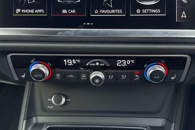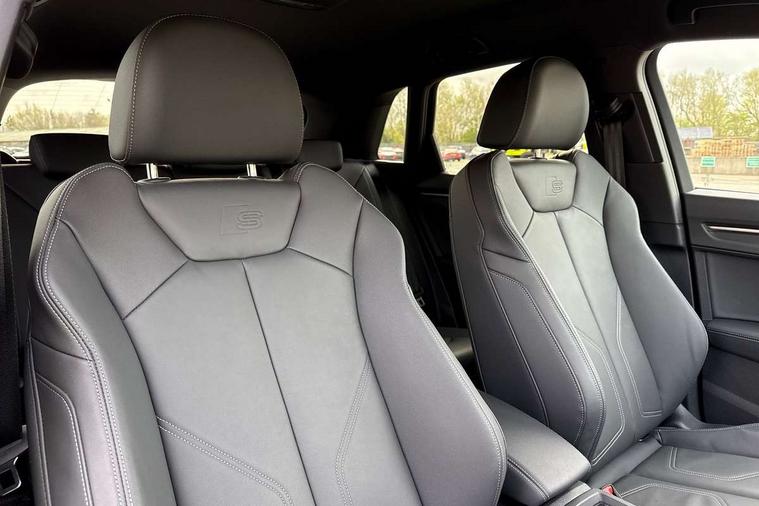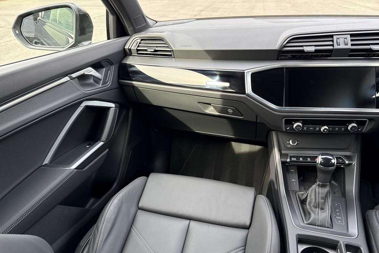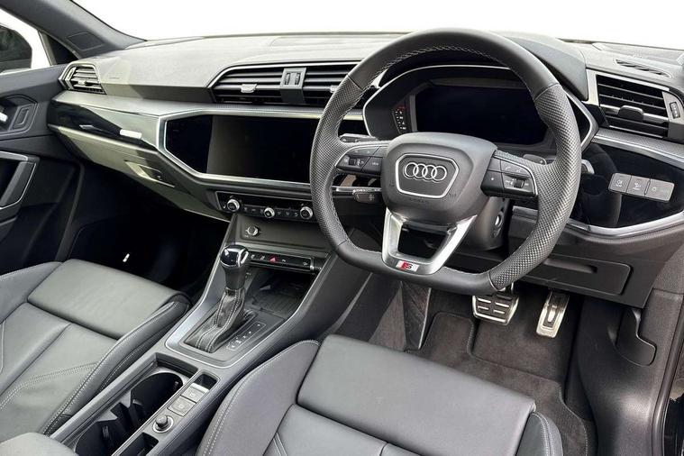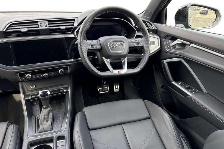 Amazon alexa Integration, Audi connect safety and service, Audi drive select, Audi lane departure warning, Audi Virtual Cockpit - 10.25" display, Bluetooth interface, Camera based traffic sign recognition, Distraction and Fatigue warning, Legal emergency call, MMI Navigation Plus with high resolution 10.1 inch touchscreen colour display, Power operated tailgate, Progressive steering, Service interval indicator, Smartphone interface includes wireless Apple carplay/Android Auto, Start stop system with recuperation, Voice control system with natural language interaction, Sports suspension, 2 USB-C ports with charge and data functions, 6 passive loudspeakers, DAB digital radio module, Acoustic windscreen, Anthracite black radiator grille, Audi Beam uses LEDs to project the Audi logo onto the ground as you exit your Q3, Auto dimming door mirrors, Auto dimming frameless rear view mirror, Black roof rails, Electrically folding, adjustable and heated door mirrors with integrated LED side indicators and kerb view function for passenger side, Front and rear electric windows, Front fog lights, Grille vertical bars in aluminium silver/Matt, High gloss black finish B and C pillars, LED Dynamic rear indicators, LED headlights with LED daytime running lights, LED rear lights, LED third brake light, Privacy glass dark tinted rear and rear-side windows (from B-pillar backwards), Rain and light sensors, Rear diffuser grille in grained matt black, Rear diffuser strip in matt anthracite black, Rear side wing doors, Rear wiper, S line bumpers in contrasting Manhattan grey, Variable front intermittent wipers, 12V socket in rear centre console, 3 seat bench in 2nd row, 40:20:40 folding with manual adjustment for 60:40 forwards/backwards position and backrest angle, Adjustable rear seat bench/backrest with centre armrest and cupholder, Black carpet mats, Black cloth headlining, Dual zone electronic climate control, Electric lumbar support, Front and rear black floor mats with contrast stitching in rock grey, Front and rear headrests, Front centre armrest, Height and reach adjustable steering wheel, Illuminated door sill trims with S logo, ISOFIX child seat mounting for front passenger with airbag deactivation and outer rear seat including top tether attachment point for outer rear seats, Luggage compartment sill protection in stainless steel, Manual front seats with height adjustment, Perforated leather gearknob, Single front passenger seat, Stainless steel pedals, Twin leather upholstery with front sport seats + S embossing, Black styling pack - Q3, Non smoking pack - Q3, 3x3 point rear seatbelts, 6 airbags - Driver, front passenger, curtain and side windows, Audi pre-sense front with pedestrain and cyclist recognition, Electrically operated child locks on rear doors, Electromechanical parking brake, Electronic stabilisation control including ABS, ASR and EDL, Front seatbelt reminder, Hill descent control, Hill hold assist, Pre sense basic, Seatbelt monitoring, Tyre pressure warning, Warning triangle and first aid kit, Anti theft wheel bolts, Immobiliser, Remote central locking, Thatcham approved category 1 anti theft alarm, Aluminium look interior elements, Detail dashboard around MMI touch colour display in glass look, black with surround in aluminium look, Leatherette door armrest, Piano black inlay,