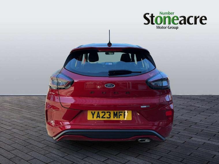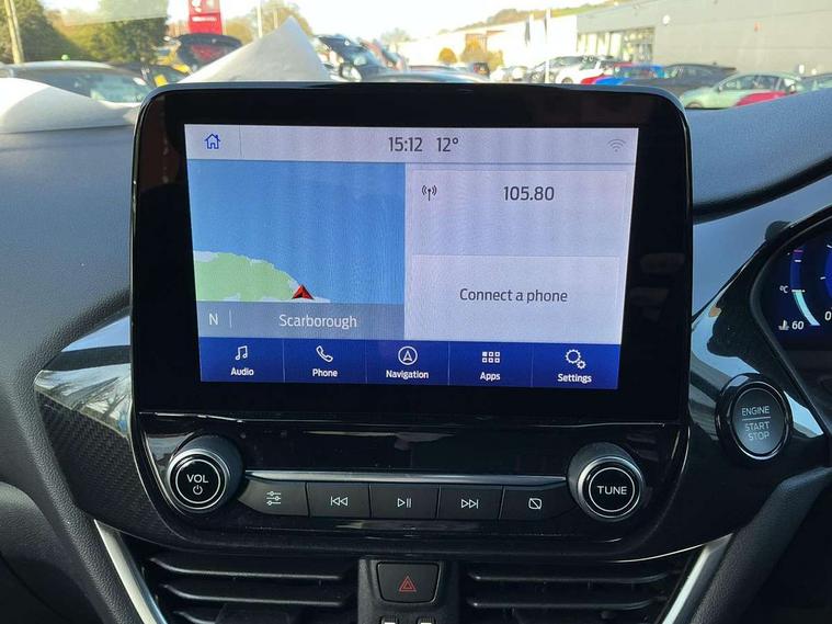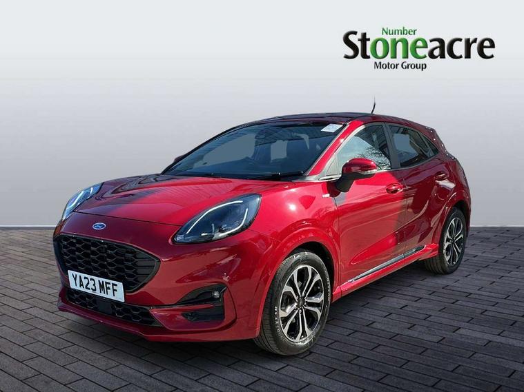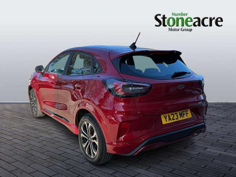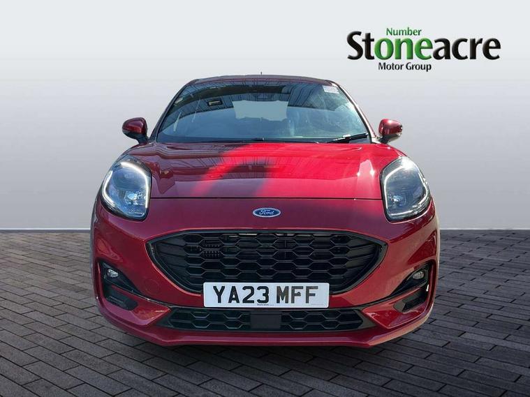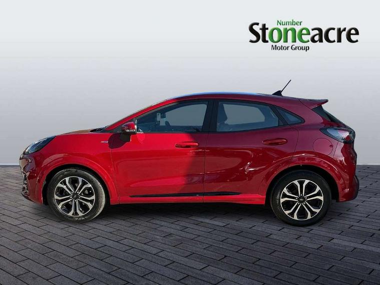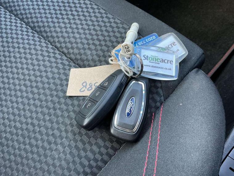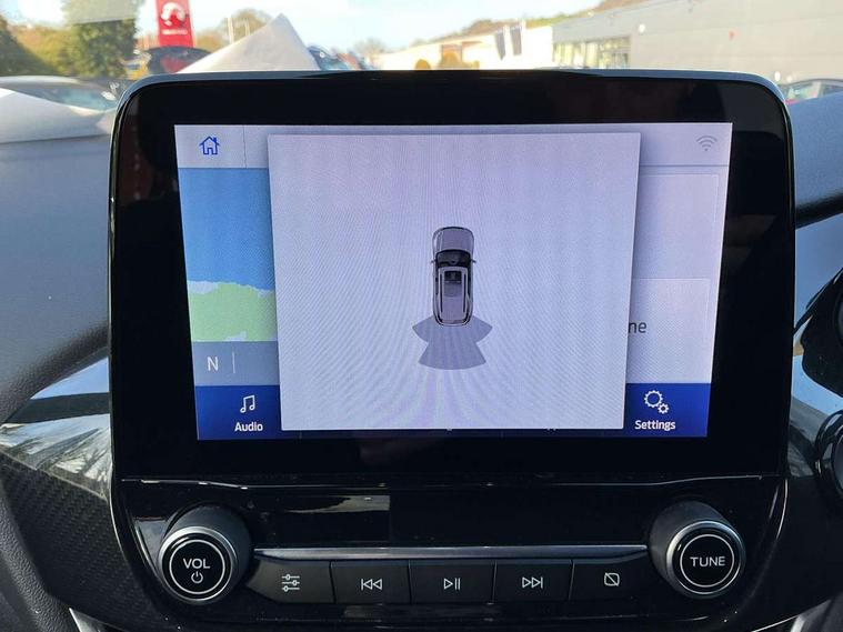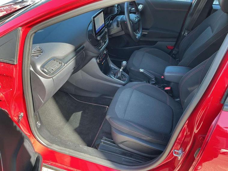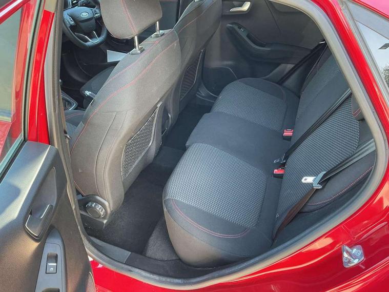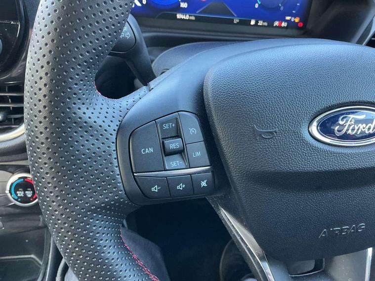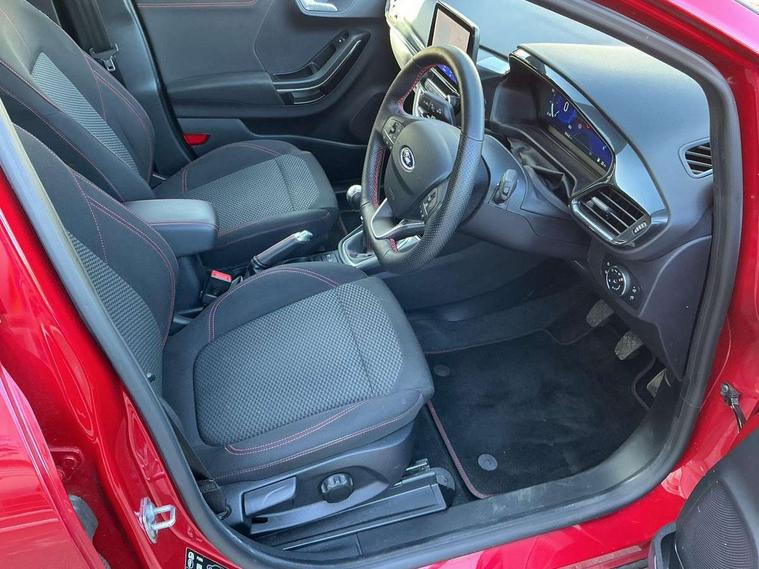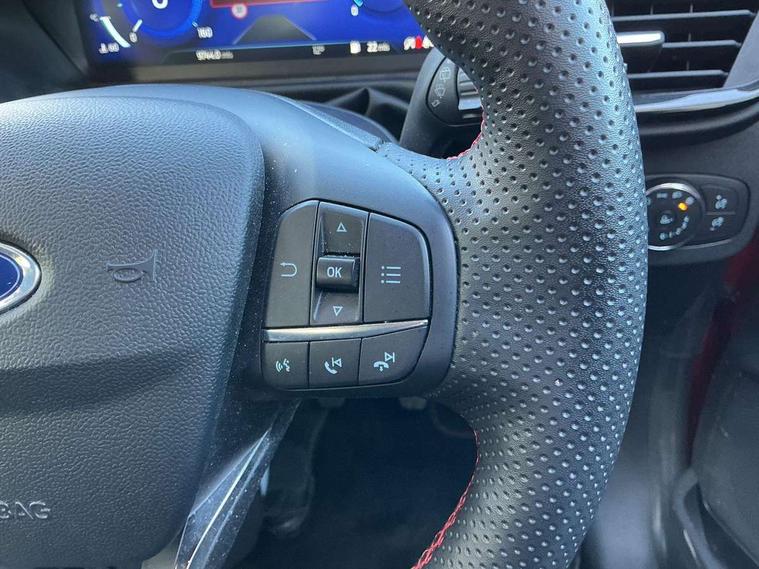 Driver impairment monitor, Emergency call service, Ford easy fuel, Full digital 12.3" instrument cluster, Lane keeping aid with lane departure warning, Power assist steering, Power start button, Rear parking sensor, Selectable drive modes(Normal, Eco, Sport, Slippery and Trail), Speed sign recognition, Sport suspension, Automatic headlights with auto high beam, Automatic rain sensing wipers, LED rear lamps, Power foldable heated door mirrors with puddle lamps, Projector headlamps with LED day time running lights and front fog lamps, Quickclear heated windscreen, Rear side wing doors, Rear wiper, ST-Line body styling kit with unique grille and large body colour rear spoiler, Third brake light, 3 seat bench in 2nd row, Centre console with armrest and stowage, Ford megabox extended bootspace, Front and rear head restraints, Front floor mats, Manual 2 way passenger seat adjustment, Manual 4 way driver seat adjust with lumbar adjustment, Single front passenger seat, ST- Line cloth trim with red stitching, ST-Line flat bottomed sensico leather steering wheel with leather handbrake and aluminium gear knob, Ford SYNC 3 navigation pack - Puma, 3 rear seatbelts, Child safety lock, Electronic stability control (ESC) and hill start assist, Pedestrian/cyclist detection & post-collision braking, Pre collision assist system, Tyre pressure monitoring system (TPMS), Thatcham alarm,