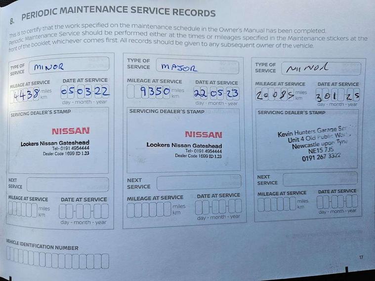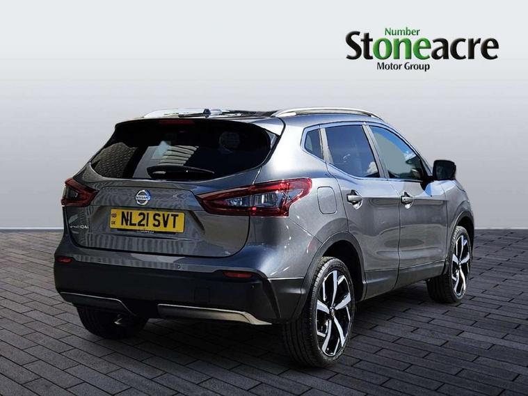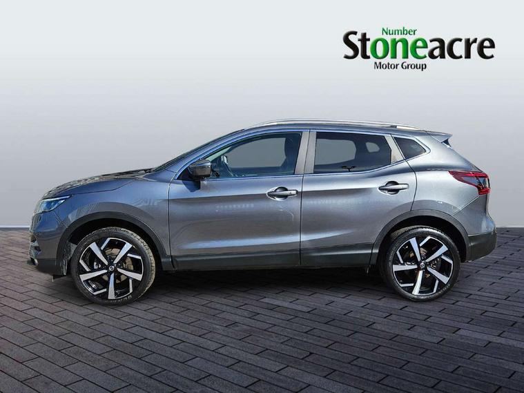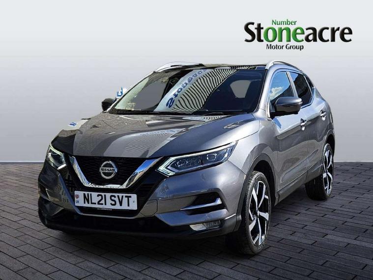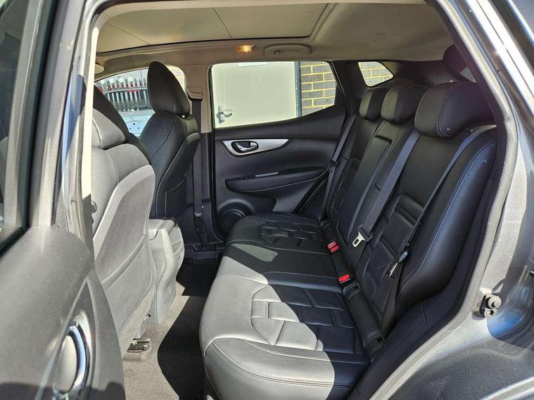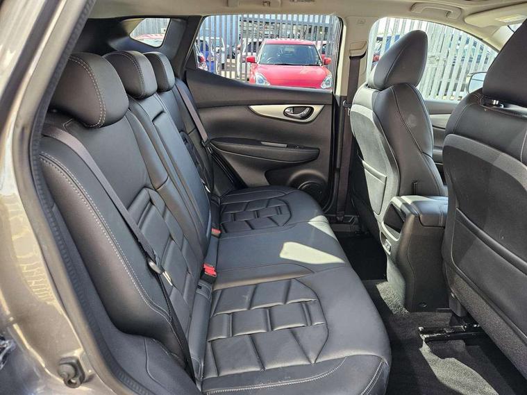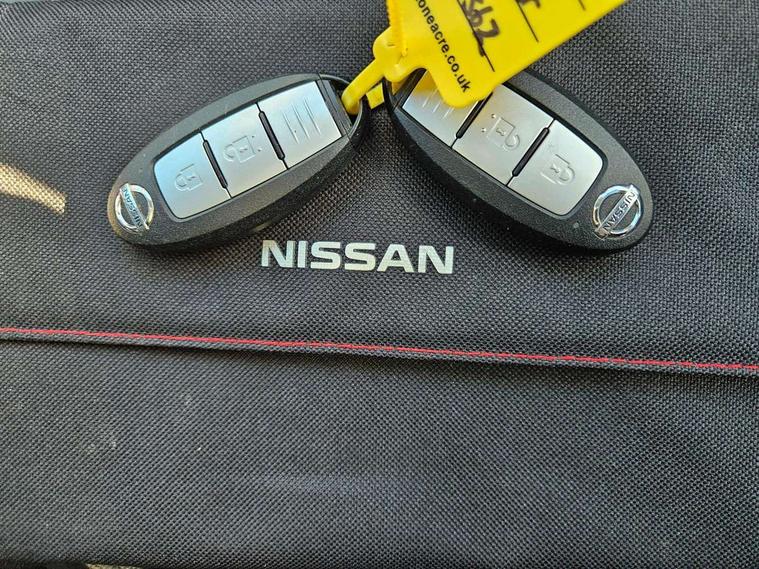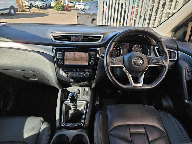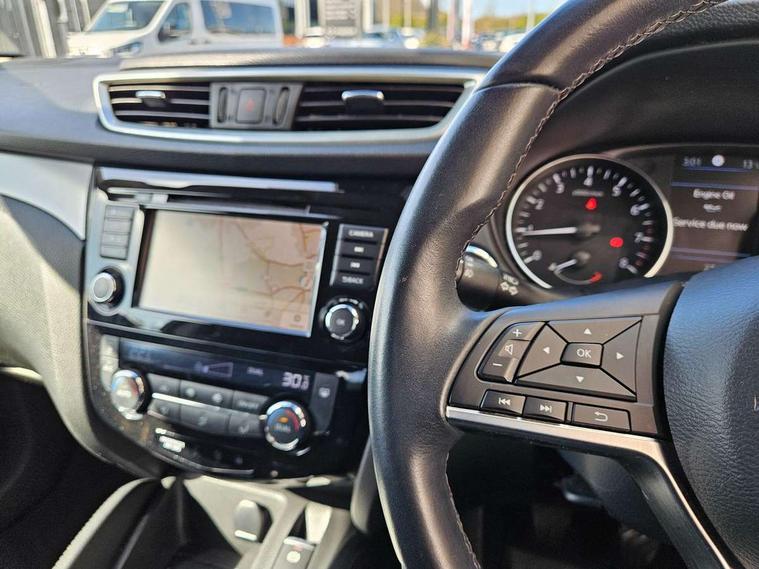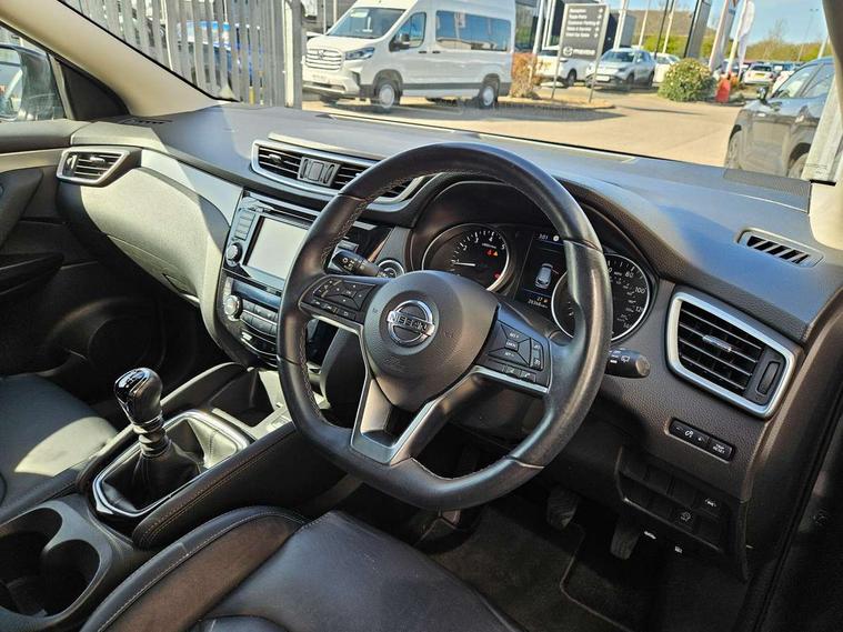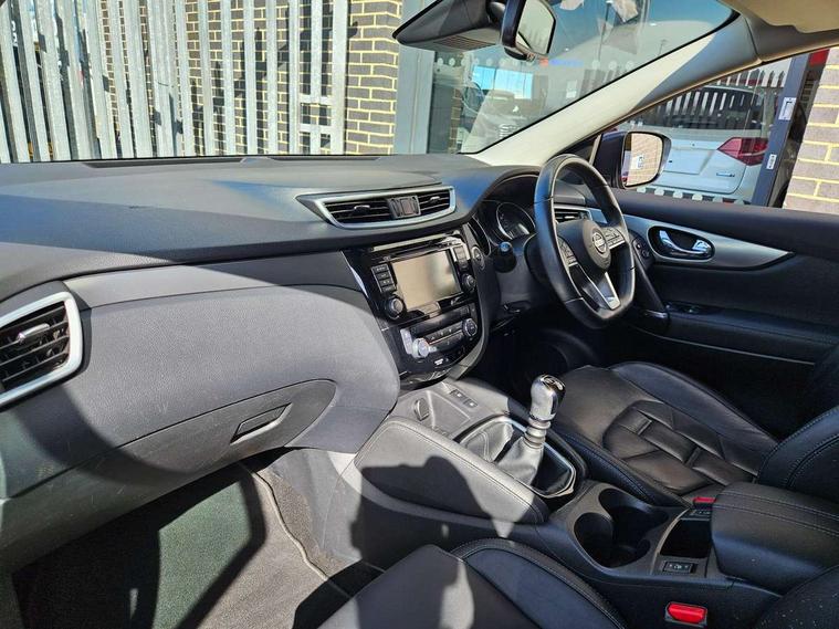 360 degree Intelligent around view monitor, Advanced drive assist display 5'' TFT coloured screen, Apple car play/Android Auto, Bluetooth connectivity, Cruise control + speed limiter, Electric speed sensitive power steering, Front parking sensors, Idle stop/start system, Intelligent park assist, Lane departure warning system, Nissan connect evo 7" touchscreen navigation and entertainment system, Normal or sport selectable steering, Outside temperature sensor, Premium Tomtom connected services, Push button starter, Rear parking sensors, Service interval indicator, Smartphone integration, Traffic sign recognition, Trip computer, Voice control system, Nissan chassis control (intelligent ride control, intelligent trace control), 6 speakers, AM/FM radio, CD audio system, Aux-in socket, DAB Digital radio, Steering wheel mounted audio controls, USB port, Anti dazzle rear view mirror, Auto wipers, Body colour bumpers, Body coloured door handles, Body coloured door mirrors, Chrome window surround, Daytime running lights dip function when turn signal applied, Electric adjustable heated door mirrors with memory, Electric folding door mirrors, Electric front and rear windows with one touch illuminated window controls, Front fog lights, High beam assist, Intelligent auto headlights, LED indicators in door mirrors, Matt silver roof rails, Privacy glass, Rear roof spoiler, Rear wiper with reverse link, Shark fin antenna, Silver rear styling plate, Underbody vortex generators, 2 X front 12v power sockets, 3 height adjustable rear headrests, 60/40 split folding rear seat, Ambient interior lighting, Ambient lighting around centre console, Boot lighting, Centre console storage box/armrest, Chrome interior door handles, Dual zone climate control, Electric 4-way lumbar support for drivers seat, Electrically adjustable driver seat with memory, Electrically adjustable passenger seat, Front and rear door pockets with bottle holders, Front and rear seat belt pre-tensioners with load limiters, Height adjustable front headrests, Individual rear seat reading lights, ISOFIX restraints on outer rear seats x2, Leather D shaped steering wheel, Leather gear lever, Leather knee pad, Luggage board system, Luxury floor mats, Manual height adjustable passenger seat, Manual lumbar support on passenger seat, Monoform front sport seats with plastic backboard, Nappa leather upholstery with 3D quilted, Parcel shelf stow function under luggage board, Pollen filter, Rear armrest with 2 cupholders, Synthetic leather wrapped door handle with contrasting stitching, Tilt/telescopic adjustable steering wheel, Glass roof pack - Qashqai, Heat package - Qashqai, LED pack - Qashqai, 6 airbags - Driver, front passenger, curtain and side airbags, ABS, ESP, EBD and brake assist, Auto hold function, Child locks on rear doors, Electronic parking brake, Front and rear seat belt warning, Height adjustable front seatbelts, Hill start assist, Intelligent emergency braking with pedestrian recognition, Passenger airbag deactivation system, Three 3 point rear seatbelts, Tyre pressure monitoring system, Anti-theft immobiliser, Intelligent Key, Remote central locking, Thatcham Cat.1 alarm, Carbon graphite dash trim, 19" Alloy wheels,