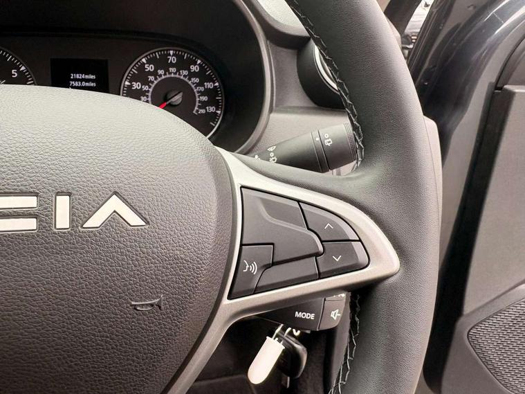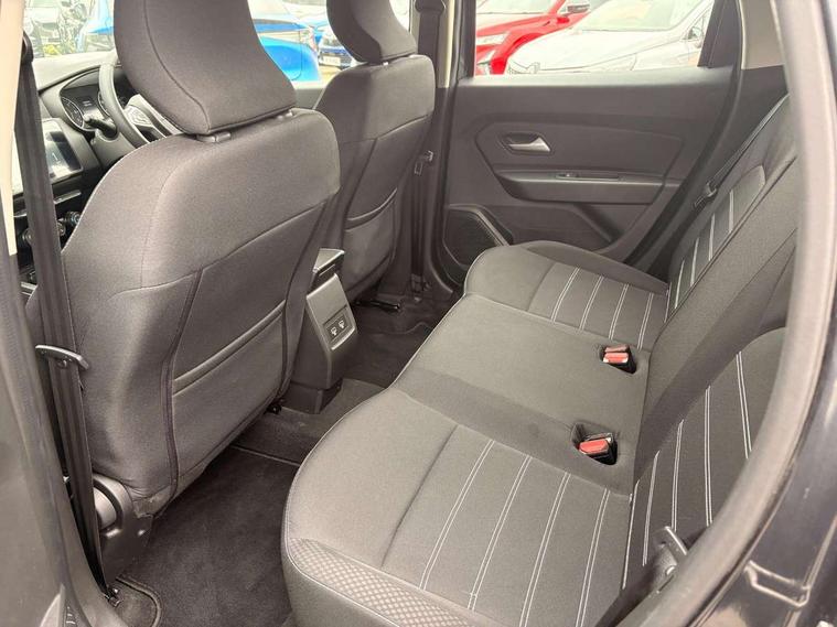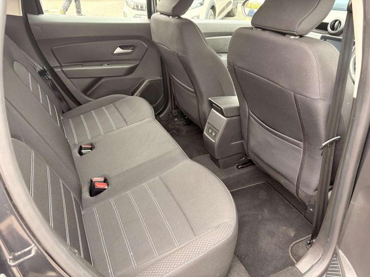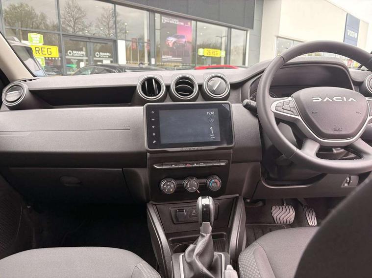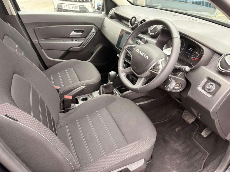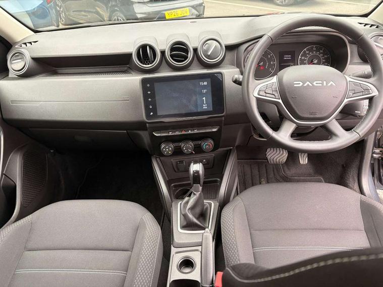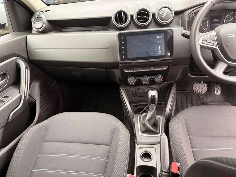 Cruise control and speed limiter, eCall emergency system, Eco mode, Electric power assisted steering, On board computer, odometer, trip computer, average fuel consumption, average speed, service indicator, outside temperature gauge, Rear parking sensors, Rev counter, Reversing camera, Stop/start system, 8" Media display with smartphone replication, 2 usb sockets and 6 speakers, Dacia plug and radio/MP3/USB/bluetooth/DAB/steering wheel control, 3 speed windscreen wipers, Black longitudinal roof bars with Duster inscription, Black side sills, Black/satin chrome tailgate trim with Duster inscription in black background and lettering, Body coloured door handles, Chrome front grille with hot stamping, Chrome logo surround on steering wheel, Daytime running lights, Drivers window one touch up/down, Dusk sensor, Electric adjustable/heated door mirrors, Electric front windows, Electric rear windows, Front and rear body coloured bumpers, Front door sill protection strip, Front fog lights, Heated rear window, High level third rear brake light, Rain sensor, Rear side wing doors, Rear spoiler, Rear wash/wipe, Satin chrome door mirrors, Tinted windows, Underbody protection skid plates, Y shaped LED headlights with rear LED lights, 3 rear height adjustable headrests, 3 seat bench in 2nd row, 60/40 split folding rear seat, Backlighted steering wheel buttons, Boot light, Driver seat lumbar adjustment, Fabric decorative insert on door panels, Fabric upholstery, Front head restraints, Front passenger reading light, Gear shift indicator, Height adjustable driver seat, Height adjustable front and rear headrests, Height and depth adjustable steering wheel, High centre console with driver armrest, Isofix points for child seats in both outer rear seats, Manual air conditioning, Map pocket on front seat backs, Passenger sunvisor with vanity mirror, Rear passenger reading light, Satin chrome interior door handles, Satin chrome lower steering wheel insert, Single front passenger seat, Soft feel leather steering wheel, 3x3 point rear seatbelts, ABS and Emergency brake assist, ASR traction control with Electronic stability control, Child locks on rear doors, Door open visual and audible warning, Driver airbag, Driver and passenger seatbelt not fastened - visual and audible warning, EBD - Electronic brakeforce distribution, Front passenger airbag, Front passenger airbag deactivation, Front seatbelt pretensioners, Front side airbags, Height adjustable front seatbelts, Hill start assist, Tyre pressure monitor, Remote central locking, Thatcham approved engine immobiliser, Charcoal grey central console surround, Matt black central console fascia, Piano black decorative insert on front door panels, Satin chrome air vent surround, Satin chrome instrument dial surrounds, 16" alloy wheels,