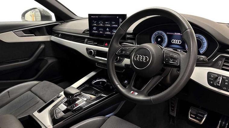 Audi connect safety and service (e-call), Audi drive select, Audi smartphone interface, Audi virtual cockpit, Automatic start-stop system with coasting functionality and efficiency programme, Bluetooth interface, Camera based traffic sign recognition, Electromechanical power steering, Email, calendar and text messages displayed via MMI, Front and rear parking sensors, Lane departure warning, MMI Navigation plus with MMI touch includes 10.1" high resolution colour MMI display, 3D map, Power operated tailgate, Rear view camera, Voice control system, 54 litre fuel tank, Sports suspension lowered by 23mm, 2 USB charging ports, 8 passive loudspeakers, DAB digital radio reception, Aluminium roof rails, Auto dimming rear view mirror, Body colour door handles, Body colour front spoiler lip, Body colour side sill trim, Body coloured door mirrors, Electric adjustable/heated/folding door mirrors with auto dimming, Grained matt black side air inlets with matt aluminium silver inlay, High beam assistant, Honeycomb structure radiator grille in grained matt black, LED headlights with LED rear lights + dynamic rear indicators + headlight adjustment and high beam, turning light + LED daytime running lights, LED third brake light, Matt aluminium silver tailpipe trim, Privacy glass, Rain and light sensors, Rear side wing doors, Rear wiper, S Line badges on the front wings, S line front and rear bumpers with side skirts, S Line rear diffuser in matt anthracite black with trim strip in matt aluminium silver, S Line roof edge spoiler, Variable intermittent front wash/wipe, Windscreen with acoustic glazing, 3 spoke high multi-function sports leather steering wheel grips in perforated leather with S badging including paddle shift, 4 way electric lumbar support for driver and front passenger, 40/20/40 split folding 3 rear seat bench in 3 parts with rear centre armrest, Black carpets, Black cloth headlining, Black perforated leather gearknob, Contrast stitching on seats, steering wheel and gear lever gaiter, Deluxe 3 zone electronic climate control, Electric load area cover, Front and rear head restraints, Front centre armrest, Heated front seats, Illuminated door sill trims with S logo, ISOFIX child seat mounting and top tether, Manual seat adjustment, Single front passenger seat, Stainless steel pedals and foot rest, High gloss package - A4, LED Interior light pack - A4/S4, 3 rear seatbelts, 6 airbags - Driver, front passenger, curtain and side windows, Attention and drowsiness assist, Electronic Stabilisation Control (ESC) including ABS, ASR and EDL, Hill hold assist, Multi collision brake assist, Pop-up bonnet for pedestrian protection, Pre sense city, Rear door child safety locks, Seatbelt monitoring, Warning triangle and first aid kit, Anti theft alarm, Anti theft wheel bolts, Central locking, Keyless Go, Matt brushed aluminium inlays, Tool kit, Tyre repair kit,