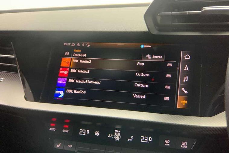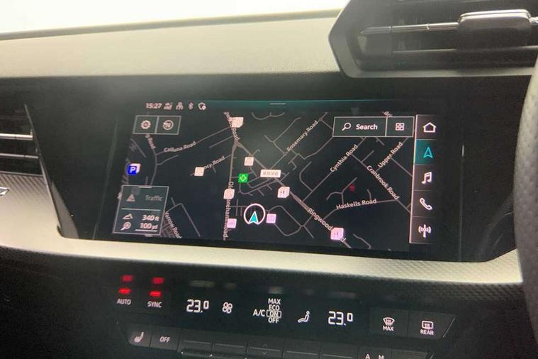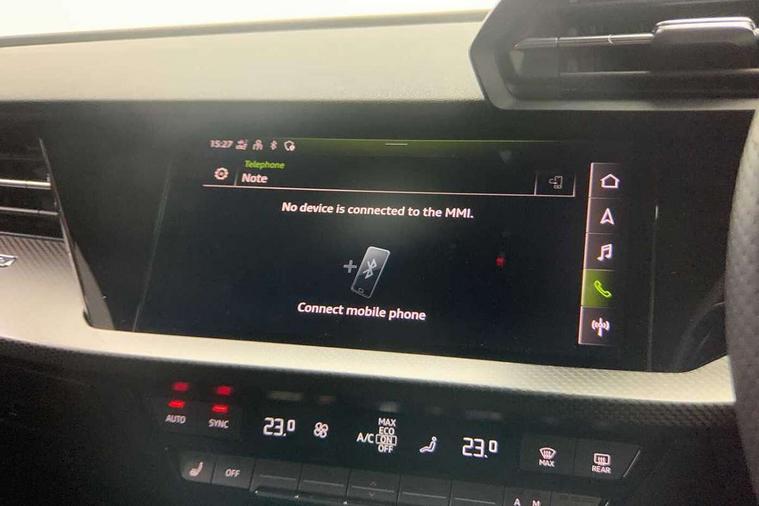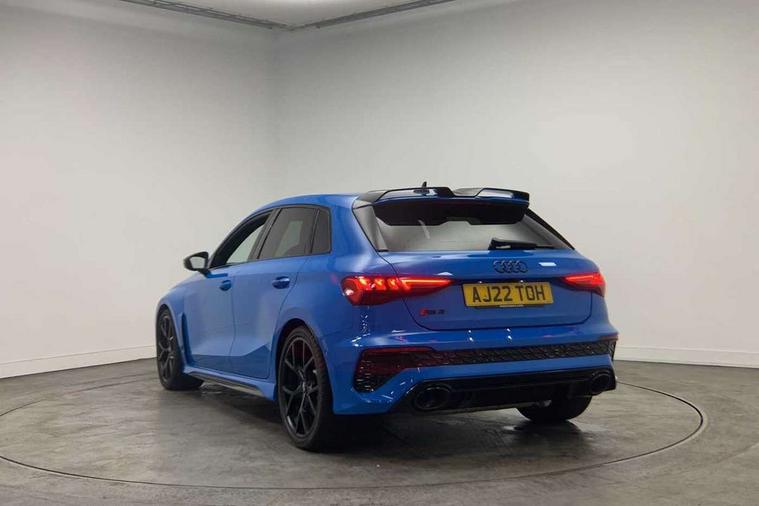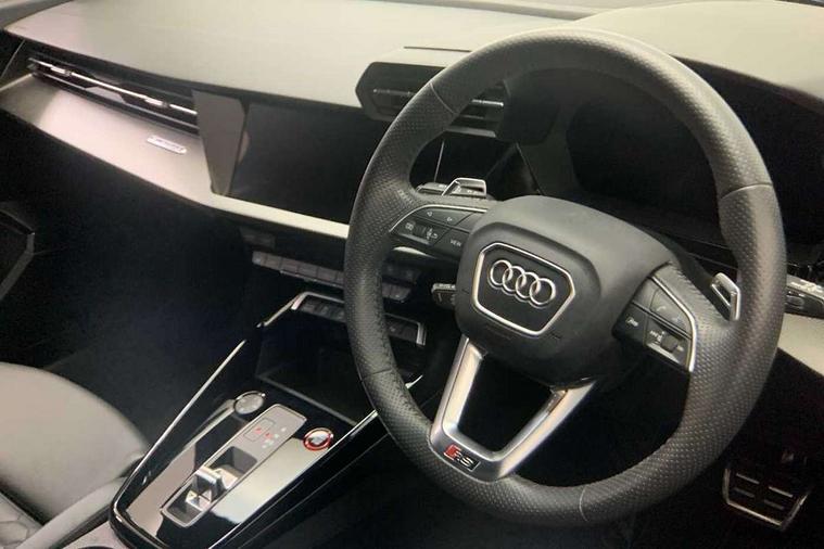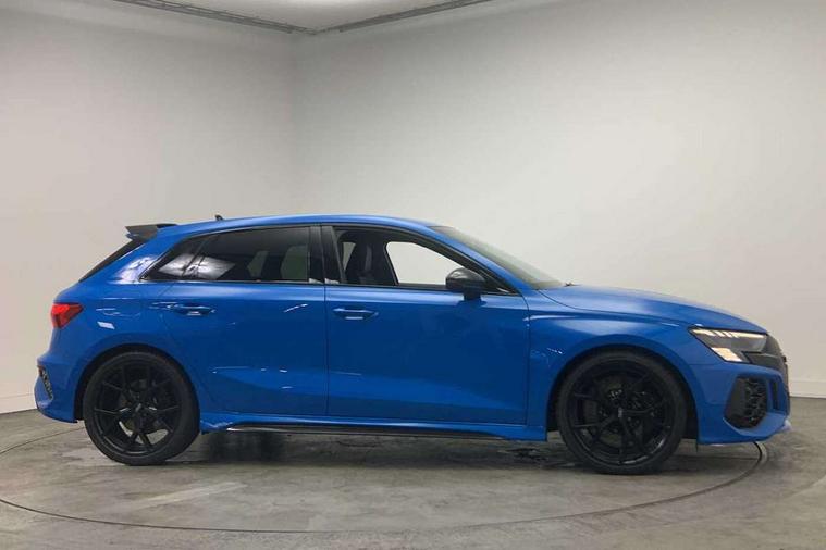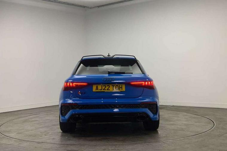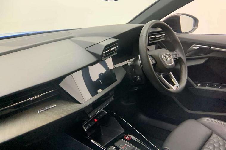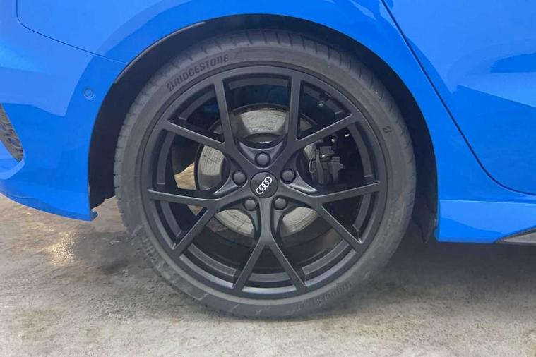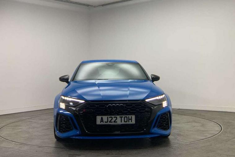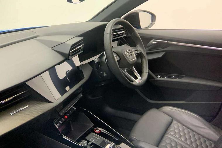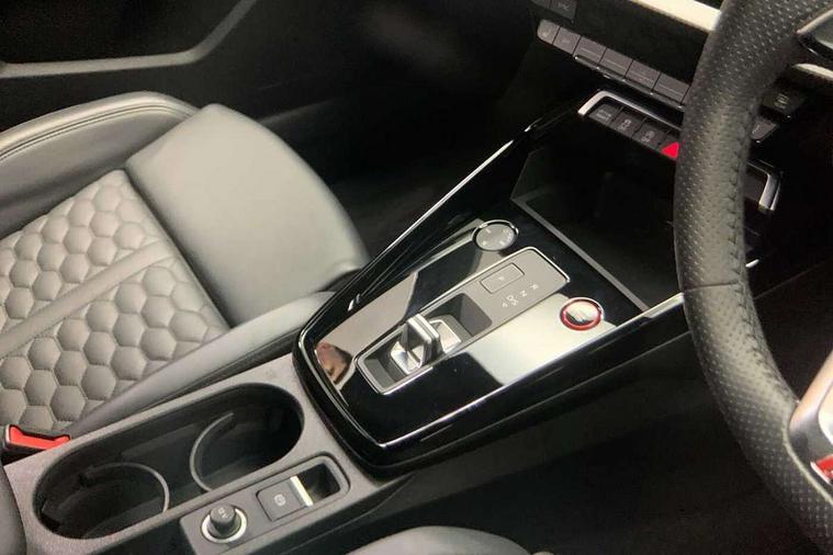Audi smartphone interface, Audi virtual cockpit with RS specific display 12.3" full colour digital instrument cluster, Automatic start/stop system with recuperation, Bluetooth interface, Collision avoidance assistant, Emergency e-call, Lane departure warning system, Legal emergency call, Manual boot opening, Parking assist with parking system plus, Progressive power assisted steering, Quattro permanent four wheel drive, Rear suspension, DAB Digital radio, 3rd brake light, Acoustic glass windscreen, Audi beam uses LEDs to project the Audi sport logo onto the ground as you exit your RS 3, Audi matrix LED headlights, LED rear lights, dynamic front and rear indicators and headlight cleaning system, Auto dimming rear view mirror, Body colour roof, Carbon exterior door mirror, Carbon fibre engine cover, Carbon roof spoiler, Daytime running lights, Door mirrors - electrically adjustable, heated, folding and auto dimming on both sides, Headlight washers, Light and rain sensors, Privacy glass - dark tinted rear and rear side windows from B-pillar backwards, Rear side wing doors, Rear window wiper and washer system, RS exterior features in gloss black, RS sports exhaust system, Side skirt in carbon inlay, 3 seat bench in 2nd row, 40/20/40 split folding rear seat bench, Black cloth headlining, Dual zone electronic climate control, Front and rear headrests, Front centre armrest, Front sports seats RS embossed logo, Front/rear floor mats, Heated front seats, Honeycomb stitching and RS embossing, Illuminated door sill trims inlays in aluminium with RS 3 logo, Illuminated vanity mirror, Manually adjustable front seats, RS emblems, Single front passenger seat, Stainless steel pedals and front footrest in black, Tool kit, Aluminium interior elements pack - RS3, Ambient lighting pack - RS3, MMI navigation plus with MMI touch - RS3, RS bodystyling - RS3, Storage Pack - RS3, 3x3 point rear seat belts, ABS/EBD, ASR, Audi pre sense front, Driver/Front Passenger airbags, EDL, ESC - Electronic Stability Control + traction control, Front passenger airbag deactivation, Front side airbags with head airbags and interaction airbag, Hill hold assist, Seat belt reminder with passenger presence detection in rear, Tyre pressure loss indicator, Warning triangle and first aid kit, Anti theft alarm, Anti-theft wheel bolts, Electronically operated child lock, Remote control central locking, Carbon inlays, accent surfaces in the dashboard and centre console in platinum grey silk effect paint finish, Full decorative carbon trim, 19" 5 Y spoke matt black alloy wheels, Tyre repair kit,