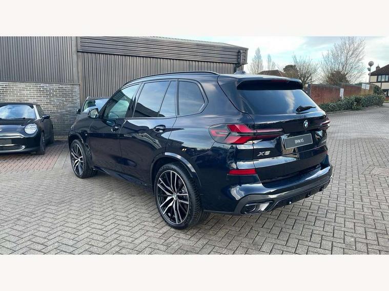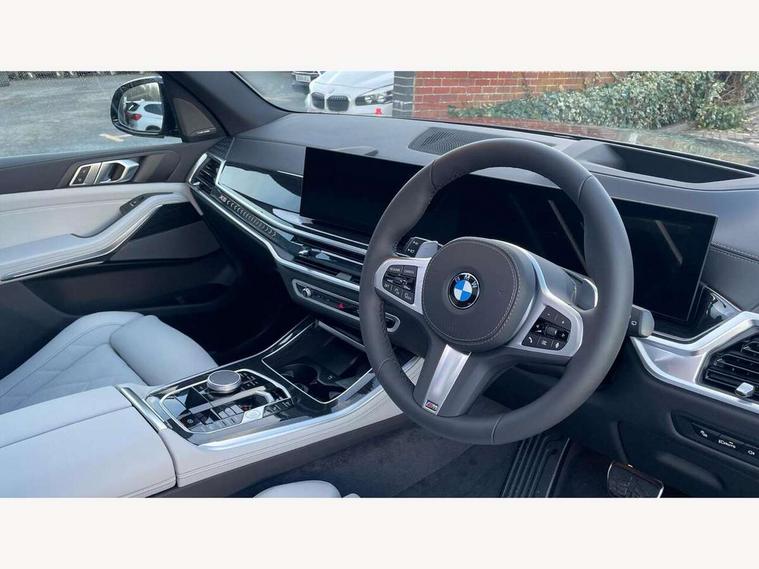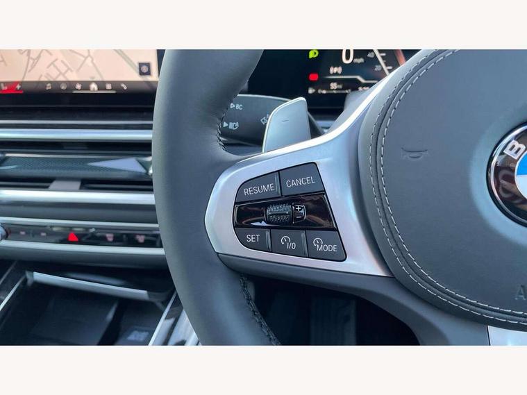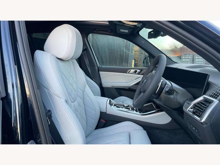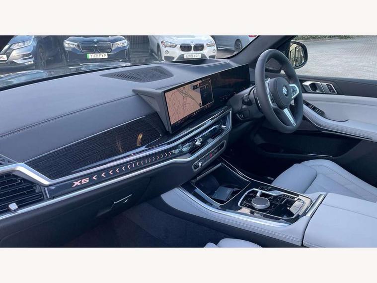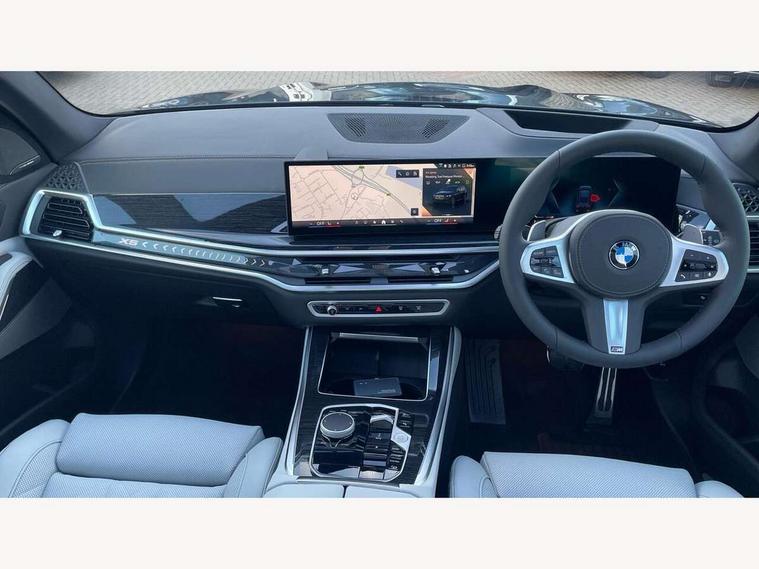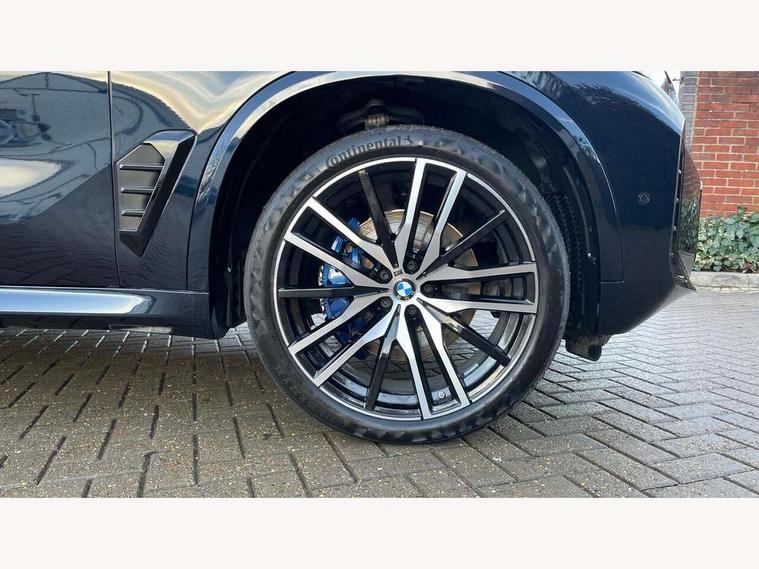 Attentiveness assist, Automatic tailgate operation, BMW ConnectedDrive online services, BMW live cockpit + with curved 12.3 instrument cluster/14.9 central display, nav/Tuner with diversity reception, RDS/4GLTE/remote software upgrade, BMW Recovery system, BMW Teleservices, Condition based service, Cruise control with brake assist, eCall emergency call system, Enhanced bluetooth with wireless charging, Integrated owner's handbook, PAS, Speed limiter, Wi-Fi hotspot, Drive performance control with ECO PRO comfort + sport mode, Eight speed steptronic sport automatic transmission and gearshift paddles on the steering wheel, Adaptive LED Headlights, Front and rear electric windows, High beam assistant, High gloss black shadow line roof rails, LED daytime running lights, Rain sensor, Rear side wing doors, Third brake light in rear spoiler, Variable intermittent rear wash/wipe, 12V - Power sockets with 2x centre console and 1x luggage compartment, 3 seat bench in 2nd row, Entry sills illuminated BMW inscription front and rear, Foldable rear centre armrest with 2 cupholders and storage compartment, Front and rear side armrest integrated into door trim, Grab handles in 1st and 2nd row of seats with Integrated in headliner, at rear with coat hooks, plastic, Headrests for all seats, Luggage compartment separating net, Lumbar support with height and depth adjustment in backrest, Single front passenger seat, Sunvisors with illuminated vanity mirrors and ticket pocket, Three spoke sport M leather steering wheel, Velour floormats, Ambient light interior pack - X5, Driving assistant pack with radar based driver assistance system - X5, Expanded exterior mirror pack - X5/X5 M, M aerodynamics pack - X5, Parking assistant pack - X5, 3 rear seatbelts, Active protection, Airbags - driver/front passenger, rear and side, first and second row seats head airbags, front passenger seat airbag deactivation + knee airbag, Anti-lock braking system (ABS), Automatic Stability Control (ASC), Brake energy regeneration, Cornering brake control (CBC), Crash sensor activating central locking release, hazard warning lights, fuel cut off, interior lighting + activation of safety battery terminal clamp, DSC - Dynamic Stability Control, Dynamic Traction Control - DTC, Electromechanical parking brake with automatic drive away release and auto hold function, Electronic brake force distribution, Hill start assistant, M Sport blue painted brake calipers with 'M' designation, Mechanical child proof lock on rear doors, Tyre pressure monitoring system, Tyre pressure sensors, Ventilated front and rear disc brakes, Warning triangle and first aid kit, Alarm system, Closing system with central locking, Comfort access system, Locking wheel bolts,