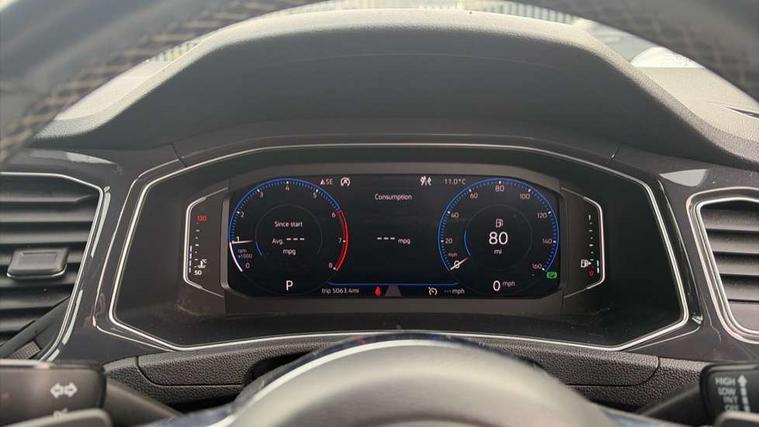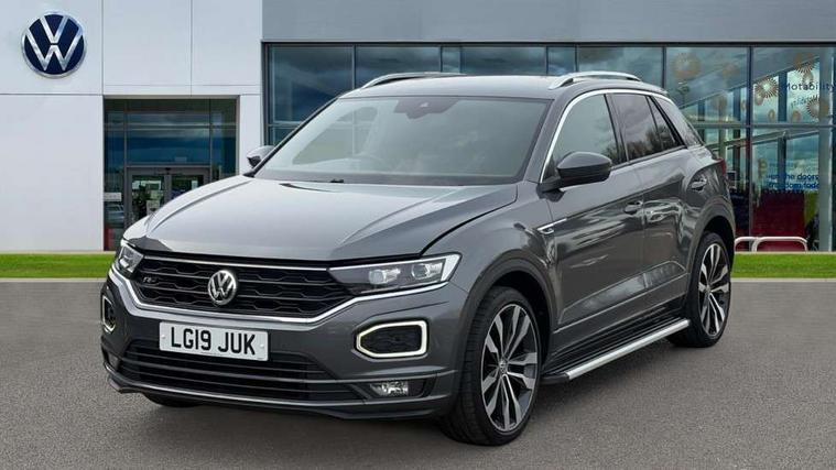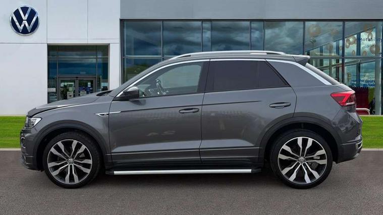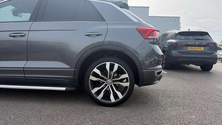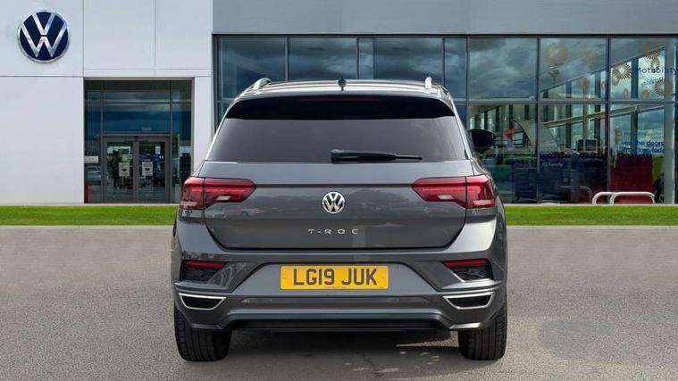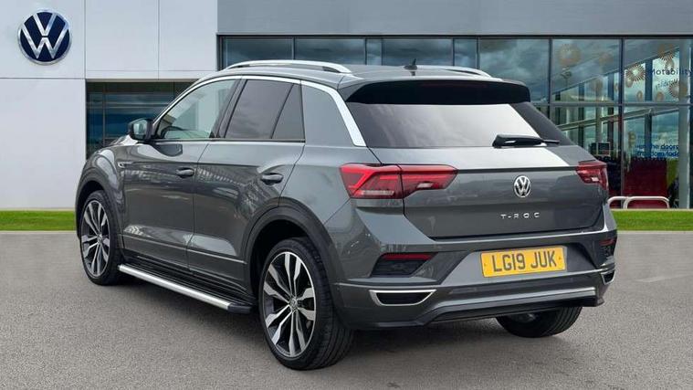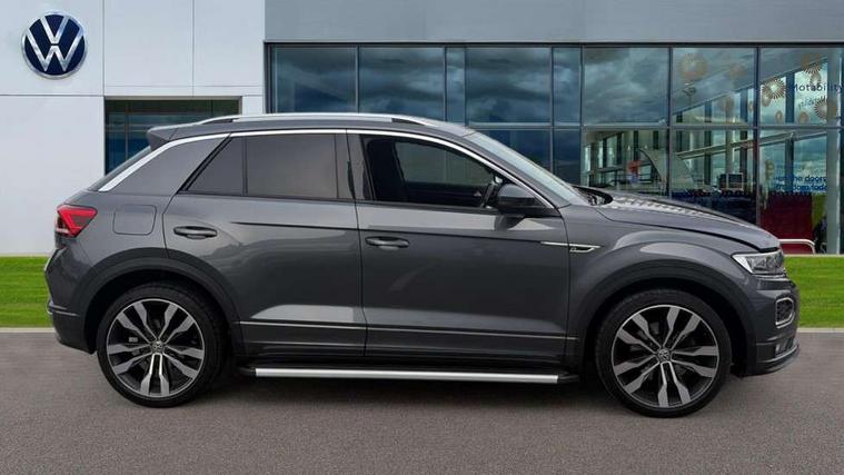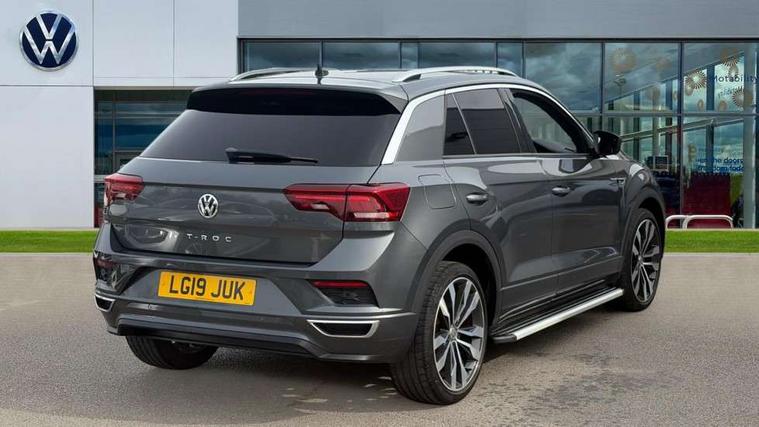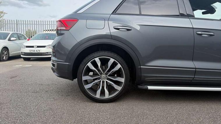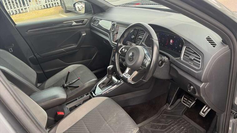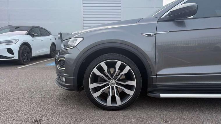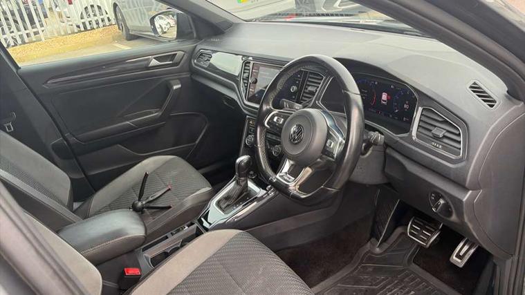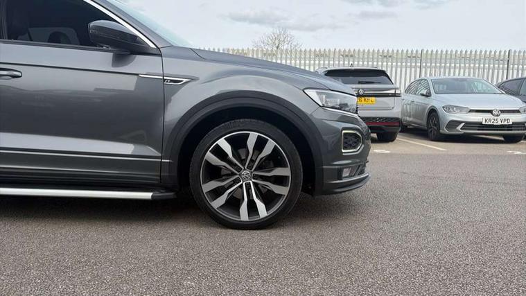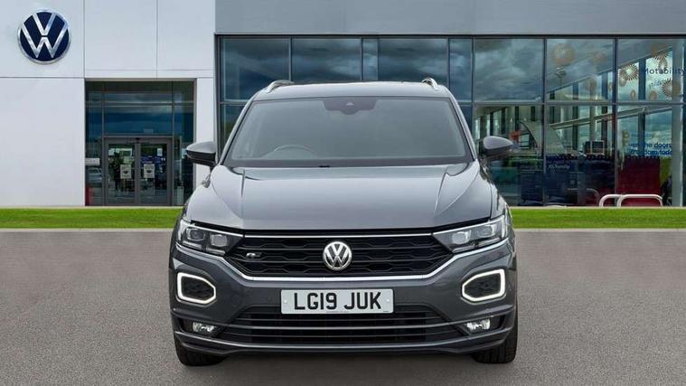 2 USB connection charging sockets, Active Info Display, 10.3" high resolution TFT dash display screen with customised information, Adaptive cruise control, App-Connect, Automatic start/stop system, Bluetooth telephone and audio connection for compatible devices, Car information display, Car-Net Security and Service, Discover navigation, 8" touch screen navigation/infotainment system with Car-Net, European map, CD/radio, 2D/3D map and speed limiter, Driver alert system with audible and visual fatigue detection system, Driver profile selection, Front assist, radar sensor controlled distance monitor, city emergency braking + predictive pedestrian protection, Lane assist, Multifunction computer with visual gear change recommendation for fuel consumption, Progressive power assisted steering, Service interval indicator, Think blue trainer driver tips and journey analysis, Voice activation, Warning sound and light for doors and tailgate open, Warning sound and light for front seatbelts unfastened, Battery regeneration during braking, Bluetooth - Simultaneous pairing of 2 compatible mobile devices, DAB Digital radio, Dynamic navigation based on TMC+, Multi device interface (MDI) with USB connection, Music playback - MP3, WMA and AAC files, Premium USB cable in choice of either Apple or Android smartphone compatibility, SD card slot, SMS functionality - read, compose and send SMS messages using touch-screen display, Three route options - Fast, Short, Eco, Title and cover art display, Auto dimming interior rear view mirror, Automatic hazard lights activation under emergency braking, Black grained lower door protectors, Black grained wheel arches, Body colour door handles, Body colour rear roof spoiler, Chrome effect left and right trapezoid exhaust tailpipe fascia surround, Chrome trim on upper and lower radiator grille, Door mirror integrated indicators, Dusk sensor, Electrically foldable, adjustable and heated door mirrors with puddle lights and reverse activated kerb-view adjustment on passenger's door mirror, Front and rear electric windows, Front fog lights with static cornering function, Front windscreen wiper with intermittent wipe and 4 position delay, Fully galvanised body, Heated rear window, High level 3rd brake light, LED darkened rear light clusters, LED rear number plate lights, Manual coming/automatic leaving home lighting function, Rain sensor, Rear tinted glass from B-pillar backwards approx 65% tinted, Rear windscreen washer and wiper with interval delay, 12V socket in centre console storage area, 2 LED front and rear reading lights, 3 rear head restraints, 4 load lashing points in luggage compartment, Aluminium pedals, Ambient lighting in front footwell and light strips below trim in front doors, Black roof lining and sun visors, Carbon flag cloth upholstery, Climate control - 2 zone electronic air conditioning with automatic air recirculation and allergy filter, Drawer under drivers seat, Front + rear carpet mats, Front centre armrest with storage compartment, longitudinal and height adjustable and two rear air vents, Front cupholders x 2, Front footwell illumination, Front seat back storage pockets, Front sport seats, Glovebox, Height adjustable front seats, Height/reach adjust steering wheel, Illuminated vanity mirrors, Instrument lighting, white adjustable panel illumination, Interior light delay, Isofix easy fit child seat preparation for 2 outer rear seats, Load through provision with single cup holder when folded down, Luggage compartment cover, removable, Luggage compartment lighting, R Line badge, Split folding rear seat backrests with centre armrest, Storage compartment in left and right luggage area, Storage compartment in rear doors, Storage compartments in driver and front passenger doors, Three spoke multi function leather trimmed steering wheel and gear knob including paddle shift, Unique R Line door sill protectors, R line styling pack - T-Roc, Winter pack - T-Roc, 3 rear three point seatbelts, ABS, Driver and front passenger safety-optimised head restraints, Electronic parking brake with auto hold, ESC with EDL, ASR, EDTC and trailer stabilisation function, Front and rear curtain airbags, driver and front passenger airbags with passenger deactivation switch and front side impact airbags, Rigid safety cell with front and rear crumple zones, Three point height adjust front seatbelts + pretensioners, Tyre pressure loss indicator, Ventilated front and rear disc brakes, Volkswagen roadside assistance, Alarm with remote central locking and interior protection, Electronic engine immobiliser, Remote central locking with 2 remote folding keys, Caribou grey decorative inserts in dash and door panel, 19" Suzuka alloy wheels with low rolling resistance tyres and anti wheel bolts, Steel space saver spare wheel,