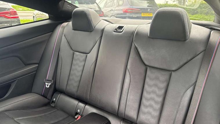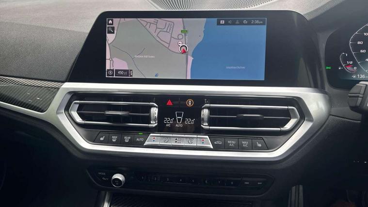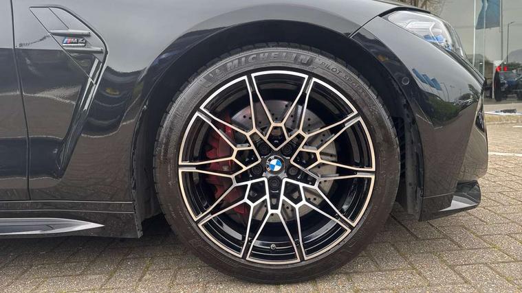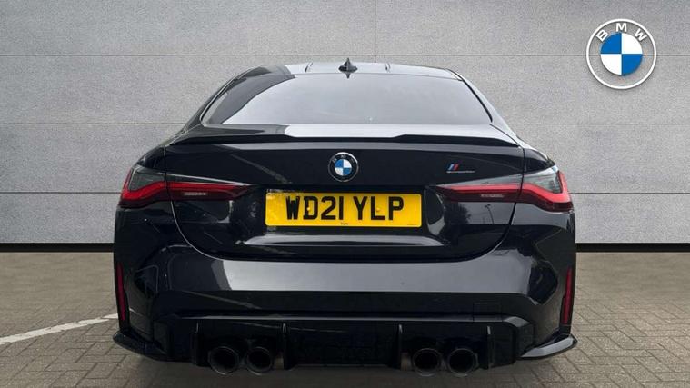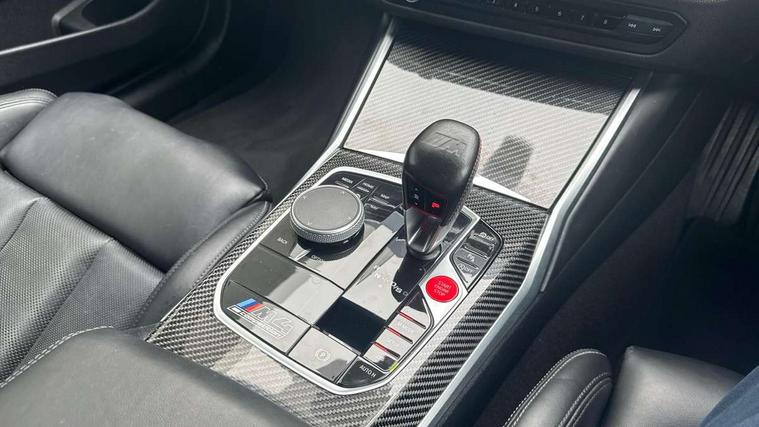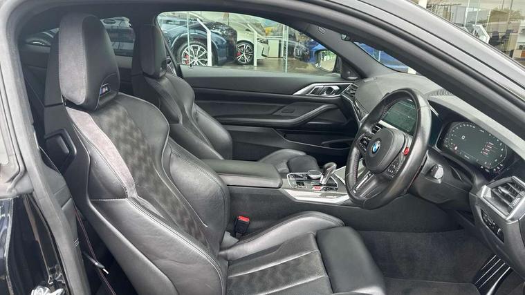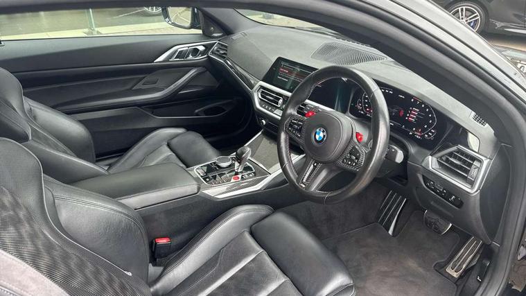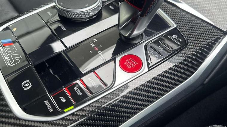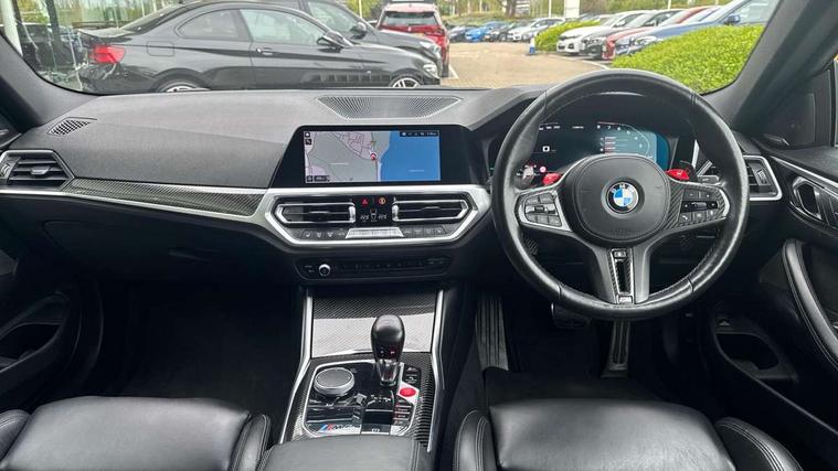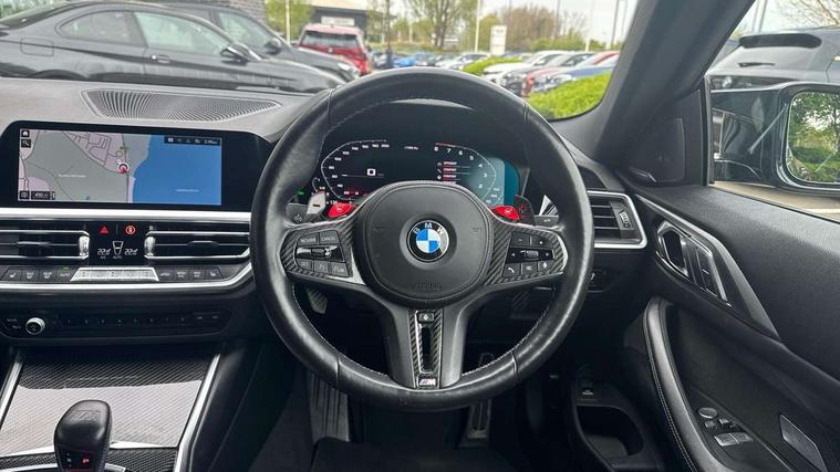 Automatic start/stop system, Bluetooth with USB, BMW gesture control, BMW iDrive controller on centre console, BMW legal emergency call, BMW Live Cockpit Professional sat nav system with 12.3" instrument display and high resolution control display, BMW Online services, BMW Teleservices, Brake pad wear indicator warning light, Door/boot open warning light, Electric Power Steering (EPS) with Servotronic, Head up Display, Instrument cluster with extended contents, Lights on warning, Oil sensor for level and grade, warning by check control system, Oil temperature gauge, On board computer, On board diagnostics, Optimum shift indicator, Outside temperature display, Pull away assistant, Run flat indicator, Service interval indicator, Speed limiter, Adaptive M Sport suspension, M Drive Professional including track mode, laptimer, traction control & Drift analyser, M Sport differential, M steptronic sport transmission with drivelogic, 8 programmable favourite buttons, Auxiliary point for auxiliary devices, BMW professional radio/CD/MP3, DAB Digital radio, Harman/Kardon loudspeaker system, Auto dimming driver's door mirror, Auto dimming rear view mirror, Automatic headlights + automatic windscreen wipers, Black chrome exhaust tailpipes, Black model designation badges, BMW high gloss shadow line with extended contents, BMW Individual shadowline lights, Body colour bumpers, Body colour door handles, Carbon fibre reinforced plastic (CFRP) roof, Day time running light, Door mirror integrated indicators, Door sill finishers with aluminium inserts, Dynamic brake lights, Electric adjustable heated door mirrors, Electric folding door mirrors, Follow me home headlights, Front and rear bumper system, Front electric windows with open and close fingertip control, anti trap facility and comfort closing, Heat protection, sun protection glazing, Heated rear window with automatic switch off, High beam assistant, High gloss black frameless kidney grille with M badge, LED number plate light, LED tail lights with 3D L-shaped LED light design, M designation, Mirror glass aspheric on driver's side, convex on passenger side, Rear fog lights, Rear reflectors, Shark fin roof aerial, Visible VIN plate, Welcome lighting, Windscreen wipers with integrated washing jets, 12V power socket in front centre console with blanking plug, 2 cupholders in front centre console, 2 rear head restraints, 40:20:40 manually split folding rear seat with two tilt positions for backrest, Ambient lighting, Anthracite headlining, Carbon fibre centre console incl. cover for cupholders, Carbon fibre decorative steering wheel finishers, Carbon fibre shift paddles, Carbon fibre strip in instrument panel on front passenger side, Compartment in front of cupholder, Driver/passenger sunvisors with illuminated vanity mirrors + covers, Electric front seats + driver memory, English handbook, Footwell lighting, Front and rear door exit lights, Front door storage bins with bottle holder, Front interior light, Front isofix attachment + airbag deactivation, Front seat backrest width adjustment, Front seats lumbar support, Front/rear door armrests, Gearshift lever with embossed M badge, Heated front seats, Height adjustable front headrests, Interior mirror lighting, Isofix on 2nd row outer seats, Lockable/illuminated glovebox, Luggage compartment lighting, Rake/reach adjustable steering wheel, Storage compartment in rear doors, Storage tray and compartment with cover in centre console, Three zone automatic air conditioning, Toolkit located in luggage compartment, Additional storage compartment pack - M4, Connected package professional - M4, High gloss shadowline exterior trim pack - M4, 4 x 3 point seatbelts, ABS/EBD, Automatic Stability Control (ASC), Brake energy regeneration, Brake fade compensation, Compound structure brake discs, Cornering brake control (CBC), Crash sensor, Driver/Front Passenger airbags, Dry braking, Dynamic brake control, Dynamic Stability Control with M Dynamic mode, Dynamic Traction Control - DTC, Electromechanical parking brake, Front and rear head airbags, Front seat side impact airbags, Front seatbelt pretensioners + load limiters, Hill start assist, M Sport seat belts, Seatbelt warning, Side impact protection, Two tone horn, Tyre pressure sensor, Warning triangle and first aid kit, Electronic immobiliser, Remote central locking, Thatcham cat 1 remote alarm, Vehicle Key with 4 buttons including the integrated key, Galvanic finish to control surrounds, High gloss black interior trim, Tyre repair kit,