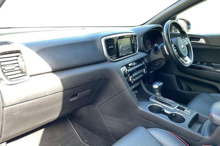 4.2" supervision colour cluster display, 7" touchscreen satellite navigation with European mapping and traffic messaging channel, Android auto with voice control, Apple car play with voice control, Bluetooth connectivity with voice control, Cruise control + speed limiter, Digital clock, Drive mode selector, Driver attention warning, Emergency stop signalling system, Front parking sensor, Kia connected services featuring TomTom live, Lane keep assist, Rear parking sensor, Reversing camera, Speed limit information, Speed sensitive power steering, Trip computer, Windscreen washer level indicator, Intelligent Stop and Go, 6 speaker audio system, Bluetooth audio streaming, DAB Radio with MP3, Rear USB port, Steering wheel mounted audio controls, USB/iPod/auxiliary input connections, All round electric windows with drivers auto up/down function, Auto dimming rear view mirror, Automatic defog system, Automatic headlights, Automatic lighting control, Black wheel arch body mouldings and side sills with dark chrome insert, Body colour door handles with chrome inserts, Body colour door mirrors, Chrome window surround, Cornering light, Dark chrome front bumper insert, Dark chrome grille surround, Dual exhaust pipes, Electrically adjustable/heated/folding door mirrors with LED indicators, Front wiper de-icer, High beam assist, High gloss black blade mesh radiator grille, LED Bi-Function headlights, LED daytime running lights, LED ice cube front fog lights, LED rear lights, Rain sensing front wipers, Rear spoiler, Rear wiper, Roof rails, Shark fin antenna, Silver painted front and rear skid plates, Speed sensitive front wipers, Tinted glass, Trailer stability assist, Welcome and follow-me home light functionality, Wide view drivers door mirror, Windscreen wiper de-icer, 12V power in front and rear centre console, 3 x passenger assist grips, 60/40 split folding rear seat, Air filter, All-round height adjustable headrests, Aluminium door scuff plates, Aluminium pedals, Black headlining, Centre cabin light, Centre console storage box, Chrome boot sill guard, D-Shaped sports leather steering wheel and perforated inserts with GT-Line logo, Door armrest in leather, Driver and front passenger side sunvisors with illuminated vanity mirrors, Driver's seat manual height adjust, Drivers seat power lumbar support, Dual zone automatic air conditioning, Front and rear door storage, Front cabin LED map light with sunglasses case, Front door courtesy reflectors, Front seat and rear pockets, Front/rear centre armrests, Gear shift indicator, Glovebox illumination, Heated front and outer rear seats, Interior door lock/unlock function, ISOFIX Child seat top tethers and anchor fixings, Leather trimmed gearshift, Leather upholstery, Luggage area light, Luggage area load cover, Luggage net with hooks, Paddle shift controls, Perforated leather sports steering wheel, Rear centre armrest with cupholder, Rear coat hooks, Rear headrests, Satin chrome interior door handles, Tilt/telescopic adjustable steering wheel, Ventilation ducts to rear compartment, Active front headrests, All round 3-point seatbelts, Anti-lock braking system with electronic brakeforce distribution, Dual front side airbags, Electronic parking brake, Electronic stability control with downhill brake control, ESP + traction control, Front passenger airbag cut-off switch, Front seatbelt pretensioners + load limiters, Height adjustable front seatbelts, Hill start assist control (HAC), Impact sensing auto door unlocking, Rear door child safety locks, Twin curtain airbags with roll over sensor, Twin front airbags, Tyre pressure monitoring system, Advanced anti-theft system including immobiliser and alarm, Door deadlocks, Engine Start/Stop Button with Smart Entry System, Locking wheel nuts, Speed sensitive auto door locking, Visible vehicle identification number, High gloss black centre fascia, 19" alloy Wheels B-type, Temporary spare wheel,