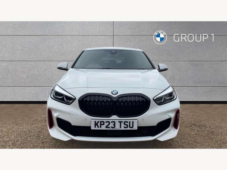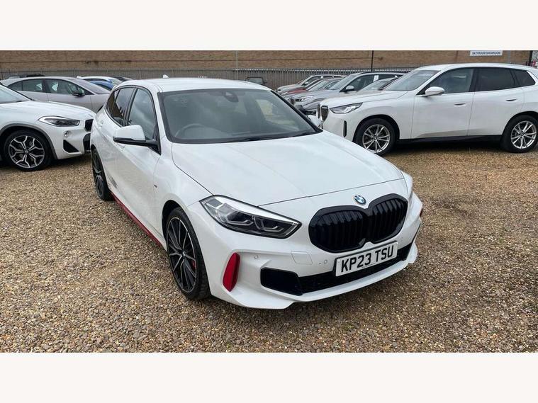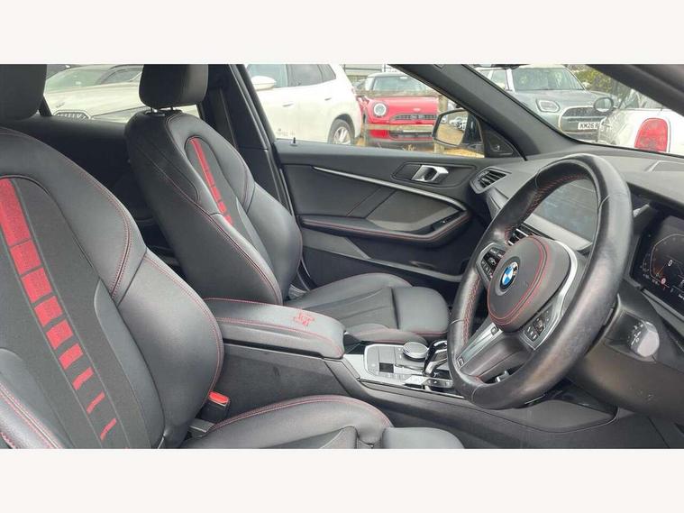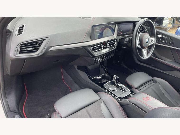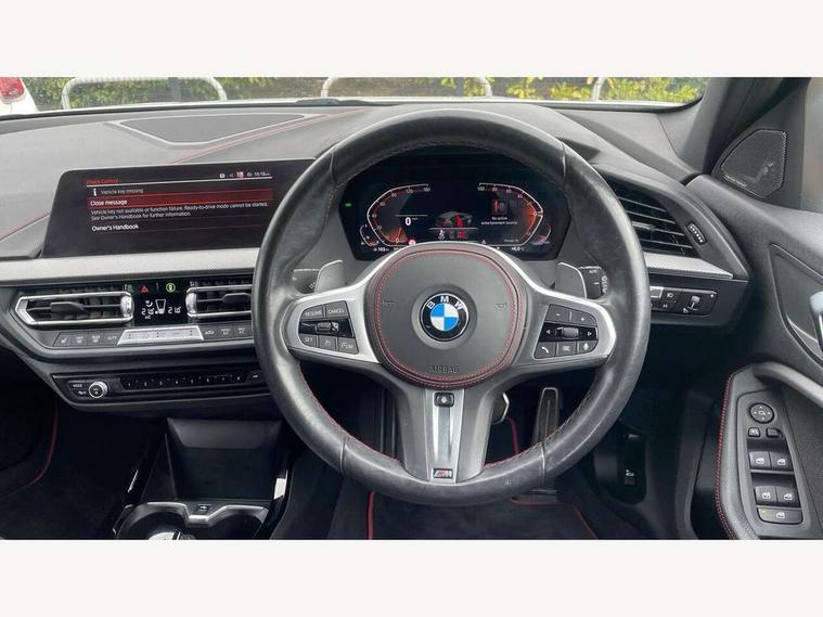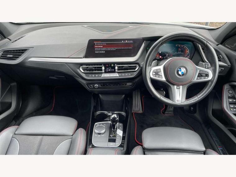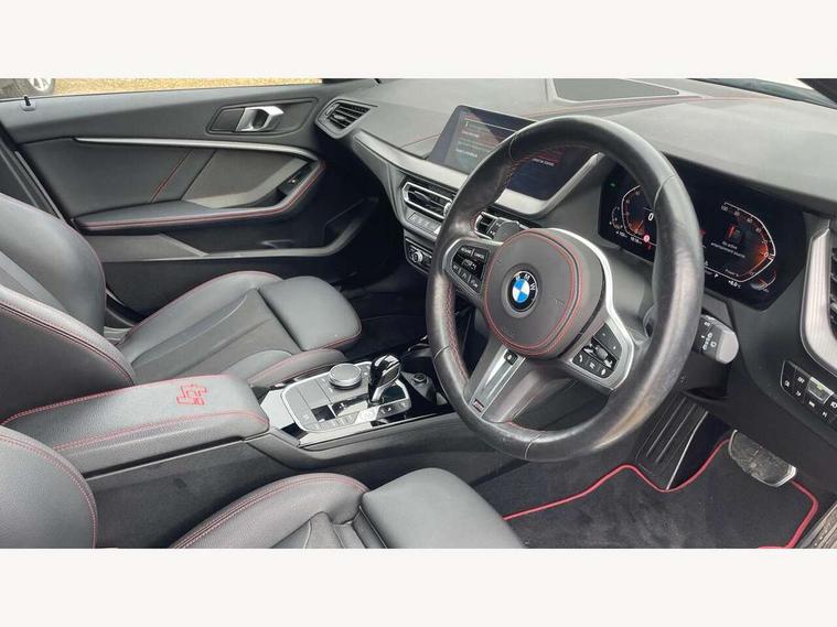 Active guard plus, Attentiveness assist, BMW ConnectedDrive online services, BMW Teleservices, Check Control warning system for monitoring of lights and door/luggage compartment open warning, Cruise control with speed limiter, Eco pro mode, Electric power steering with Servotronic steering optimised at all speed ranges, Front axle single joint with specific axle kinematics to minimise drive influences on steering + provide increased rigidity agile driving behaviour, Integrated owners handbook, Lane departure warning system, Oil sensor for level and grade, On board computer, Optimum shift indicator, Personal Profile, Pull away assistant, Rigidly mounted rear subframe - Multi link construction with separate spring / damper configuration and excellent driving characteristics, Speed limit Info including no-overtaking indicator, Aluminium lightweight construction, Anti roll bar front and rear, Balancer shaft, Double VANOS twin scroll turbocharging system, Drive Performance Control, Eight speed sport automatic transmission with gearshift paddle switches, Electronic differential lock, High precision injection, Larger fuel tank capacity (50 litres), M sport suspension with M128i xDrive specific settings, Petrol Particulate Filter, Twin tube gas filled shock absorbers with degressive characteristic curve, VALVETRONIC engine management, DAB Digital radio, Auto dimming rear view mirror, Automatic headlight beam throw control, Automatic windscreen wipers and automatic headlight, Black chrome tailpipe finishers, BMW individual high gloss shadow line with extended content, Body colour door handles, Body colour mirror caps, Body colour roof trims, Chrome 'M' logo side designation, Chrome kidney grille frame with Satin Aluminium struts, Direction indicator side lights in exterior mirrors, Electrically adjustable exterior mirror with mirror adjustment switch on drivers armrest and aspheric on driver side, convex on passenger side, Fading support, Folding side mirrors with auto dimming/folding wing mirrors with auto dimming, Follow me home headlights, Front and rear bumper system with replaceable deformation elements, Front and rear electric windows with open and close fingertip control, anti trap facility and comfort closing, Front door sill finishers in black plastic with M designation in metallic look, Green tinted heat protection glazing, High gloss shadowline window frame, Recess cover mirror frames and B/C pillar embelisher trim, High level third brake light, Integrated front windscreen with washer jets, Kidney frame and struts in high gloss black extended, LED daytime running lights, LED eyebrow turn indicators, Lightweight engineering, Matt black air guide grilles, Matt black wheel arch trim, Model designation on electric bootlid, Nearside reverse light in rear light cluster, Preparation for high beam assistant, Rear fog lights, Rear side wing doors, Rear window wiper, Shark fin antenna, Trailer stabilisation logic, Visible VIN plate, Welcome lighting, 12V power socket in front centre console with blanking plug, 3 rear seat head restraints, 3 seat bench in 2nd row, Anthracite headlining, Black boot net with lashing eyes, Cargo function on 2nd seat row, Child seat ISOFIX attachment for two outer rear seats and front passenger seat with anchorage points, Conditioned based service, Driver and front passenger backrest net on rear, Driver and front passenger seat heating, Driver side folding compartment in instrument panel, Folding rear clothes hook, Four grab handles integrated in roof lining, Front and rear door pockets with bottle holders, Front and rear side armrest integrated into door trim, Front armrest, Front sports seats, Glove compartment, Height adjustable front head restraints, Luggage compartment for bag hooks on left and right, foldable luggage compartment liner and four lashing eyelets, Manual adjust steering wheel, Multi-function controls for steering wheel, Single front passenger seat, Storage compartment in centre console, Storage compartment in luggage compartment, Stowage of the parcel shelf in luggage compartment trim, Sun visors with vanity mirrors and insert tab, Three spoke M sport design multi function leather steering wheel in unique red stitching, Two front centre console cupholders, Two zone automatic air conditioning, Type C two USB ports in rear centre console, Additional interior lighting pack - 1 Series, BMW live cockpit professional pack- 1 Series, Connected pack professional - 1 Series, Interior lights pack - 1 Series, M Sport exterior styling aerodynamics pack - 1 Series, 2 tone horn, 3 point seatbelts on all seats, front pyrotechnic belt tensioners, stopper and belt force limiters, rear coded belt buckles, Airbags - Front driver/passenger, front and rear curtain head protection, front side, manual deactivation of front passenger airbag, Anti lock braking system (ABS) with brake assist, BMW emergency call, Brake drying, Braking readiness, Child proof locking system in rear door, City braking function, Comfort modes, Cornering brake control, Crash sensor activating of airbags, Unlocking doors, hazard warning lights, interior light, safety battery terminal, Driver and front passenger seat belt security check, Dynamic stability control + (DSC+), Dynamic Traction Control - DTC, Electrically operated hand brake including automatic hold function, Front and rear disc brakes, M Sport brakes with red calipers, M Sport seatbelts, Seatbelt warning, Side impact protection, Tyre pressure monitoring system, Warning triangle and first aid kit, Central locking switch for all doors, fuel filler cap and luggage compartment, Deadlocking function system to all doors, Drive away locking system on all doors and luggage compartment with de-activated in iDrive settings, Locking wheel bolts, Remote control with integrated key with High-gloss Black inlay and M designation and 1 button for open/ close lock, window, open luggage compartment, Start/stop button illuminated in centre console with k