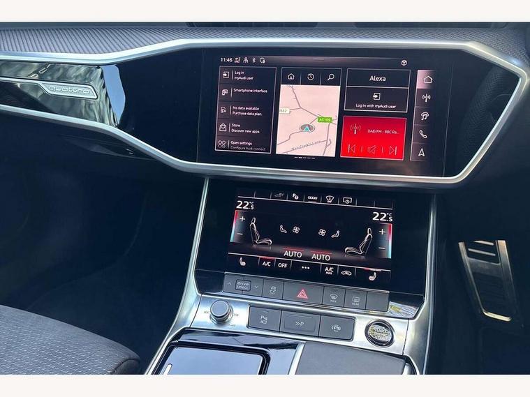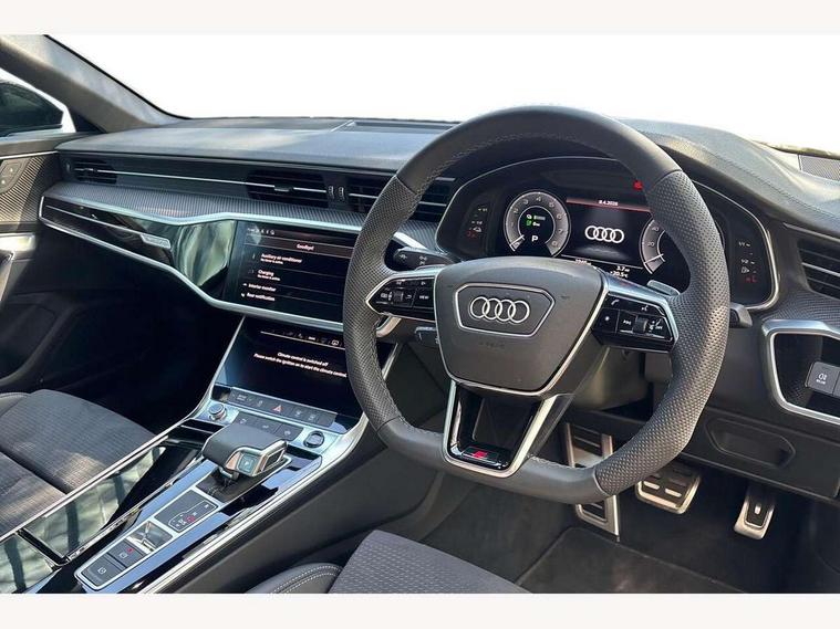 Audi connect safety and service (e-call), Audi connect with Amazon Alexa Integration, Audi drive select, Audi parking system plus - acoustic and visual park assist system for front and rear, Audi virtual cockpit, Automatic start/stop system with coasting functionality, Bluetooth interface, Camera based traffic sign recognition, Electric boot lid release, Lane departure warning system, MMI navigation plus with 10.1" and 8.6" touch screens, Progressive steering, Rear view camera, Service interval indicator, Smartphone interface includes wireless Apple carplay/Android Auto, Voice control system, 3 pin 10 amp domestic charging cable, 52 litre fuel tank, 7.4 kW onboard charger, Compact charging system, Hybrid propulsion system, Industrial connector CEE 32A, 230V, long and straight for the e-tron charging system, Mode 3 charging cable for public charging (AC), Sports suspension, Type 2 socket for AC charging, Audi front music interface, Audi sound system, Auxiliary input socket, DAB Digital radio, USB connection, Audi beam, Electric front/rear windows, Electrically adjustable heated and folding + automatically dimming exterior mirrors with memory function, Frameless auto dimming interior rear view mirror, Front intermittent wipers, Heat insulating darkened glass in side and rear windows, Heat insulating glass in windshield, LED rear lights with dynamic indicators, LED signature front daytime running light, LED third brake light, Matrix LED headlights, Matt black rear diffuser with diffuser strip and tailpipes in chrome, Matt black side air intake grille with inlay in matt aluminium, Omission of output/technology badging, Privacy glass, Radiator grille in anthracite black matt, single frame in chrome and horizontal struts in matt aluminium silver, Rain and light sensors, Rear boot, Rear side wing doors, 4 zone deluxe automatic climate control, 40/20/40 split folding 3 rear seat bench in 3 parts with rear centre armrest, Audi phone box light, Black cloth headlining, Electrically adjustable front seats including seat height, fore/aft position, backrest angle and 4-way lumbar with memory for driver's seat, Front and rear floor mats, Front centre armrest, Front head restraints, Heated front seats, Height/reach adjust steering wheel, Illuminated door sill trims with S logo, Illuminated sun visors with vanity mirrors, Leather gear knob, Rear headrests, Single front passenger seat, Stainless steel pedals and foot rest, Tool kit and car jack, Black styling package plus - A6 Black edition, LED Interior Ambient Lighting Pack - A6, Non smoking pack - A6, S line exterior style pack - A6, 3 point seatbelts on all seats, Airbags - Front side, front and rear including head, Audi pre-sense front, EBD - Electronic brakeforce distribution, Electromechanical parking brake, Electronic Stability Control (ESC) including ABS, ASR and EDL, Extended pedestrian protection measures, ISOFIX child seat mounting for front passenger seat and ISOFIX child seat mounting with Top Tether for outer rear seats, Manual child proof rear door locks, Seatbelt monitoring, Tyre pressure warning light, Warning triangle and first aid kit, Anti theft alarm with tow away protection, Anti-theft wheel bolts and wheel loosening detection, Immobiliser, Keyless Go, Remote central locking, Carbon twill inlays, Tyre repair kit,