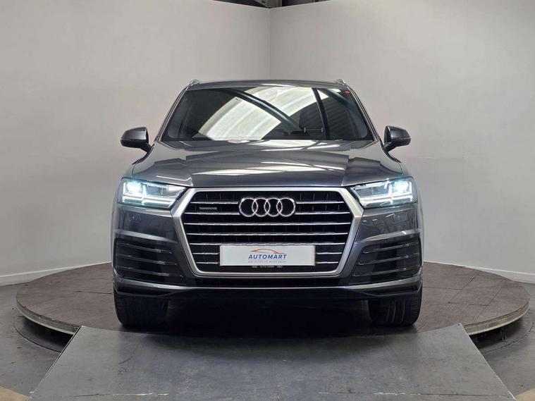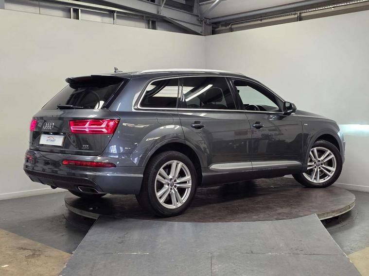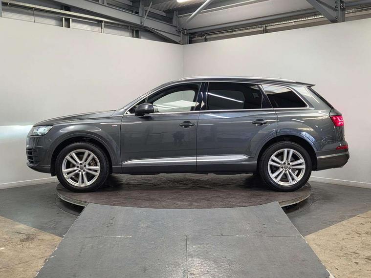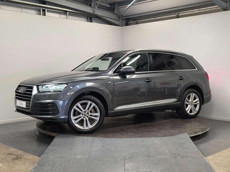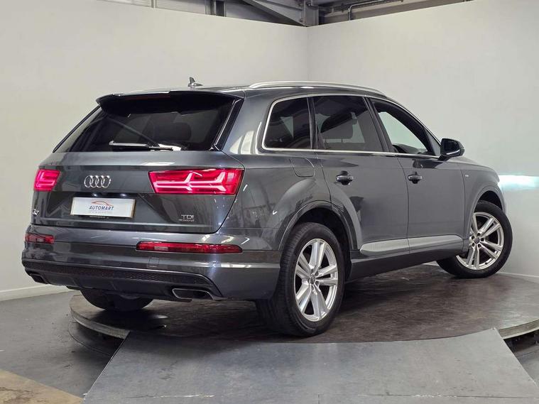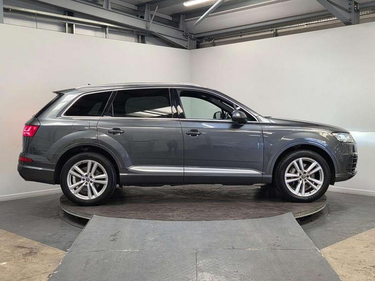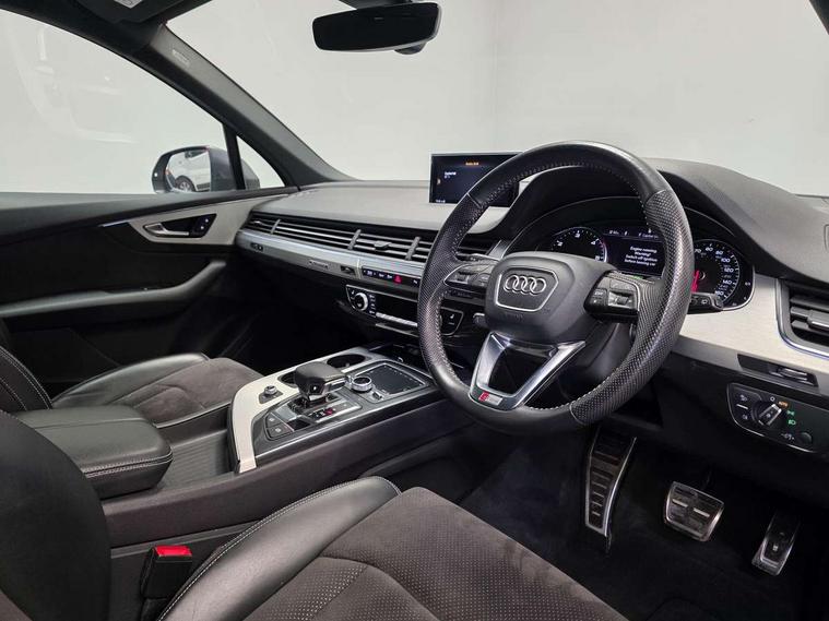 Audi drive select, Audi smartphone interface, MMI - Multi Media Interface control system, MMI navigation plus with touch and 8" colour display, DVD, SD card reader, 10GB music storage, Mobile phone preparation with bluetooth interface, Remote electric boot opening/closing, Service interval indicator, Servotronic speed related PAS, Speed limiter, Voice control system, 2 USB ports, Audi music interface, Aux-in socket, DAB digital radio module, MMI radio plus, Acoustic windscreen, Auto dimming rear view mirror, Body coloured bumpers, Dynamic rear indicators, Electric front+rear windows, Headlight washers, High beam assist, LED daytime running lights, LED tail lights, Loading sill protector in stainless steel, Platinum grey front lip spoiler, Rain and light sensors, Rear wiper, Roof spoiler, S Line body styling, 2 cupholders in front centre console, 35/30/35 split fold 2nd row seats, 4 way electrically adjustable lumbar support for drivers seat, 4 way electrically adjustable lumbar support for front passenger seat, Door sill trims with S line logo, Electric 3rd row 50/50 split/fold, Electric adjustable front seats, Four zone electronic climate control, Front ashtray and cigar lighter, Front centre comfort armrest with storage + cupholders, Front head restraints, Front sports seats, Front/rear floor mats, Gearshift paddles, Heated front seats, ISOFIX on front passenger and rear outer seats, Leather gear knob, Luggage compartment cover, Rear centre armrest with 2 cupholders, Rear headrests, Stainless steel pedals, Sunvisors with illuminated vanity mirrors, Tool kit, Top tether anchor plate for isofix child seat, Interior light pack - Q7, 3 point seatbelts on all seats, ABS+Electronic Brake force Distribution, Curtain airbags, Driver and passenger airbags, EDL + ASR, Electrically operated child locks on rear doors, Electromechanical parking brake, ESP, Front passenger airbag deactivation, Front side airbags, Hill descent control, Hill hold assist, Seatbelt warning, Traction control, Tyre pressure monitoring system, Warning triangle and first aid kit, Alarm with interior monitoring, Immobiliser, Keyless Go access/ignition system, Locking wheel bolts, Remote central locking, Chrome door inserts, Tyre repair kit,