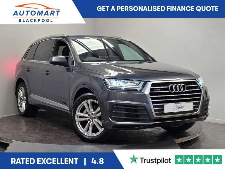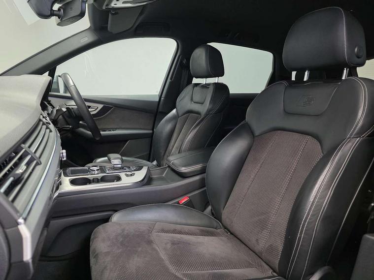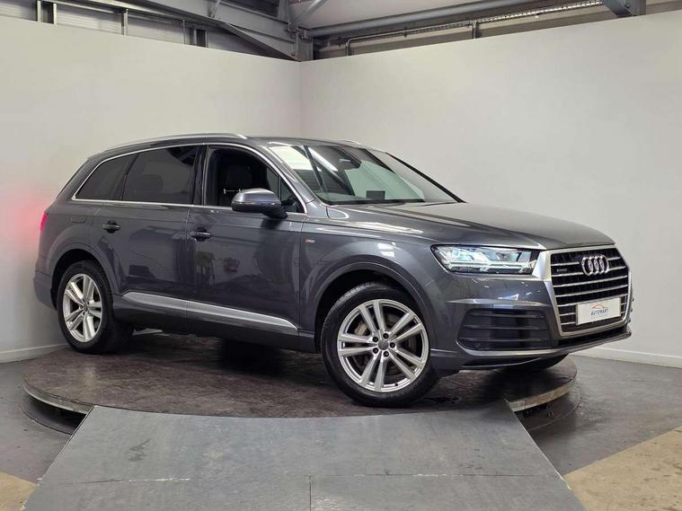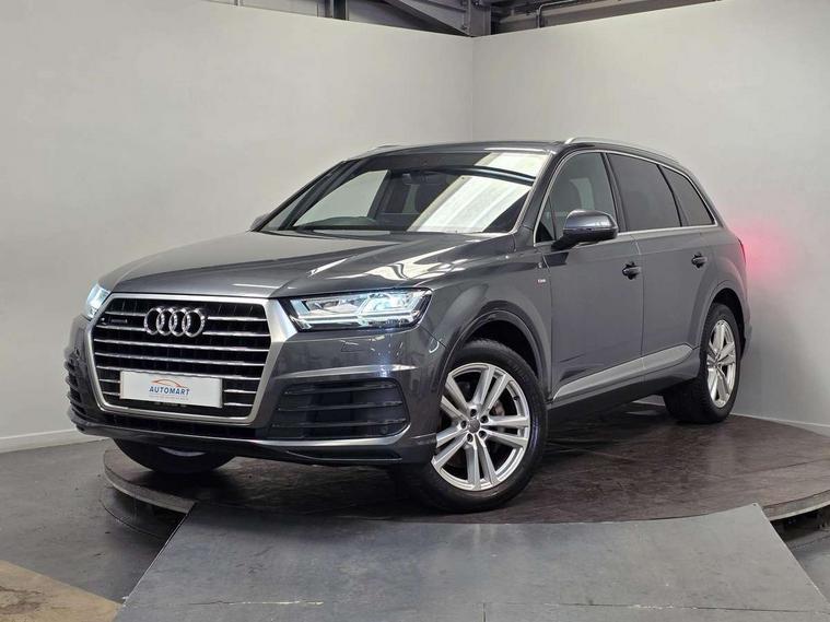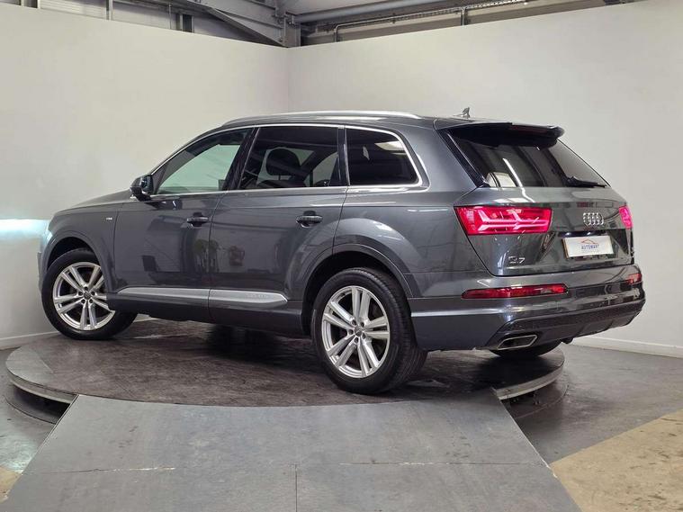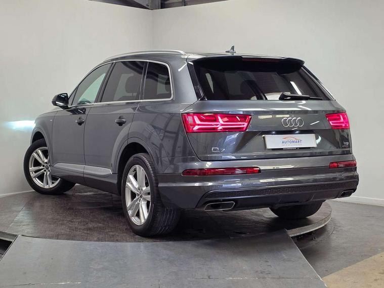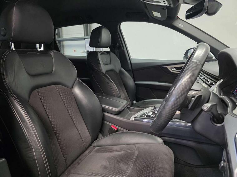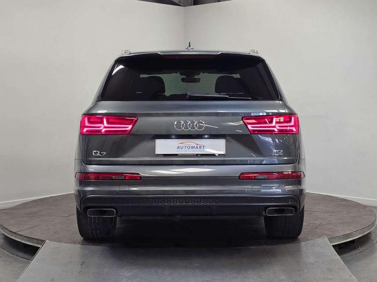 Audi drive select, Audi smartphone interface, MMI - Multi Media Interface control system, MMI navigation plus with touch and 8" colour display, DVD, SD card reader, 10GB music storage, Mobile phone preparation with bluetooth interface, Remote electric boot opening/closing, Service interval indicator, Servotronic speed related PAS, Speed limiter, Voice control system, 2 USB ports, Audi music interface, Aux-in socket, DAB digital radio module, MMI radio plus, Acoustic windscreen, Auto dimming rear view mirror, Body coloured bumpers, Dynamic rear indicators, Electric front+rear windows, Headlight washers, High beam assist, LED daytime running lights, LED tail lights, Loading sill protector in stainless steel, Platinum grey front lip spoiler, Rain and light sensors, Rear wiper, Roof spoiler, S Line body styling, 2 cupholders in front centre console, 35/30/35 split fold 2nd row seats, 4 way electrically adjustable lumbar support for drivers seat, 4 way electrically adjustable lumbar support for front passenger seat, Door sill trims with S line logo, Electric 3rd row 50/50 split/fold, Electric adjustable front seats, Four zone electronic climate control, Front ashtray and cigar lighter, Front centre comfort armrest with storage + cupholders, Front head restraints, Front sports seats, Front/rear floor mats, Gearshift paddles, Heated front seats, ISOFIX on front passenger and rear outer seats, Leather gear knob, Luggage compartment cover, Rear centre armrest with 2 cupholders, Rear headrests, Stainless steel pedals, Sunvisors with illuminated vanity mirrors, Tool kit, Top tether anchor plate for isofix child seat, Interior light pack - Q7, 3 point seatbelts on all seats, ABS+Electronic Brake force Distribution, Curtain airbags, Driver and passenger airbags, EDL + ASR, Electrically operated child locks on rear doors, Electromechanical parking brake, ESP, Front passenger airbag deactivation, Front side airbags, Hill descent control, Hill hold assist, Seatbelt warning, Traction control, Tyre pressure monitoring system, Warning triangle and first aid kit, Alarm with interior monitoring, Immobiliser, Keyless Go access/ignition system, Locking wheel bolts, Remote central locking, Chrome door inserts, Tyre repair kit,