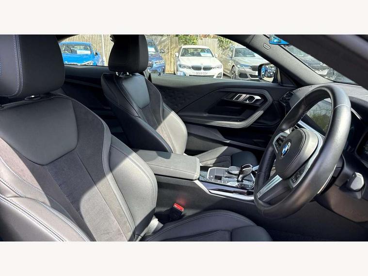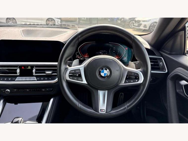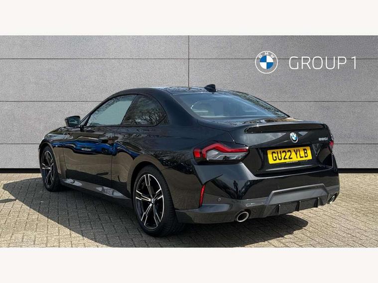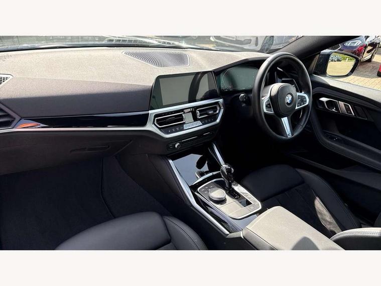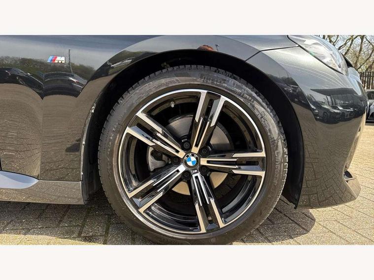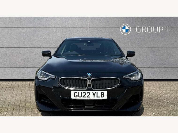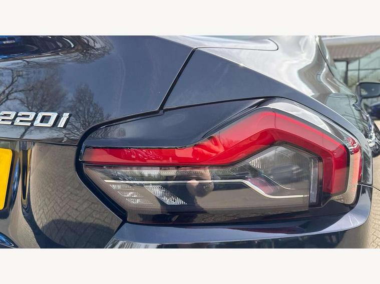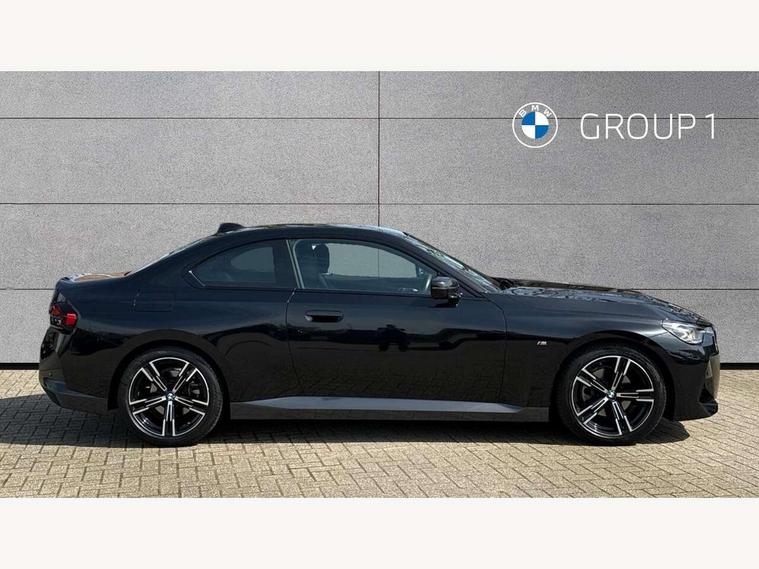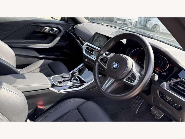 Attentiveness assist, Auto start-stop, Bluetooth, BMW ConnectedDrive online services, BMW Teleservices, Check Control warning system for monitoring of lights and door/luggage compartment open warning, Direct selection buttons, Drive off assistant, Eco pro mode, Electric power steering, Front/rear Parking distance control, iDrive controller with turn and press function, Integrated owners handbook, Intelligent functions, Live cockpit plus with nav function 12.3" instrument cluster and 14.9" centre display, Oil sensor for level and grade, Optimum shift indicator, Personal Profile, Touch operation on control display, Variable sport steering, Widescreen multi-media display, Aluminium lightweight construction, Balancer shaft, BMW TwinPower Turbo four-cylinder petrol engine, Double VANOS, Drive performance control with ECO PRO comfort + sport mode, Electronic differential lock, High precision injection, M sport suspension, Petrol Particulate Filter, Sport automatic steptronic transmission with gearshift paddles, manual gearshift time display, launch control, coasting idle ECO PRO/COMFORT modes, Twin scroll turbocharger with Valvetronic, DAB tuner, Acoustic windscreen wipers for reduced driving noise, Adaptive LED Headlights, Automatic windscreen wipers and automatic headlight, Automatically dimming rear view mirror, Body colour door handles flush with door surface, Body colour door mirrors, Body colour front and rear bumpers, Daytime running lights, Electric windows - front and rear, with open/close fingertip control and trap release, Exhaust tailpipes x2 - 90mm in left and right, Fading support, Front and rear bumper system with replaceable deformation elements, Front door sill finishers in black plastic with BMW designation, Front windscreen wipers with integrated washer jets, Green tinted heat protection glazing, High beam assistant, High gloss shadowline exterior trim in mirror triangle cover, mirror cover panel, mirror bezel and window border, High level third brake light, Indicators integrated int mirror housing, LED registration plate light, LED technology rear tail lights, brake lights and turn indicators, Lightweight engineering, Model designation on right side of tailgate, One piece kidney grille with hight gloss chrome surround, Rear boot, Rear fog lights, Reversing light in rear light cluster, Shark fin antenna, Single part LED rear lights with smoked glass components, Trailer stabilisation logic, Visible VIN plate, 12V power socket in front centre console with blanking plug, 2 cupholders in front centre console, 3 zone automatic air conditioning, Ambient lighting, Compartment in front of cupholder, Conditioned based service, Driver seat backrest width adjustment, Front and rear side armrests integrated into door trim, Front armrest, Front door pockets, Front head restraints, Front sport seats, Heated front seats, Illuminated glove compartment with separate small compartment, M headliner Anthracite, M sport leather steering wheel, Manually adjustment steering wheel column, Rear seat backrest with manual 40:20:40 split folding, Rear seat centre foldable armrest with integrated cup holder, Single front passenger seat, Storage compartment between rear seats, Storage tray and compartment with cover in centre console, Sun visors with vanity mirrors and insert tab, Through loading system with 40/20/40 split folding 2 rear seat in 2nd row, Two folding rear seat headrests, Velour floor mats, Additional storage compartment pack without USB - 2 Series Coupe, Connected pack professional - 2 Series Coupe, Interior and exterior mirror pack - 2 Series Coupe, M Sport exterior styling aerodynamics pack - 2 Series Coupe, 2 tone horn, Anti lock braking system (ABS) with cornering brake control, Automatic Stability Control (ASC), BMW emergency call, Brake drying, Child seat ISOFIX attachment for the two outer rear seats, Crash sensor activating of airbags, Unlocking doors, hazard warning lights, interior light, safety battery terminal, Deactivation of fuel pump in the event of a crash, Driver and front passenger airbags, Driver and front passenger side airbags, integrated in the door side seat backrest bolsters for all seat variants, Dynamic brake control, Dynamic stability control + (DSC+), Dynamic Traction Control - DTC, Electrically operated hand brake including automatic hold function and automatic release when driving off, Front and rear disc brakes, Front passenger airbag deactivation, Head airbags for all 4 outer seats, Manual deactivation of front passenger airbag, Seat belt security check for driver and front passenger, Seatbelt warning, Side impact protection, Three point seat belts on 4 seats including front belt stopper, pyrotechnic belt tensioners and belt force limiters, Tyre pressure sensor, Warning triangle and first aid kit, Alarm system (Thatcham 1) with remote control and electronic engine immobiliser, Central locking switch for all doors, fuel filler cap and luggage compartment, Deadlocking function system to all doors, Drive away locking system on all doors and luggage compartment, Locking wheel bolts, Start/Stop button (illuminated) in centre console with keyless engine start and Auto Start-Stop deactivation button, Two remote control key with integrated key - one button for open and close doors/fuel flap/tailgate and separate button for unlock luggage compartment, BMW mobility tyre sealing system, Electrically powered 12V compressor, Reduced rolling resistance tyres,