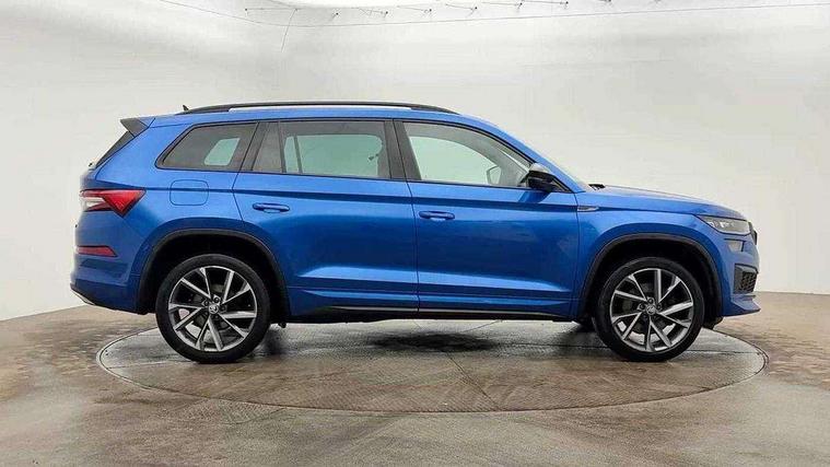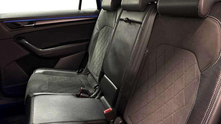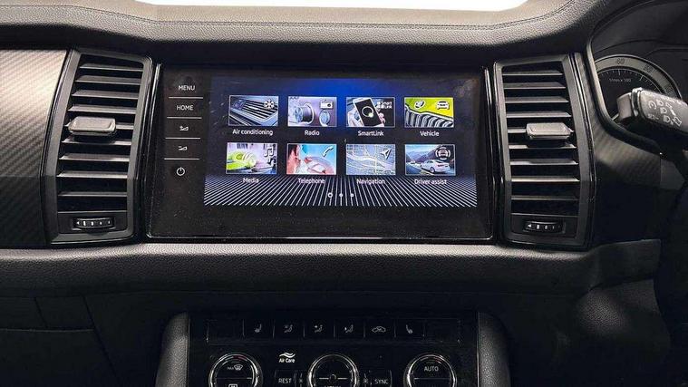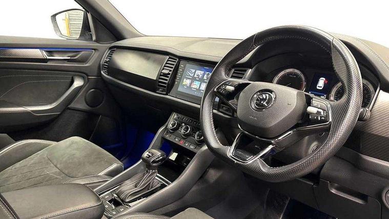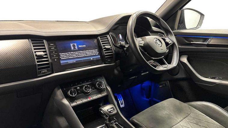 Bluetooth system, Columbus satellite navigation with 9.2" touchscreen, integrated Wi-Fi, web radio, Digital voice enhancement, E-call, ECO Stop/start function, Exterior temperature indicator, Progressive steering, Rear view camera, Smartlink wireless for apple carplay and wired for android auto, Speed limiter, USB C Port x 2 in front centre console, Wireless charging, 8 speakers, DAB Digital radio, Aero front windscreen wipers with intermittent function, Aero rear window wiper, Auto dimming rear view mirror, Black roof rails, Black sports styling including front grille and window surrounds, Black wheel arch surrounds, Body colour bumpers, Body colour door handles, Electric adjustable/heated/folding door mirrors, driver side auto dimming with boarding sports and memory function, Electric front and rear windows, Extended rear spoiler with finlets in gloss black, Front fog lights, Full LED matrix headlights with AFS (adaptive front light system), cornering function and AWL (all weather lighting system), Gloss black door mirrors, Headlight washers, Heated rear window, Invisible tailpipe, LED daytime running lights, LED rear fog light, LED third brake light in rear spoiler, Light assistant (coming/leaving home/tunnel light), Off-road style lower front bumper element, Privacy glass, Rain and light sensors, Rear diffuser, Rear LED lights (high functionality) with welcome effect and dynamic indicators, Rear side wing doors, Safety reflectors on front and rear doors, Sportline badge on front fender, Sports front and rear bumpers including lower rear chrome strip, Tailgate lettering in Black, Window control switches with black trim, Without engine designation, 12V socket in boot, 2 rails with 2 hooks, 2 seat bench in 3rd row, 3 seat bench in 2nd row, 4 foldable roof handles with rear coat hooks, 60:40 foldable rear seat with sliding adjustment and backrest angle adjustment, Aluminium pedals, Black roof headlining, Bottle holders in door panel in the 1.5 litre front and 1 litre rear, Cargo storage compartments, Chrome headlight control button, Chrome interior door handles, Coat hooks on B pillar, Covered storage compartment on driver side, Front centre armrest with storage compartment, cup holder and 12V socket, Front courtesy lights, Gear shift lever with chrome frame and black gloss insert, Grey stitching in front and rear armrests and door armrests + door inserts, Height adjustable front headrests, Illuminated and cooled glovebox, Illuminated luggage compartment, Isofix child seat fittings in outer rear seats with top tether, Manually adjustable steering column, Microsuede door panels, Net programme in boot (1x horizontal Net, 2x vertical Nets), Overhead glasses storage compartment, Pollen filter, Rear centre armrest with cupholders, Single front passenger seat, Sliding trunk cover, Small Bags on the inner sides of the front backrests, Sports seats, Sunvisors with illuminated vanity mirrors, Three rear height adjustable headrests, Ticket holder on A Pillar, Umbrella in door panel, Variable boot floor, LED Interior light pack - Kodiaq, Auto door release and activation of warning lights, Child locks on rear doors, Driver and front passenger airbag with knee airbag and front passenger airbag deactivation, Electronic parking brake with hill start assist, Emergency rear braking signal, ESC (incl. ABS+MSR+ASR+EDS+HBA+DSR+RBS+MKB), Front assist with autonomous emergency braking, Front side airbags with curtain airbags, Fuel cut off safety device, Height adjustable front 3 point seatbelts + pretensioners, Hill hold control, Rear disc brakes, Safety vest holder in door, Seat belt reminder for all seats, Tailgate unlocking from outside, Three point rear seat belts, Two tone horn, Tyre pressure monitor, Alarm with interior monitoring and tilt sensor with safe function, Anti-theft wheel bolts, Immobiliser, Keyless entry and start system (KESSY), Remote central locking with 2 keys, Black air vent surround, Carbon finish dashboard and door inserts, Grey stitching in dashboard, 20" Vega Anthracite alloy wheels, Temporary spare wheel (space saver),