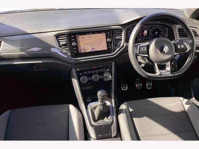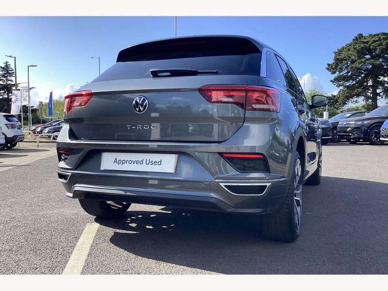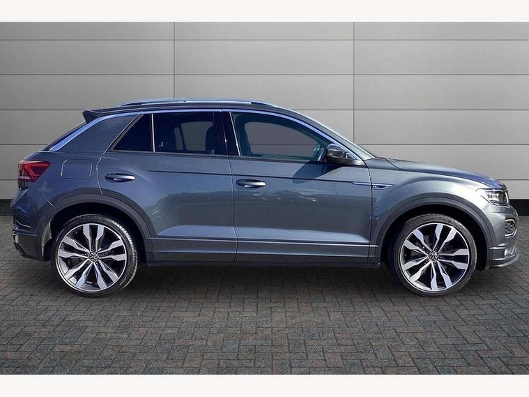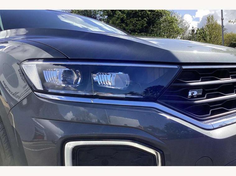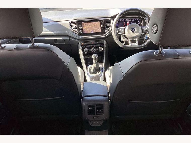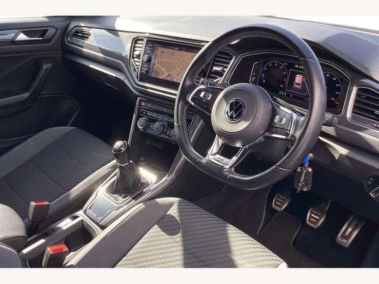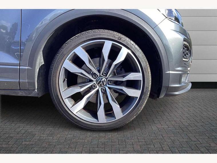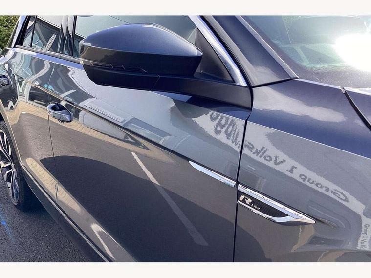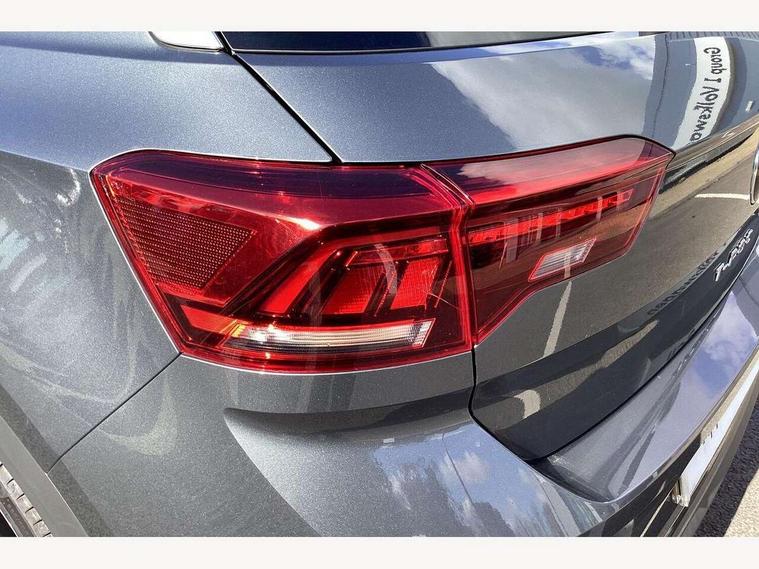 'Lights On' Reminder warning buzzer, Adaptive cruise control, Bluetooth telephone and audio connection for compatible devices, Car information display, Digital Cockpit Pro - Active info display, Driver alert system with audible and visual fatigue detection system, Driver tips and journey analysis, Dusk sensor, Emergency call service, Lane assist with warning text instrument cluster, Modified key software - reduce switch off time for key status change to Long no motion, Multifunction camera, Multifunction computer with visual gear change recommendation for fuel consumption, Navigation system discover media including streaming and internet, Service interval indicator, Think blue trainer driver tips and journey analysis, Traffic sign recognition, Voice activation, Warning sound and light for front seatbelts unfastened, Wireless app connect for apple carPlay, Battery regeneration during braking, Rear shock absorption for sports version, Start/stop function with battery regeneration, DAB Digital radio, Disk brakes in front, Diversity antenna for FM reception, Music playback - MP3, WMA and AAC files, Premium USB cable in choice of either Apple or Android smartphone compatibility, SD card slot, Simultaneous pairing of 2 compatible mobile devices, SMS functionality - read, compose and send SMS messages using touch-screen display, Storage compartment with longitudinal and height adjustable in armrest and two rear air vents, Three route options - Fast, Short, Eco, Title and cover art display, USB-C Interface and USB charging socket, Auto dimming interior rear view mirror, Automatic coming/leaving home lighting function and daytime running lights, Automatic hazard lights activation under emergency braking, Black grained lower door protectors, Body colored door lower parts, Body colour door handles, Body colour rear roof spoiler, Chrome effect left and right trapezoid exhaust tailpipe fascia surround, Chrome plated moldings, Chrome plated radiator grille inserts, air vent surrounds and light switch surrounds, Chrome trim on upper and lower radiator grille, Dynamic headlight range control with self adjusting whilst driving, Electrically foldable, adjustable and heated door mirrors with puddle lights and reverse activated kerb-view adjustment on passenger's door mirror, External USB type C socket and charging sockets, Front and rear electric windows, Front fog lights with static cornering function, Front windscreen wiper with intermittent wipe and 4 position delay, Fully galvanised body, Heated rear window, Heated windscreen washer jets, High level 3rd brake light, LED darkened rear light clusters, LED headlamps with automatic range adjustment and unique signature LED separate daytime running lights, LED rear number plate lights, LED tail lamp rear comination lamps, Privacy glass, R-Line design body coloured bumpers, Rain sensor, Rear tinted glass from B-pillar backwards approx 65% tinted, Rear wash/wipe with intermittent wipe setting, Silver anodised roof rails, Volkswagen roundel, 12V socket in centre console storage area, 3 rear head restraints, 4 load lashing points in luggage compartment, Aluminium pedals, Black roof lining and sun visors, Branded points of interest, Carbon flag cloth upholstery, Climate control - 2 zone electronic air conditioning with automatic air recirculation and allergy filter, Door and side trim panel, Door and side trim panel in foam film, insert in leatherette, Drawer under drivers seat, Front + rear carpet mats, Front centre armrest, Front cupholders x 2, Front seat back storage pockets, Front sports seats with R-Line logo on seat backrest, Glovebox, Heated front seats, Height adjustable front seats, Height/reach adjust steering wheel, Instrument lighting, white adjustable panel illumination, Interior light delay, Interior light in footwell, Isofix easy fit child seat preparation for 2 outer rear seats, LED interior light with switch off delay/dimmer and 2 front/rear LED reading lights, Load through provision with single cup holder when folded down, Luggage compartment cover, removable, Luggage compartment lighting, R Line badge, Scuff plates in door apertures, Split folding rear seat backrests with centre armrest, Stainless steel pedals, Storage compartment in left and right luggage area, Storage compartment in rear doors, Storage compartments in driver and front passenger doors, Sunvisors with illuminated vanity mirrors, Three spoke multi-function leather trimmed steering wheel and gearknob, Unique R Line door sill protectors, White ambient lighting, R line styling pack - T-Roc, Winter pack - T-Roc, 3 rear three point seatbelts, ABS, Curtain airbags, Driver and front passenger safety-optimised head restraints, Drivers and front passengers airbags with passengers deactivation switch, Drivers seatbelt reminder, Electronic parking brake with auto hold, Electronic stability control (ESC) includes ASR, EDL, EDTC and trailer stabilisation function, Front assist with city emergency braking and pedestrian monitoring, Front seat side impact airbags, Hill start assist, Predictive pedestrian protection, Rigid safety cell with front and rear crumple zones, Single tone horn, Three point height adjust front seatbelts + pretensioners, Tyre pressure loss indicator, Ventilated front and rear disc brakes, Volkswagen roadside assistance, Alarm with remote central locking and interior protection, Electronic engine immobiliser, Remote central locking with SAFELOCK, radio remote control with 2 remote control folding keys, Shadow grey decorative inserts in dash, centre console and door panel, 19" Suzuka alloy wheels with low rolling resistance tyres and anti wheel bolts,
