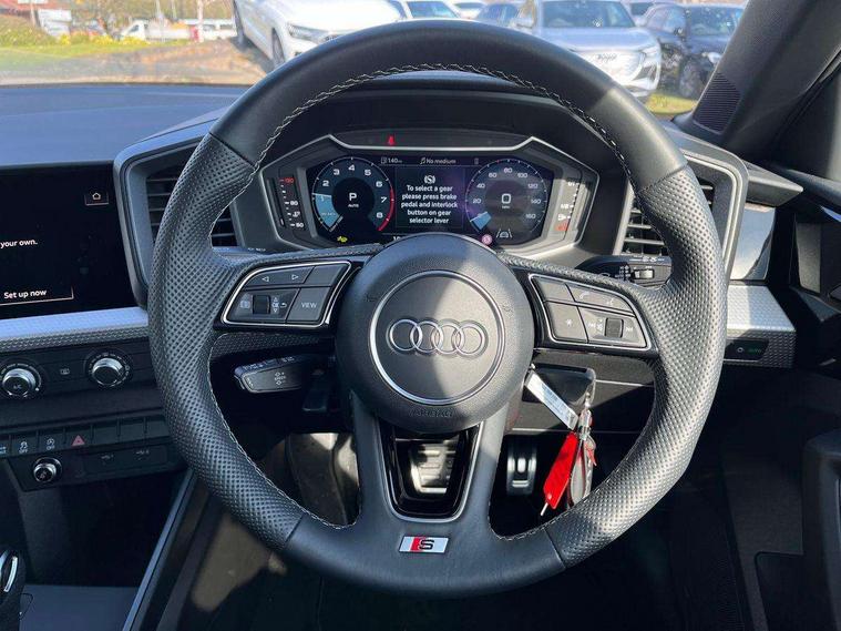 10.25" Digital instrument cluster display classis style instrument dials + speed, odometer, time, outside temperature, telephone menu + fuel level warning, Advanced driver attention and drowsiness monitor, Audi connect emergency call and service, Audi drive select, Audi remote connect and control, Bluetooth interface, Camera based traffic sign recognition, Cruise control, Driver's information system, Electromechanical power steering, Lane departure warning system, Rear parking sensor, Service interval indicator, Smartphone interface, Speed limiter, Start stop system with recuperation, Voice control system, Washer fluid level indicator, Sports suspension, 2 x USB type C connection points, 6 loudspeakers, DAB Digital radio, MMI radio plus with 10.1" colour MMI display screen and MMI touch, Auto dimming rear view mirror, Body coloured door mirrors, Door sill trims with aluminium inlays and S line logo in front, Electric front and rear windows, Electrically adjustable, heated, folding door mirrors with integrated LED side indicator, Front side air inlets in grained matt black and C frame in anthracite black, Headlight cleaning system, Heat insulating glass windscreen and side windows, Heated rear windscreen, High level LED brake light, LED daytime running lights, LED headlights with range control LED rear lights + dynamic rear indicators, Light and rain sensors, Privacy glass, Radiator grille and rear diffuser in matt anthracite black, Radiator protective grille frame in matt aluminium silver, Rear fog lights, Rear side wing doors, Rear wiper, Side front spoiler lips in grained matt black, 12V socket in centre console with two cup holders, 3 rear seats with headrests, 3 seat bench in 2nd row, 3 spoke leather multi-function plus steering wheel features S badging and grips in perforated leather with contrast stitching, 40:60 Split folding rear seat or fully collapsed, Black carpets, Black cloth headlining, Front and rear velour black floor mats with contrast stitching in fine silver, Front head restraints, Front passenger seat, Height and reach adjustable steering wheel, Interior lighting includes roof module, front and rear reading lights and right luggage compartment lighting, ISOFIX child seat mounting for front passenger and outer rear seats including top tether attachment point of outer rear seats, Leather gear knob with aluminium trim, Leather handbrake grip, Manual air conditioning, Manual height adjustable for driver and front passenger seat, Manually adjustable lumbar support in front seats, Stainless steel pedals, Ambient lighting package - A1, Luggage compartment pack - A1, S line exterior styling pack - A1 Sportback, 3x3 point rear seatbelts, Audi pre-sense front with pedestrain and cyclist recognition, Brake assist function, Driver and front passenger airbag with front side and head airbags, Electronic Stability Control including ABS, EBD, ASR and EDL, Front passenger airbag deactivation switch, Hill hold assist, Manual rear child locks, Seatbelt height adjustment for front seats, Seatbelt monitoring, Tyre pressure loss indicator, Warning triangle and first aid kit, Anti theft alarm, Anti theft wheel bolts, Immobiliser, Remote control key with safelock, Aluminium trim for control switches, air vents and digital instrument cluster, Black dashboard, Silver grey inlays polygon structure in diamond paint finish, Structured grey accent surfaces insert of air vents, interior door handle recesses and centre console in quartz paint finish,