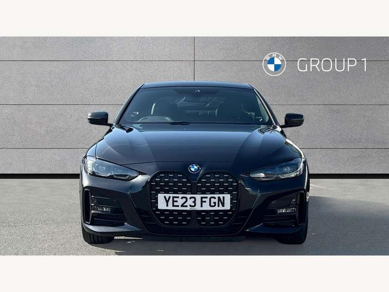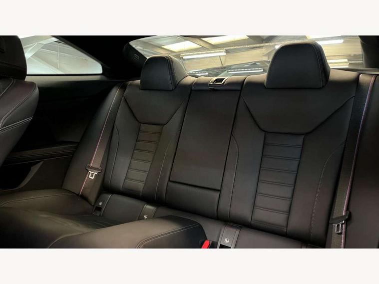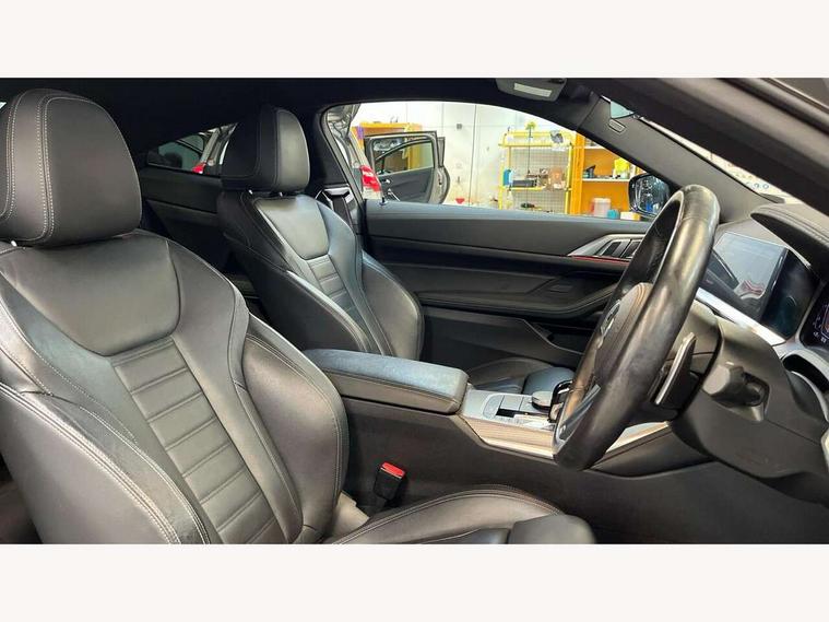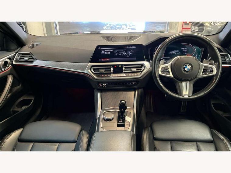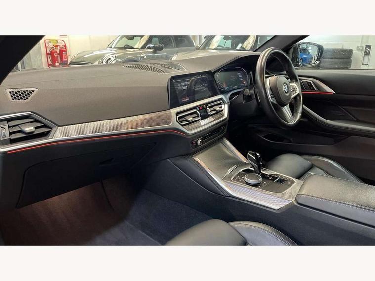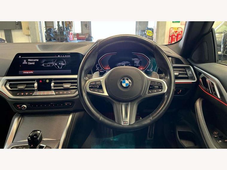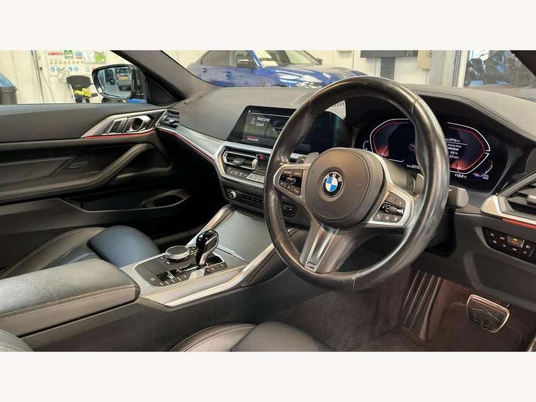 Active guard plus, Attentiveness assist, Auto start-stop, Bluetooth hands free facility with USB audio interface with audio streaming, BMW ConnectedDrive online services, BMW Live Cockpit Plus Nav/12.3" instrument display/14.9" display/Intelligent Voice Assist/iDrive touch/access 3rd party app/2USB/4G//bluetooth//Wi-Fi, BMW service history, BMW Teleservices, Brake pad wear indicator in front and rear, Check Control warning system for monitoring of lights and door/luggage compartment open warning, Condition based service, Cruise control with speed limit function, Electric power steering with Servotronic steering optimised at all speed ranges, Gearshift time display in manual mode, iDrive controller on centre console, Instrument cluster with speedometer with mph readout, tachometer, fuel gauge and oil temperature gauge, Integrated owners handbook, Oil sensor for level and grade, warning by check control system, On board computer - average speed, fuel consumption, outside temp display with acoustic warning, clock/date, service interval, odometer/trip meter, Optimum shift indicator, Run flat indicator, Shifting point display, Variable sport steering, 8 speed automatic steptronic transmission with gearshift paddles, Balanced 50/50 weight distribution, Double joint spring strut front axle, Double VANOS, Drive performance control - ECO PRO, comfort and sport modes, High precision injection, Low centre of gravity, M sport suspension, Petrol Particulate Filter, Stroke dependent dampers, VALVETRONIC engine management, 2x USB Type C ports in front centre console for charging and data transfer, 2x USB Type C ports in rear centre console for charging, DAB tuner, Electronic service booklet, 3rd brake light, Acoustic glazing, Automatic headlight beam throw control with load dependent regulating reaction, dynamic compensation of braking dive and acceleration squat, Automatic windscreen wipers and automatic headlight, Automatically dimming electrochromatic rear view mirror, BMW emblem on engine compartment lid and tailgate, BMW kidney grille with mesh grille front side of the nuggets in matt aluminium and frame in chrome high gloss, Body colour fuel filler flap, Body colour roof fin, Brushed aluminium inserts in the front door sill finishers with BMW designation, Door sill strips, Dynamic brake lights, Electric windows - front and rear, with open/close fingertip control, anti trap facility and comfort closing function all round, Exterior mirrors - electrically folding with anti-dazzle, Fading support, Follow me home headlights, Front and rear bumper system, Front apron plastic in body colour, Green tinted heat protection glazing, High gloss shadow line exterior trim, Illuminated bow type door handles in body colour drivers side with door lock, Interior rear view electrochromatic mirror with automatic anti dazzle function, LED daytime running lights, LED front fog lights, LED front indicators, Licence plate panel integrated into front bumper and tailgate, Lightweight engineering, M designation on front side panels, left and right, M sport rear spoiler with body colour gurney, Model designation on right side of tailgate, One piece front bumper cover including towing eye cover in body colour, Preparation for high beam assistant, Rear boot, Reversing light, Side frame decorative moulding black matt, Two part LED tailights in L-shape with components in smoked glass, brake light, LED turn indicator and rear fog light, Visible exhaust tailpipe finisher, Visible VIN plate, Welcome lights in interior and door handle area, Widened track and increased camber values for max transverse dynamics, agility and steering precision, Window recess cover black high gloss, Windscreen wipers with integrated heated washing jets, 12V power socket in front centre console, 2 front cupholder in centre console with clamping elements and matt black inlay, 2 Rear seat headrests, 2 seat bench in second row, 3 spoke M sport leather multifunction steering wheel, 3 zone automatic air conditioning, 4 pieces lashing eyelets in luggage compartment, 40:20:40 split folding rear seat and rear centre armrest with two cupholders, Anthracite headlining, Armrest integrated in front and rear door trim + front centre console armrest, BMW ID, Driver seat backrest width adjustment, Extended storage, Luggage compartment seprating net on side trim left and right, Bag hook on both side, Four grab handles integrated in roof lining, Front and rear door pockets, Front and rear reading lights, Front sport seats, Heated driver and front passenger seats, Height adjustable front headrests, Height adjustable mechanically and infinitely variable steering column, Illuminated armrest storage compartment, Illuminated glove compartment with separate small compartment, Make-up mirror lights, Single front passenger seat, Storage compartment in rear centre console, Sunvisors with illuminated vanity mirrors and ticket pocket, Toolkit located in luggage compartment, Velour front floor mats, Vernasca leather upholstery, Ambient lighting pack - 4 Series, Connected professional package - 4 Series, M sport exterior styling pack - 4 Series, 2 x 3-point rear seat belts, Battery safety cut-off, BMW emergency call, Brake energy regeneration, Braking pre-tensioning, Child seat ISOFIX attachment for the two outer rear seats, Coasting in idle in ECO PRO mode, Cornering brake control (CBC), Crash sensor activating of airbags, Unlocking doors, hazard warning lights, fuel cut off, interior lighting+activation of safety battery terminal clamp, Driver and front passenger side airbags, integrated in the door side seat backrest bolsters for all seat variants, Driver/Front Passenger airbags, Dry braking, Dynamic brake control, Dynamic stability control + (DSC+) - Anti-lock Braking System (ABS) with brake assist and cornering brake control + Automatic Stability Control (ASC), Dynamic Traction Control - DTC, Electromechanical parking brake including automatic hold function and automatic releas