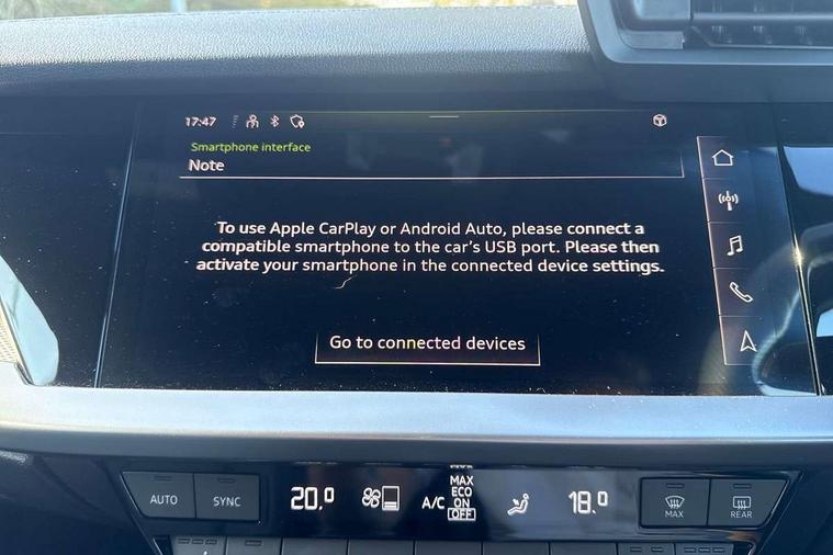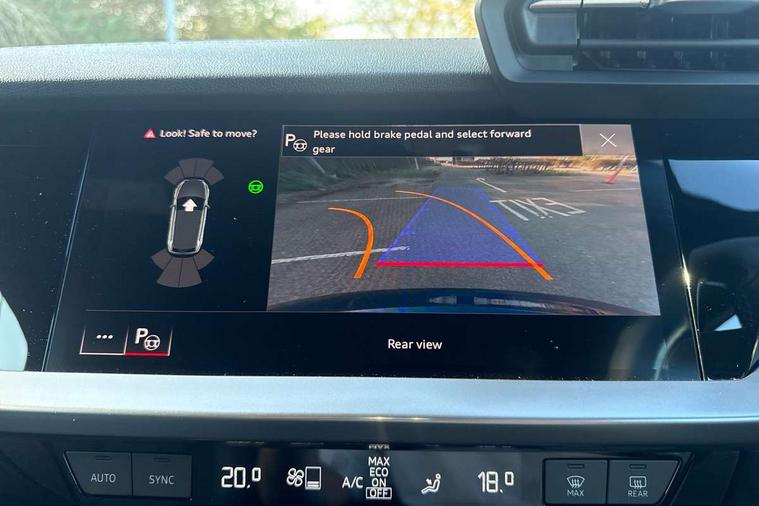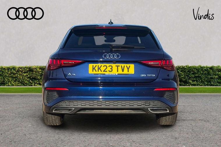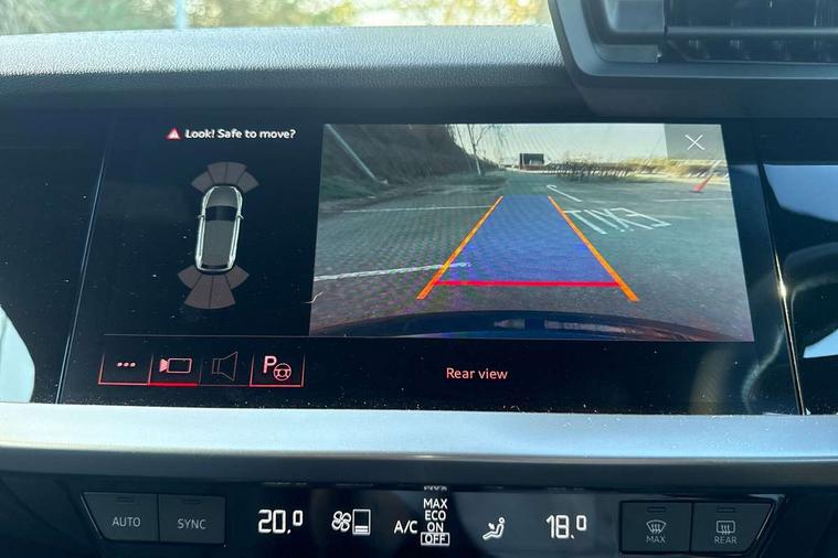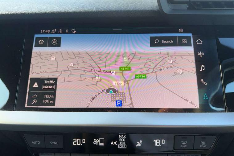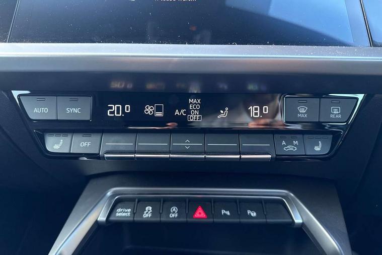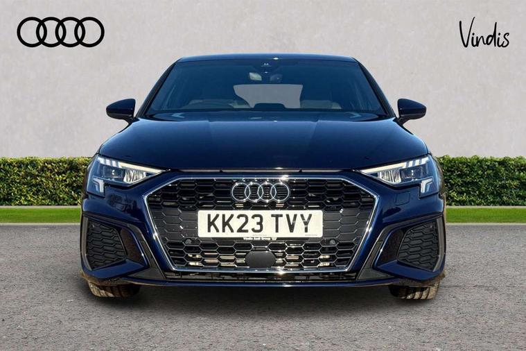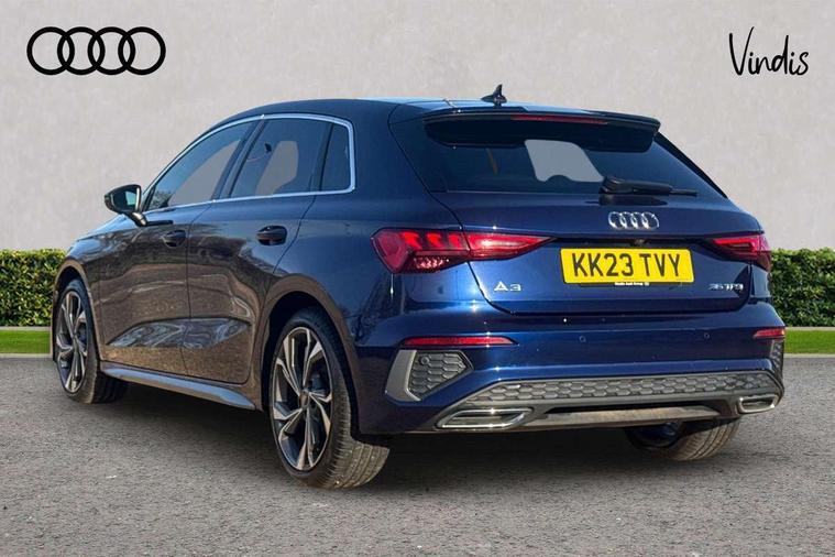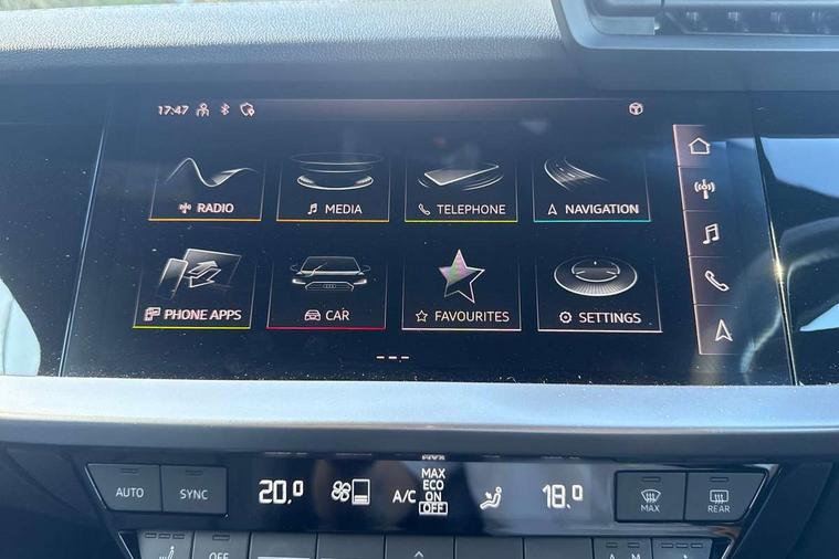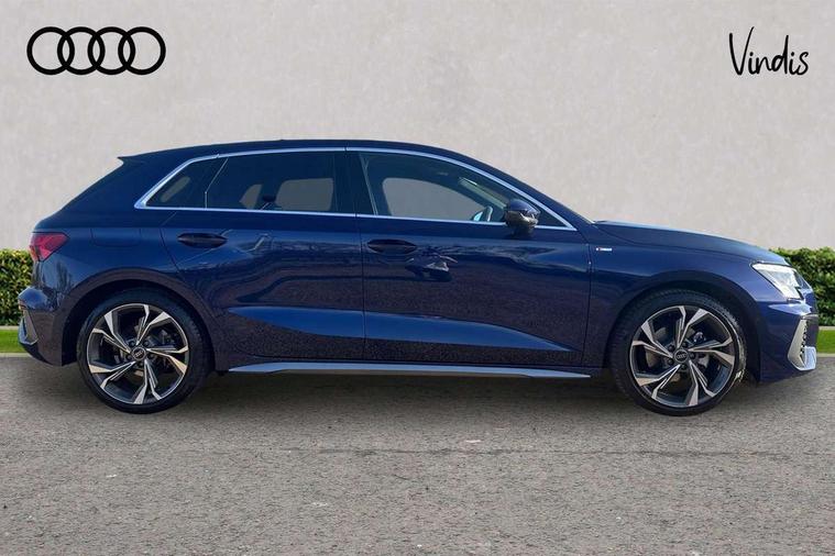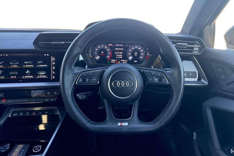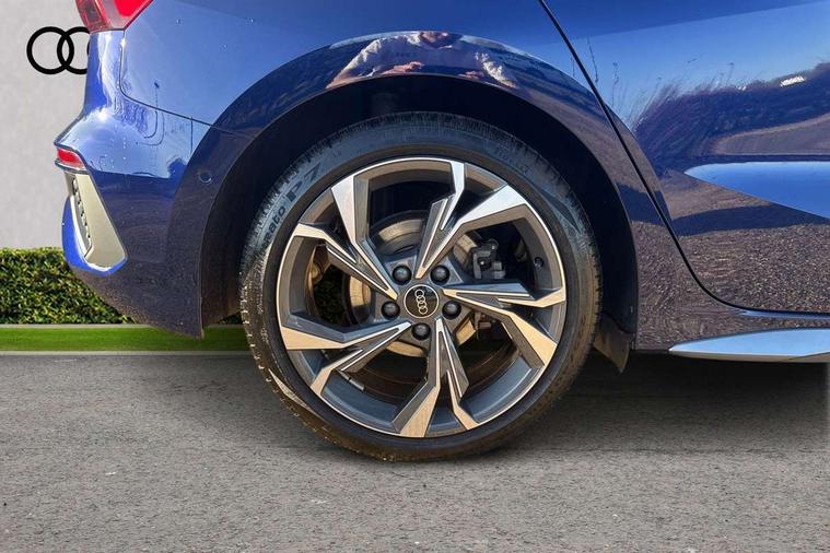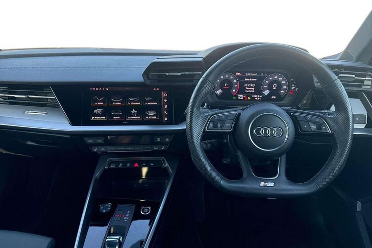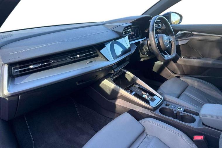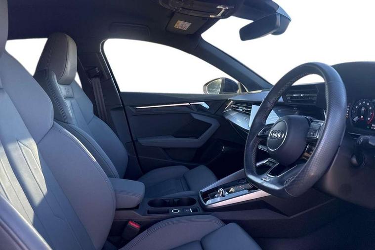 Audi drive select (Auto, Comfort, Dynamic, Efficiency and Individual), Audi smartphone interface, Audi Virtual Cockpit - 10.25" digital and colour instrument cluster, Automatic start/stop system with recuperation, Bluetooth interface, Camera based traffic sign recognition, Collision avoidance assistant, e-Call (emergency call), Electromechanical power speed sensitive steering, Lane departure warning system, MMI Navigation Plus with high resolution 10.1" colour touch screen display, Service indicator, Trip computer, Voice control system with natural language interaction, Sports suspension, 2xUSB-C connection with data and charging functions, 6 passive loudspeakers, DAB Digital radio, 3rd brake light, Acoustic glass windscreen, Aluminium window trim, Auto dimming frameless rear view mirror, Body colour exterior mirrors, Electrically adjustable/heated/folding/auto dimming door mirrors with integrated LED indications + kerb view function for passenger side, Front electric windows, Illuminated aluminium inserts front door sills with S logo, LED daytime running lights, LED headlights with LED rear lights and dynamic rear indicators, Light and rain sensors, Privacy glass - dark tinted rear window, rear door and side windows, Rear electric windows, Rear side air outlets in grained matt black, Rear side wing doors, Rear wiper, S line bumpers, S roof spoiler, 12V socket and storage compartment in front centre console, 3 seat bench in 2nd row, 3 spoke leather multifunction steering wheel with paddle shift, 4 way electrically adjustable lumbar support for driver and front passenger, 60/40 split folding rear seat bench, Black cloth headlining, Dual zone electronic climate control, Front and rear centre armrest in leather, Front and rear headrests, Front/rear floor mats, Height and reach adjustable steering wheel, Interior lighting - glove compartment light and right hand side, Luggage compartment floor covering, Manual boot compartment lid, Manually adjustable front seats, Seat side bolsters, Single front passenger seat, Stainless steel pedals and front footrest in black, Twin leather upholstery with front sports seats S embossed logo, Aluminium interior elements pack - A3 Sportback, LED interior lighting pack - A3 Sportback, S line styling pack - A3 Sportback, 3x3 point rear seat belts, Driver and front passenger airbag with passenger airbag deactivation, Electronic Stabilisation Control (ESC) including ABS, ASR and EDL, First aid kit with warning triangle and 2 safety vests, Front side airbags with head airbags and interaction airbag, Pre-sense front with pedestrian and cyclist detection, Seatbelt monitoring, Tyre pressure loss indicator, Anti theft alarm, Anti-theft wheel bolts, Electronically operated child lock, Immobiliser, Remote control central locking, Dark spectrum aluminium inlays, accent surfaces in the dashboard and centre console in platinum grey silk effect paint finish,