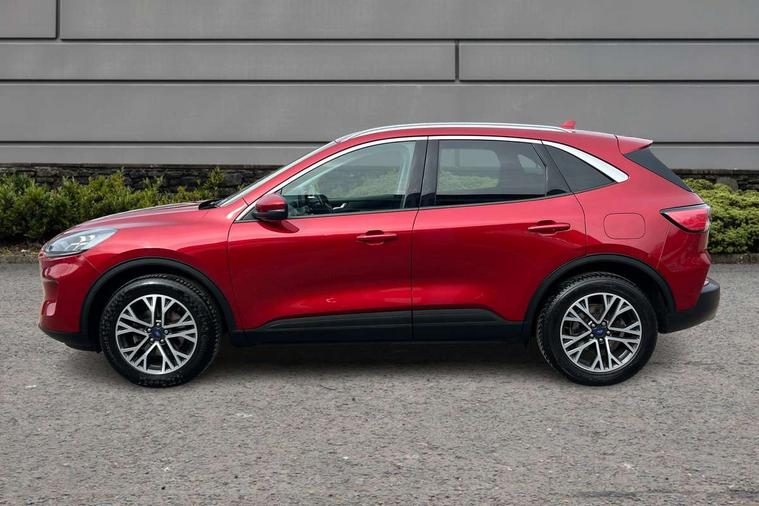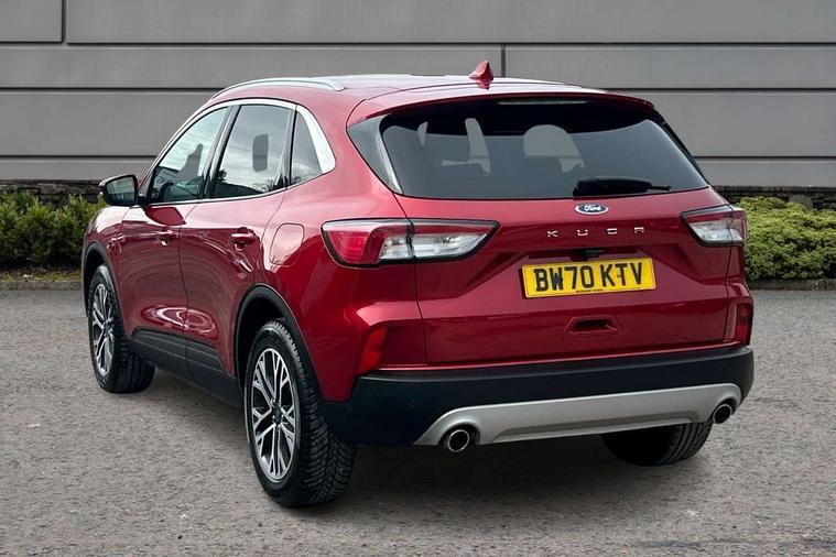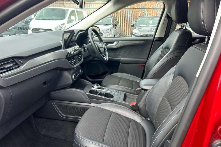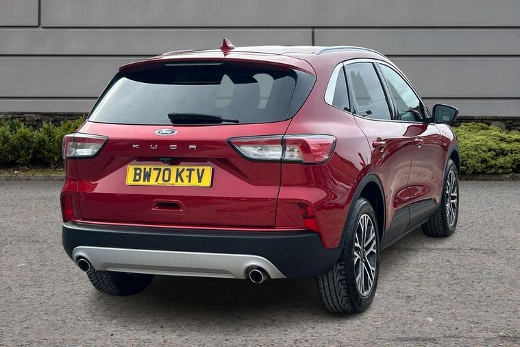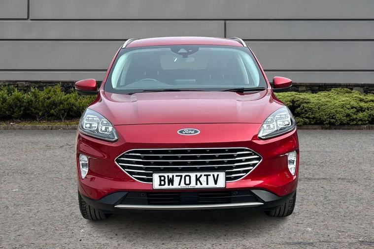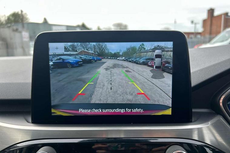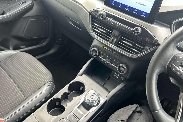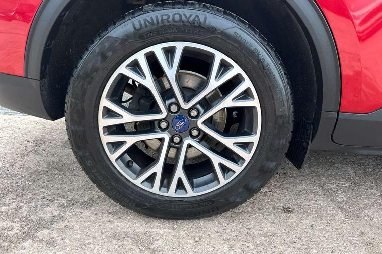 Ford easy fuel, Front and rear parking sensors, Hands free power tailgate, Lane keeping aid with lane departure warning, Mobile phone wireless charging pad, Power assist steering, Rear view camera, Selectable drive modes, Auto dimming rear view mirror, Auto headlamps with high and low beam, Auto wipers, Front LED fog lamps, Front scuff plate, Halogen Projector Headlamps, LED daytime running lights, LED rear lights, Power folding heated door mirrors with puddle lights, Power front/rear windows with global close, Privacy glass, Quickclear heated windscreen, Rear spoiler, Silver roof rails, Twin exhausts, 10 way power adjustable drivers seat, 2nd row sliding seats with 60:40 split, 8 way manual passenger seat including lumbar support and height adjust, Ambient lighting, Centre console with electronic parking brake, Dual electronic automatic temperature control, Front and rear floor mats, Front and rear head restraints, Leather steering wheel and gear knob, Rear charging point, Salerno partial leather upholstery, Sports seats, B&O with large instrument cluster pack - Kuga, 3x3 point rear seatbelts, Airbags - front driver/passenger, front and rear curtain, Drivers knee airbag, Electronic stability control (ESC) and ABS, Ford MyKey Gen 2 safety system, Manual child proof rear door locks, Post collision braking, Pre collision assist with autonomous emergency braking, Tyre pressure monitoring system, Engine immobiliser, Keyless entry, Keyless start with 'Ford Power' starter button, Locking wheel nuts, Remote powered central double locking doors, Thatcham category 1 alarm,