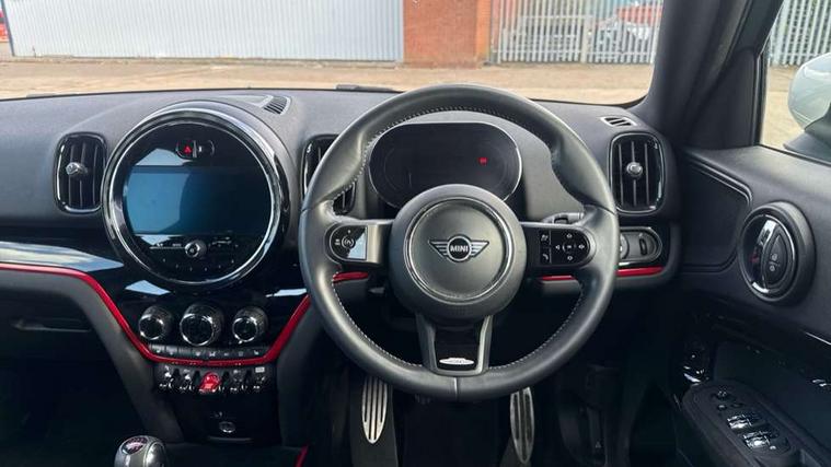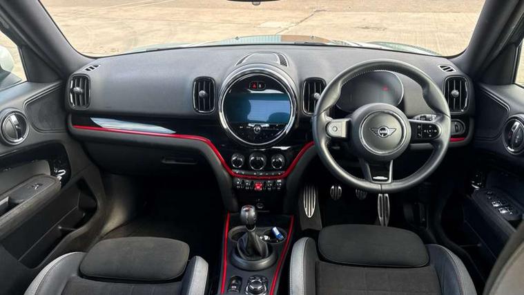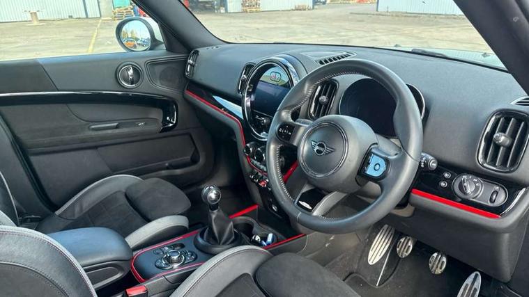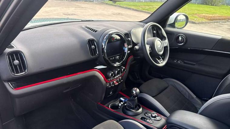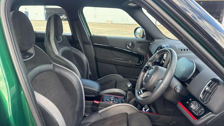 Active Guard incl speed limiting and lane departure functions with auto steering, and front collision warning with brake intervention, Automatic start/stop function with brake energy recuperation, Compatible mobile phone bluetooth with audio streaming, Cruise control with brake assist, Electro-mechanical speed dependant steering assistance, Instrument cluster, MINI Driving Modes - centre toggle switch to control driving setting (sport, mid and green), On board computer, Rear parking distance control, 51 Litre fuel tank, 6 Speed manual transmission including gear change indicator display, Double Vanos system, Fully variable valve control, High precision injection, Performance Control, FM tuner and DAB digital radio, Bonnet scoop, Chrome fuel filler cap, Day time driving lights, Dynamic brake lights, Electric windows, Heated rear window, Heated windscreen washer jets, John Cooper Works - aerodynamic kit (front and rear apron, spoiler), front and rear sport bumpers and part-painted side sills with door sill finishers, John Cooper Works Logo, LED fog lights, LED Headlights, Metal door sill strips with Cooper S imprint, Model logo, Model logo on Tailgate, Rain sensor with auto headlights, Rear fog lights, Rear window wiper, Side scuttle panel with integrated indicator, Split rear doors, Sun/heat protection glass, White indicator lenses, 12V socket in centre console, 360L luggage compartment capacity, 4 lashing eyes in luggage compartment, 40:20:40 split folding rear seats, Anthracite headlining with grab handles and clothes hooks, Chrome interior highlights, Colour line - Carbon black, Cupholders, English handbook, Floor mats, Front headrests, Glove compartment, Height and length steering column adjustment, Interior lighting with 12 basic colours selectable via toggle switch in roof, Isofix rear child seat preparation, LED reading lights, vanity mirror lights, front foot well light and spotlight on front seats, Manual air conditioning, Mini John Cooper Works leather gearshift lever and handbrake gaiters, Multifunction steering wheel, Nappa leather steering wheel with MINI Yours logo, Rear headrests, Stainless steel pedals and foot rest, Storage compartments in doors, Sunvisors with vanity mirrors, Excitement pack - Countryman, Navigation pack - Countryman, Piano black exterior pack - Countryman Cooper S/SD/SE/Boardwalk, 2 tone horn, 3 point seatbelts on all seats, 6 Airbags - front, side, head and seat belt tensioners, Anti-lock braking system (ABS), DSC - Dynamic Stability Control, Electronic handbrake, Front and rear disc brakes, Hill start assist, Tyre pressure monitoring system, Alarm system with tilt sensor, monitoring doors, bonnet interior and tailgate, Auto drive away locking, Deadlocking function, Electronic vehicle immobiliser, Locking wheel bolts, Start/stop toggle with keyless go, Piano black JCW interior trim, Tool kit,