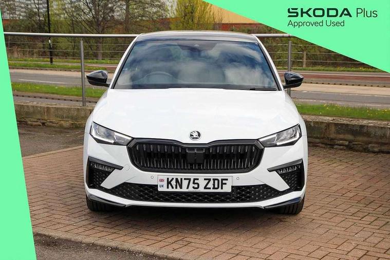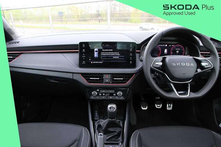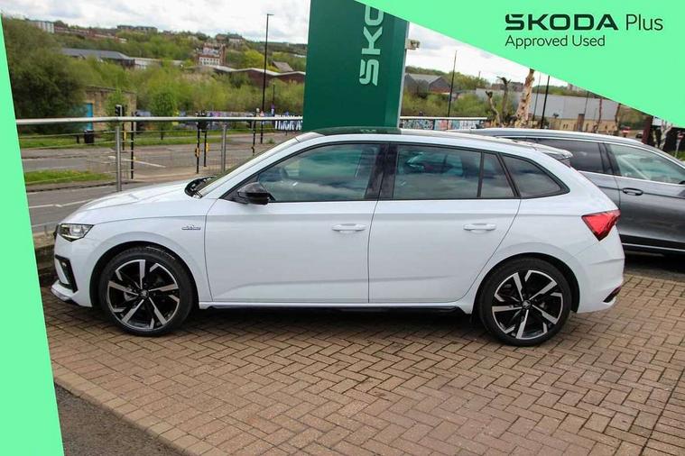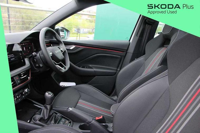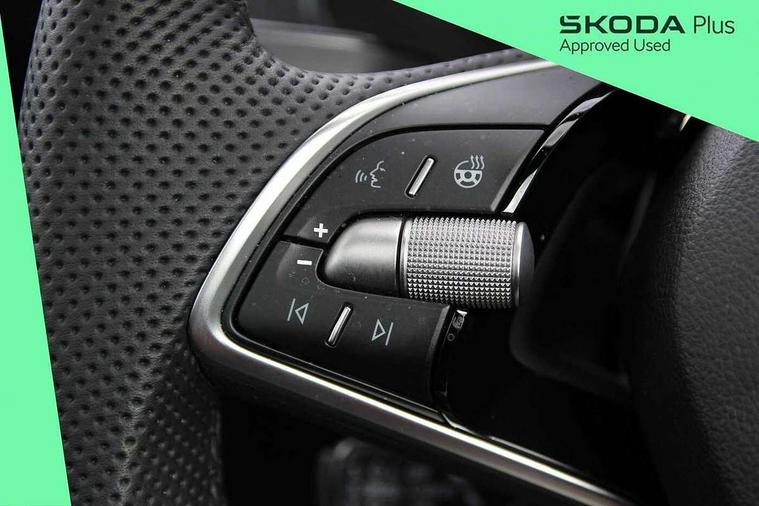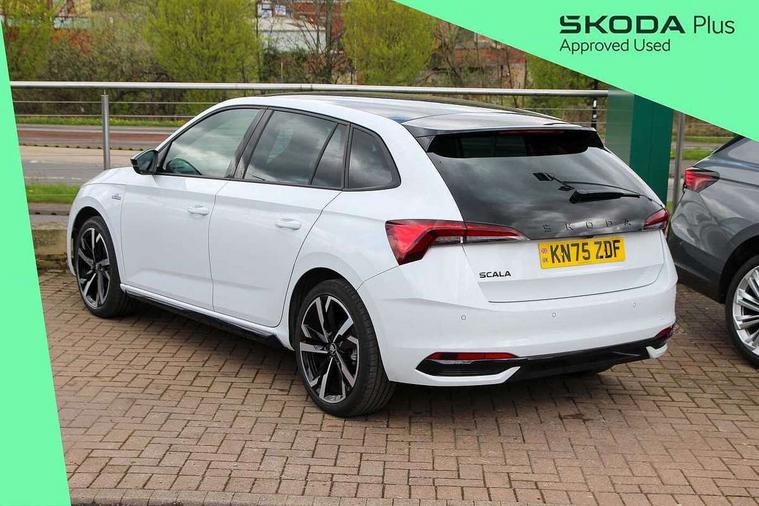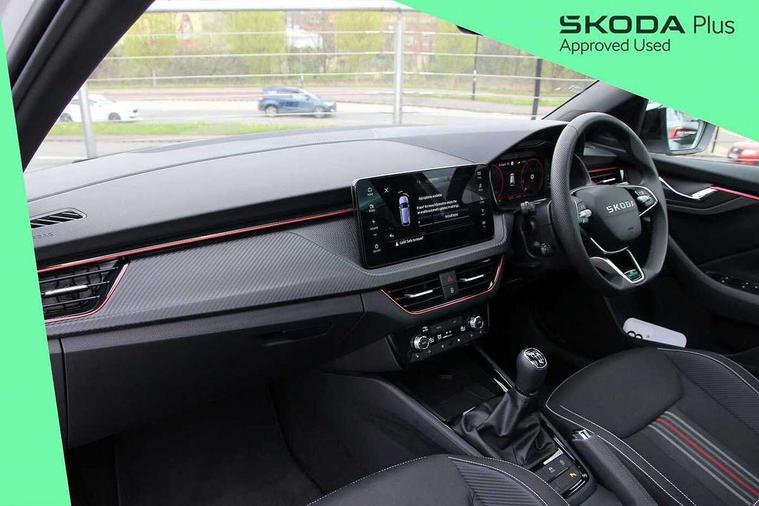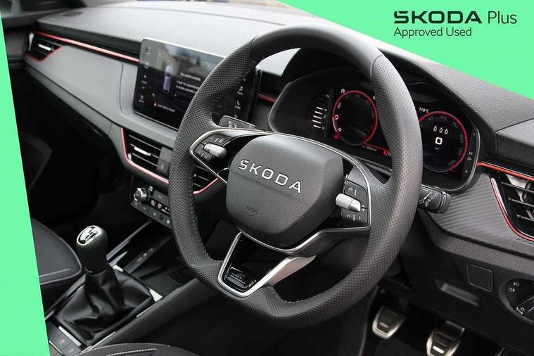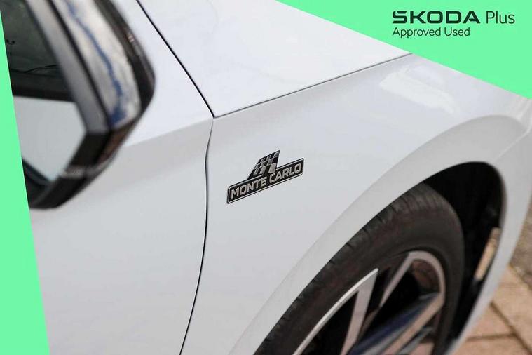Advanced driver attention and drowsiness monitor, Bluetooth, e-Call (emergency call), Front assist system, PAS, Rear parking sensors, Rear view camera, Speed limiter, Tailgate, Traffic sign recognition, Virtual Cockpit - 10.25" digital display, Voice control system, Wireless smartlink, Drive mode select with Sport Chassis Control and ECO mode, 4 USB C ports, 8 Speakers, 9.2" Skoda navigation display, DAB radio, Auto dimming rear view mirror, Automatic headlight control with manual coming and leaving home feature, Automatic intermittent wipers, Black door mirrors, Black lettering on boot lid, Black radiator grille, Black rear diffuser, Black roof spoiler, Black window frames, Body colour bumpers, Body colour door handles, Extended tailgate glass, Front and rear electric windows, Heated rear window, LED 3rd brake light, LED daytime running lights, LED high beam, LED low beam, Light sensors, Monte carlo plaque, Panoramic glass roof, Privacy glass, Rear LED fog light, Rear side wing doors, Rear wiper, Tinted windows, Unique dark chrome design logo on alloy wheels, 12V socket in luggage compartment, 3 seat bench in 2nd row, Aluminium pedals, Ambient lighting in white/red, Black / White armrest stitching, Black roof headlining, Cargo elements, Chrome inner door handles, Door inserts in art.leather carbon, Driver and passenger sun visors with vanity mirror, Dual zone climate control, Front and rear roof lights, Front centre armrest, Front head restraints, Height adjustable driver seat, Height adjustable passenger seat, Ice scraper, Illuminated glove compartment, Inner circulation control with pollen filter, ISOFIX for front passenger seat, Isofix preparation for back seats, Leather gearknob and handbrake lever, Luggage net under rear parcel shelf, Manual lumbar support for front seats, Monte Carlo cloth upholstery, Net package and top tether hooks in boot space, Pocket on the back of both front seats, incl. mobile phone pockets, Rear centre armrest, Red hotstamping, Single front passenger seat, Skoda lettering on steering wheel, Sport seats, Textile floor mats, Third rear headrest, Ticket holder, Top tether for front passenger seat, Umbrella in driver's door, Light and view plus pack - Scala, 3x3 point rear seatbelts, ABS, Child locks, Curtain airbags and front side airbags, Disc brakes, Driver and front passenger airbags, ESP, Hill hold control, Manual leather parking brake, One tone horn, Passenger airbag switch off function, Seatbelt reminder for driver and front passenger, Tyre pressure monitoring system, Anti theft alarm system with interior monitoring, backup horn and towing protection, Anti-theft wheel bolts, Remote central locking with 2 remote folding keys, SAFE function for remote central locking, Carbon effect decorative inserts, 18" Ursa black diamond cut alloy wheels,