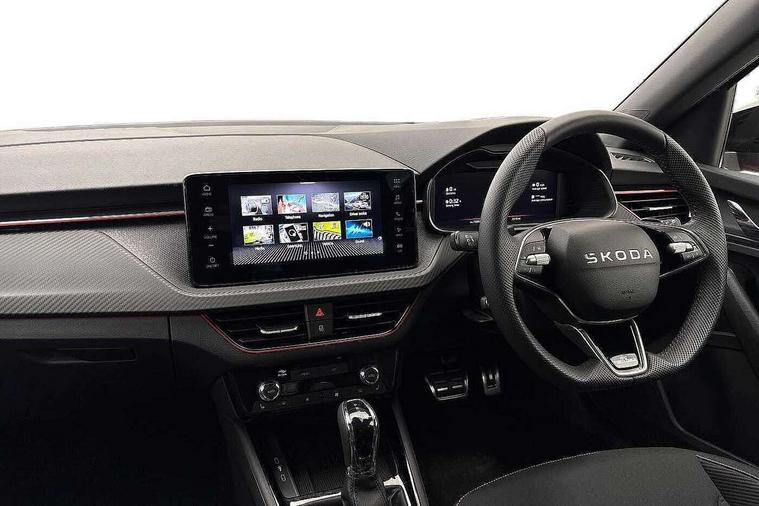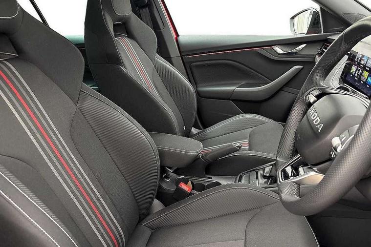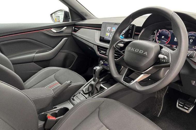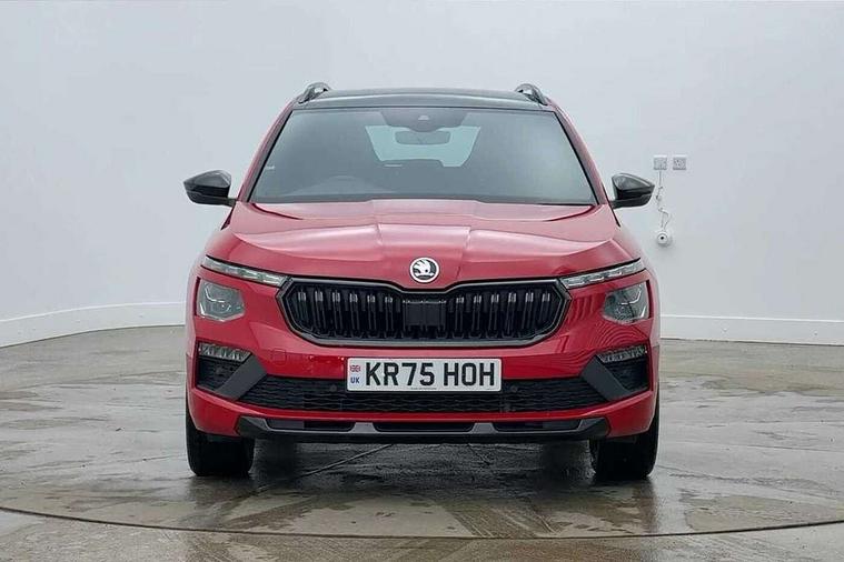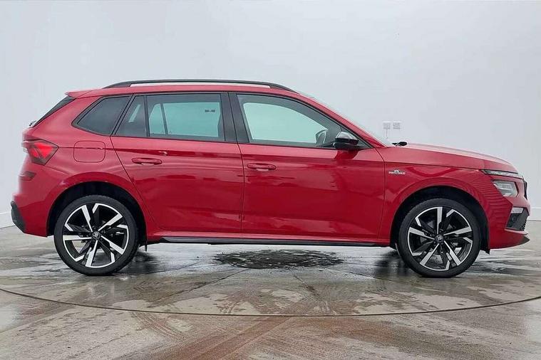 Advanced driver attention and drowsiness monitor, Bluetooth system, E-call, Front assist system, PAS, Rear parking sensors, Rear view camera, Service indicator, Speed limiter, Traffic sign recognition, Virtual cockpit with 10.25" display, Voice control system, Wireless smartlink, 4 USB C ports, 8 Speakers, 9.2" Skoda navigation display, DAB Digital radio, Auto dimming rear view mirror, Automatic headlight control with coming home and leaving home feature, Black door mirrors, Black radiator grille, Black rear diffuser, Black roof spoiler, Body colour bumpers, Body colour door handles, Boot lettering in black, Extended tailgate glass, Fixed panoramic sunroof with black roof rails, Front and rear electric windows, Heated rear window, LED daytime running lights, LED high beam, LED low beam, LED third brake light, Light sensors, Monte carlo plaque, Privacy glass, Rear side wing doors, Rear wiper, Ticket holder inside windscreen, 12V socket in luggage compartment, 3 seat bench in 2nd row, Aluminium pedals, Ambient lighting in white/red, Art leather carbon decor inserts, Art leather carbon door inserts, Black roof lining, Cargo elements, Chrome inner door handles, Driver and passenger sun visors with vanity mirror, Dual zone climate control, Front and rear roof lights, Front centre armrest, Front head restraints, Glove compartment with illumination, Height adjustable driver seat, Height adjustable front passenger seat, Ice scraper, Inner circulation control with pollen filter, ISOFIX on front passenger seat, Isofix preparation for back seats, Leather gearknob and handbrake lever, Manual lumbar support for front seats, Monte Carlo cloth upholstery, Net package and top tether hooks in boot space, Net under rear shelf, Pocket on the back of both front seats include mobile phone pockets, Rake/reach adjustable steering wheel, Reading lights, Rear centre armrests, Red hotstamping, Single front passenger seat, Sports seats, Textile floor mats, Third rear headrest, Top tether for front passenger seat, Umbrella in driver's door, Light and view plus package - Kamiq, 3x3 point rear seatbelts, Airbags - driver and front passenger, Disc brakes, ESP, Extended and predictive pedestrian/cyclist protection, Front passenger airbag deactivation switch, Front side airbags with curtain airbags, Hill hold control, Manual leather parking brake, Manual rear child locks, One tone horn, Seatbelt reminder for driver an co-driver, Traction control, Tyre pressure monitor, Anti-theft alarm system with interior monitoring, backup horn, towing protection and remote central locking with SAFE system, Anti-theft wheel bolts, Electronic engine immobilizer, 18" Ursa black diamond cut alloy wheels,