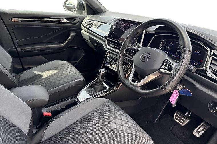 10.25" Digital cockpit pro, Bluetooth mobile phone interface, Driver alert system with fatigue detection, Driver tips and journey analysis, Emergency call service, Lane keeping system Lane Assist, Modified key software - reduce switch off time for key status change to Long no motion, Online services, Park assist including front and rear parking sensors, Service interval indicator, Tailgate/trunk lid release from outside, Think blue trainer driver tips and journey analysis, Warning sound and light for front seatbelts unfastened, Wireless app connect, Battery regeneration during braking, Start/stop function with battery regeneration, Diversity antenna for FM reception, Front and rear 6 speakers, Music playback - MP3, WMA and AAC files, Premium USB cable in choice of either Apple or Android smartphone compatibility, SD card slot, Simultaneous pairing of 2 compatible mobile devices, Title and cover art display, We Connect and We Connect Plus functionality, 3rd brake light, Auto dimming interior rear view mirror, Automatic hazard lights activation under emergency braking, Automatic headlight control with LED separate daytime running lights with coming/leaving home function, Extended roof spoiler, Exterior mirrors aspherical on driver side, convex on front passenger side, External USB type C socket and charging sockets, Front windscreen wiper with intermittent wipe and 4 position delay, Heated rear window, LED Plus headlamps, LED rear combination lamps, LED rear number plate lights, LED tail lamp rear comination lamps, Power windows with comfort operation and circuit breaker, R-Line design body coloured bumpers, Rain sensor, Rear exhaust tailpipe, Rear fog light on one side and reversing lights on both sides, Rear side wing doors, Rear wash/wipe with intermittent wipe setting, Remote electrically foldable door mirrors, puddle lights and reverse activated passenger's door mirror, 12V power socket in centre console, 3 rear head restraints, 3 seat bench in 2nd row, 4 load lashing points in luggage compartment, Air care climatronic air conditoning system with active combination filter and 2-zone temperature control, Black roof lining, Chrome plated radiator grille inserts, air vent surrounds and light switch surrounds, Door and side trim panel with leatherette insert, Drawer under drivers seat, Front + rear carpet mats, Front centre armrest, Front cupholders x 2, Front footwell illumination, Front reading light, Front scuff plates with R logo, Instrument lighting, white adjustable panel illumination, Interior ambient lighting and surround lighting, Interior light delay, Isofix child seat preparation, Leather gearshift handle, Load-through provision with cup holder when folded down ('Unsplit rear seat bench, split folding backrest, with centre armrest), Luggage compartment lighting, Single front passenger seat, Stainless steel pedals, Storage compartment in left and right luggage area, Storage compartment in rear doors, Storage compartments in driver and front passenger doors, Sunvisors with illuminated vanity mirrors, Variable boot floor, height adjustable and removable, Driver assistance pack without proactive passenger protection - T-Roc, 3 point height adj front seatbelts + pretensioners, 3 point seatbelts in outer rear with ECE label, ABS, Child locks on rear doors, Driver and front passenger airbag with front passenger airbag deactivation, Driver and front passenger safety-optimised head restraints, Drivers seatbelt reminder, Electronic parking brake, Electronic Stability Control (ESC) inc EDL (Electronic Differential Lock) and ASR (Traction Control), Front and rear passengers curtain airbag system including front side airbags, Front assist with city emergency braking and pedestrian monitoring, Front seat side impact airbags, Hill start assist, Predictive pedestrian protection, Rear disc brakes, Single tone horn, Tyre pressure loss indicator, Volkswagen roadside assistance, Alarm with interior protection, Anti-theft alarm system with interior monitoring, backup horn, and towing protection, Remote central locking with SAFELOCK, radio remote control with 2 remote control folding keys, Trims for alloy wheels,