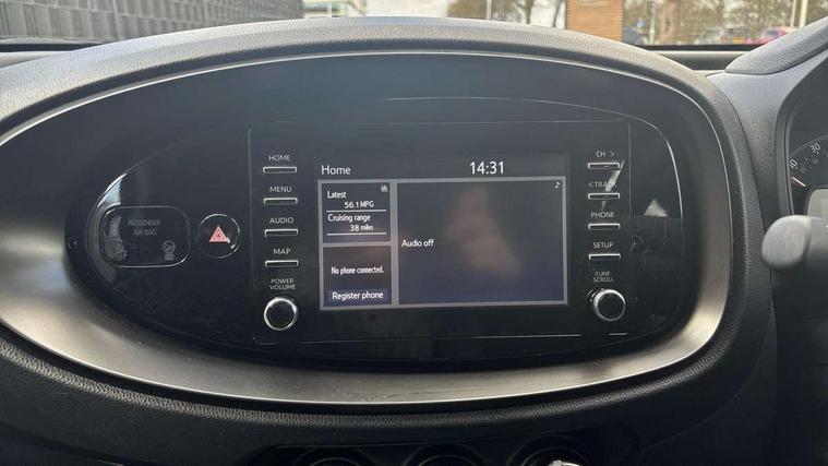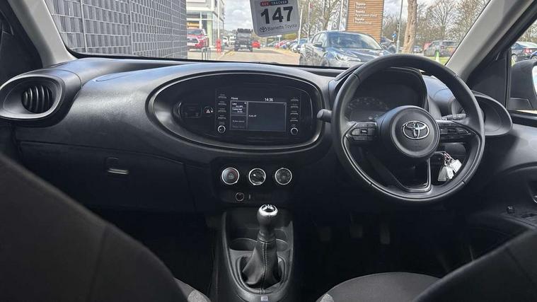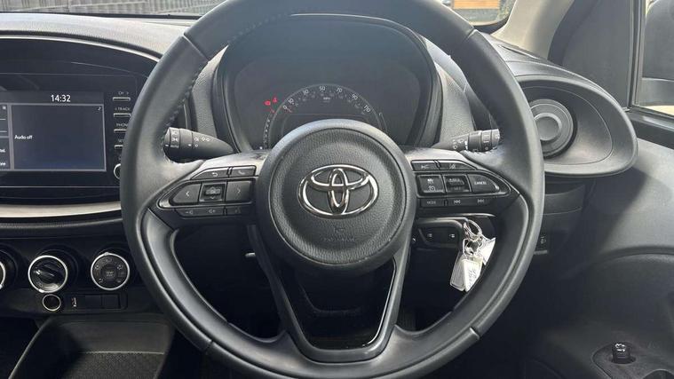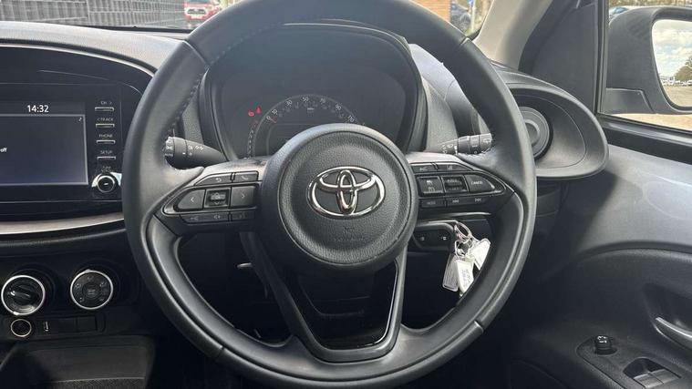 4.2" TFT colour screen, Adjustable speed limiter, Analogue speedometer, Bluetooth connectivity, Digital tachograph, Driver attention alert system, eCall emergency call system, Electric power steering, Intersection turn assist, Key reminder warning, Noise reduction kit, Pre collision system with emergency steering assist, Reversing camera with static guide lines, Smart phone integration with Apple car play/Android Auto, Speed limit display, Start and stop, Vehicle Stability Control (VSC), 4 speakers, DAB digital audio broadcast, Toyota touch 2 multimedia System with 7" Screen display, USB connector, Auto headlights, Automatic headlights cut-off, Bicycle towing hook, Black lower front grille, Black rear bumper, Black side protection mouldings, Black upper front grille, Black wheel arch mouldings, Body colour door handles, Body coloured front bumper, Boot door scuff plate, Electric heated door mirrors, Follow me home headlights, Front power windows, Gloss black door mirrors, Headlight cut-off reminder, LED daytime running lights, LED front light guide, LED High mounted stop lamp, Manual day/night rear view mirror, Manual headlight levelling, Pagoda roof, Power adjustable door mirrors, Power back door, Projector halogen headlights, Rain sensor, Rear combination lights LED bulb type, Rear side wing doors, Rear windscreen defogger, Rear windscreen wiper, Short antenna, Variable intermittent windscreen wipers, 12v power outlet - front, 2 seat bench in 2nd row, 3 spoke leather steering wheel, 50/50 split folding rear seat, Adhesive roof headlining, Adjustable speed limiter switch on steering wheel, Audio and telephone switches on steering wheel, Black insert on steering wheel, Boot light, Centre room light, Chrome interior door handles, Chrome surround on air conditioning buttons, Clean air filter, Fabric upholstery, Floor mats, Front and rear cup holders, Front head rest deco art, Front head restraints, Height adjustable driver seat, Intelligent adaptive cruise control switch on steering wheel, ISOFIX child restraint system on rear seats, Lane departure alert switch on steering wheel, Leather gearshift knob, Light grey roof lining, Manual air conditioning, Manual tilt steering wheel, Manually reclining and sliding driver seat, Manually reclining and sliding front passenger seat, Multimedia switches on steering wheel, Pollen filter, Rear door pockets, Rear head restraints, Resin console box storage, Satin silver insert on gear shift knob, Silver stitching on gear shift knob, Single compartment glovebox with lights, Single front passenger seat, Soft tonneau cover, Sun visors with mirror on driver and passenger side, Voice recognition switch on steering wheel, Toyota safety sense pack - Aygo X, Anti lock braking system + Electronic brake force distribution, Child safety door lock, Emergency brake light signal (EBS), Hill start assist control (HAC), Passenger airbag on/off switch, Seat belt reminder for front and rear seats, Supplement restraints system (SRS) - 6 airbags, Traction control, Tyre pressure warning system, Immobiliser, Remote power door locks, Black air vent surround, Black wheel centre caps, Tyre repair kit,