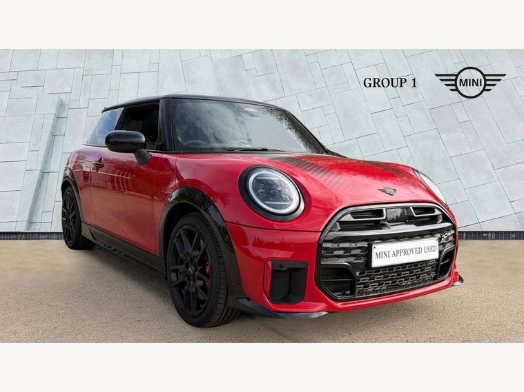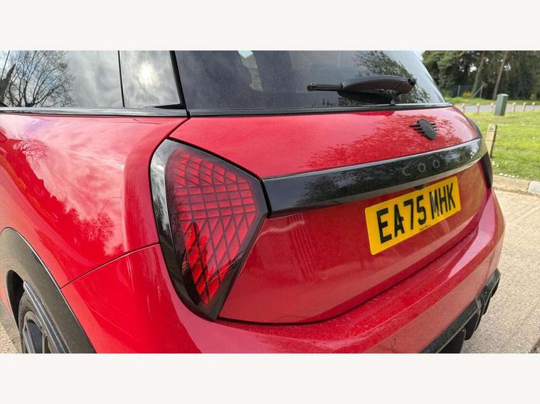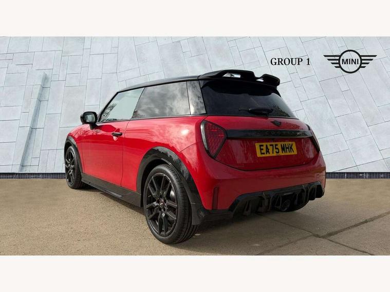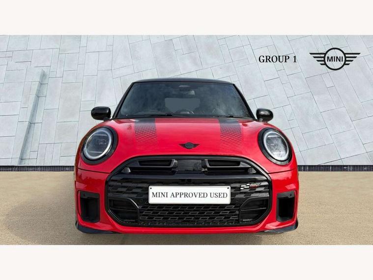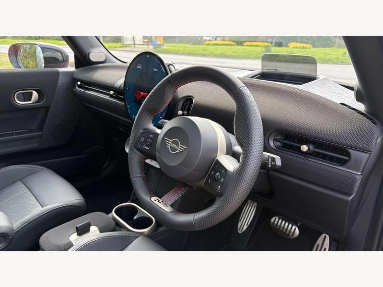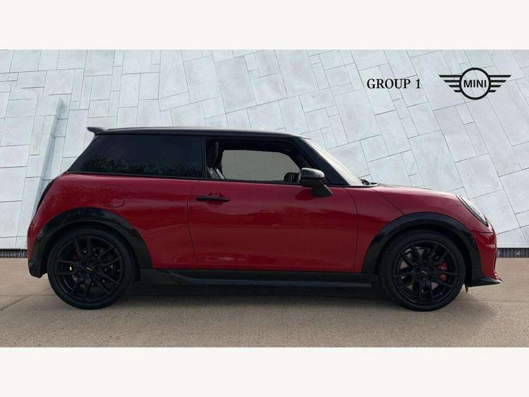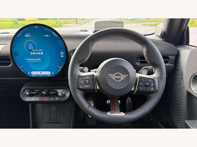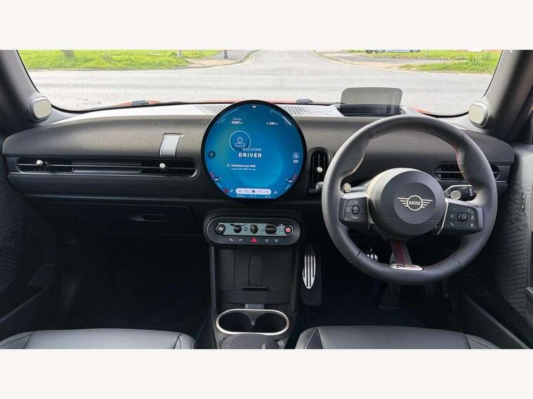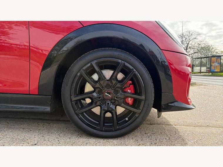Central toggle bar, Circular OLED Screen, Compatible mobile phone bluetooth with audio streaming, Cruise control, Digital instrument cluster, Electro-mechanical speed dependant steering assistance, Emergency call service, Gaming controller with intelligent personal assistant voice update, JCW bespoke experience mode, Mini navigation system, On board computer, Service interval indicator, Tailgate, 7 speed sport transmission with double clutch, Adaptive suspension, JCW exhaust system, DAB Digital radio, Harman Kardon sound system, Personal eSim, Rear USB charger, Auto headlights, Electric adjustable heated door mirrors, Electric front windows, Front and rear apron, Heated rear window, Heated windscreen washer jets, High gloss black wheel arches, High gloss hexagonal patterned grille surround, JCW body kit, LED 3rd brake light, LED daytime running lights, LED indicator lights, LED rear lights, Rain sensor window wipers, Rear fog lights, Rear roof spoiler with airblades, Rear window wiper, 2 seat bench in second row, 2 zone automatic air conditioning, 60/40 rear seat bench, Ambient lighting, Black lower band in high gloss, Cupholders, Dark headliner, Floor mats, Front and rear head restraints, Front compact armrest, Heated steering wheel, Height adjustable passenger seat, Lidded storage box in Black/Red knit, Luggage compartment lighting, Partially perforated vescin steering wheel with red accent, black/red decorative strap, Single front passenger seat, Stainless steel pedals, Steering wheel paddle shift, Sunvisors with vanity mirrors, Driving assistant pack - Cooper Hatchback, Level 1 pack - Mini Hatchback, Park assistant pack - Cooper Hatchback, 3 point seatbelts on all four seats, 6 Airbags - front, side, head and seat belt tensioners, Anti-lock braking system (ABS), DSC - Dynamic Stability Control, Electronic parking brake, Front and rear disc brakes, Front ISOFIX (iSize), Front passenger airbag deactivation, JCW Sport Brakes, Red brake callipers with JCW badge, Traction control, Tyre pressure monitoring system, Alarm, Immobiliser, Remote central locking, Black/Red decorative dash strap, Tyre repair kit,