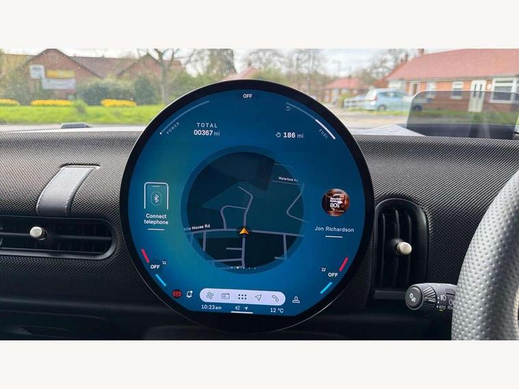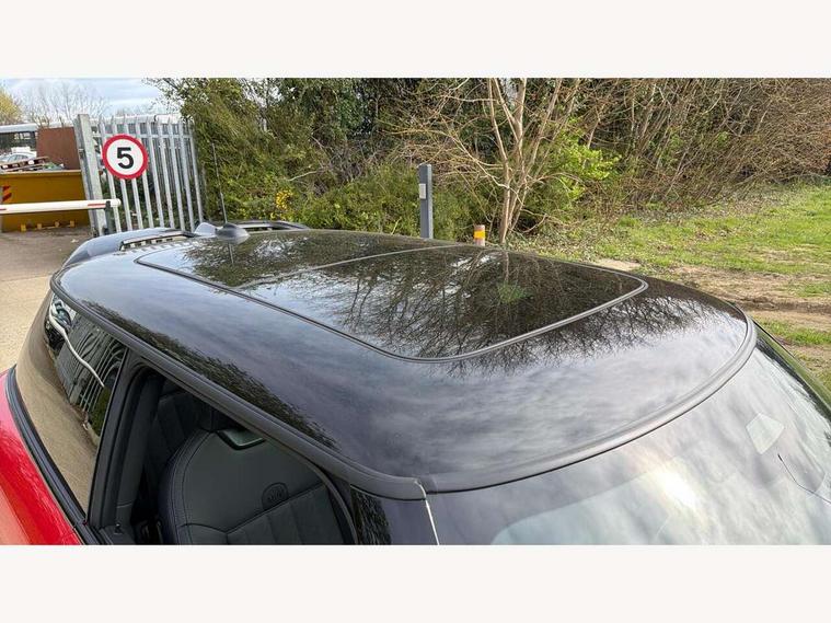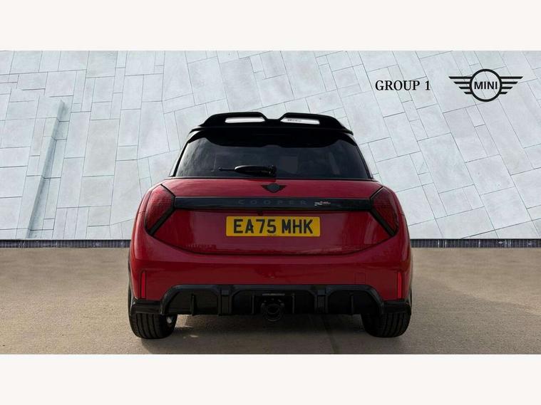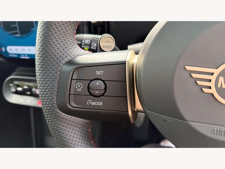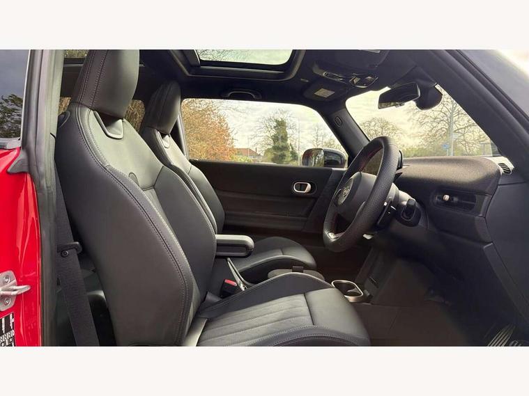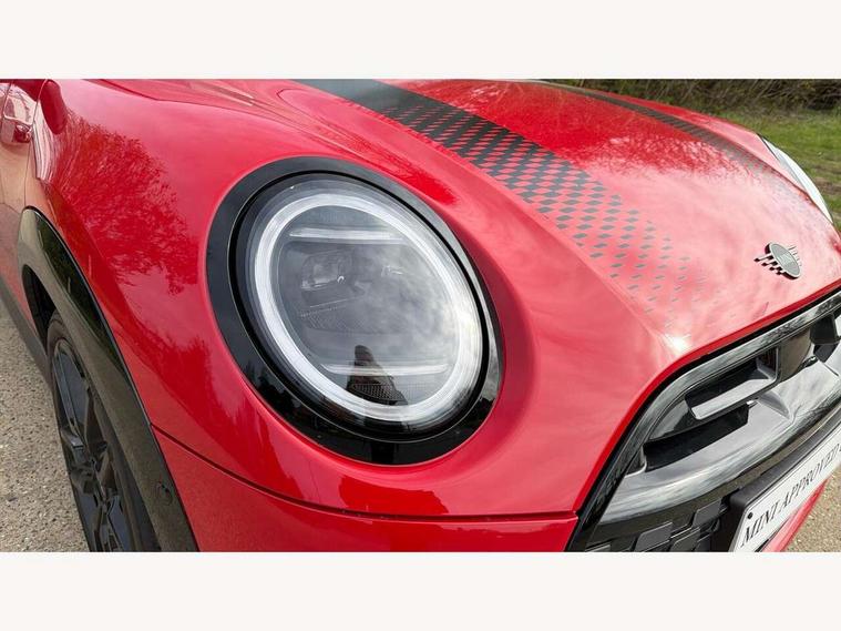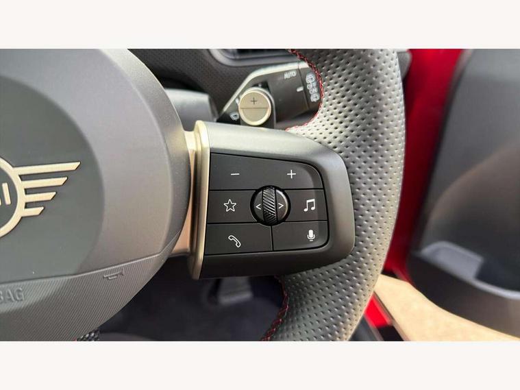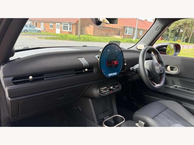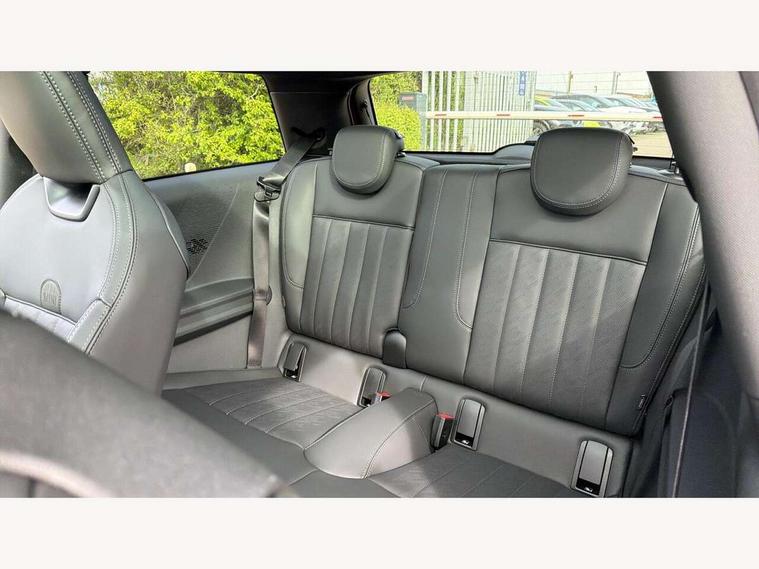 Central toggle bar, Circular OLED Screen, Compatible mobile phone bluetooth with audio streaming, Cruise control, Digital instrument cluster, Electro-mechanical speed dependant steering assistance, Emergency call service, Gaming controller with intelligent personal assistant voice update, JCW bespoke experience mode, Mini navigation system, On board computer, Service interval indicator, Tailgate, 7 speed sport transmission with double clutch, Adaptive suspension, JCW exhaust system, DAB Digital radio, Harman Kardon sound system, Personal eSim, Rear USB charger, Auto headlights, Electric adjustable heated door mirrors, Electric front windows, Front and rear apron, Heated rear window, Heated windscreen washer jets, High gloss black wheel arches, High gloss hexagonal patterned grille surround, JCW body kit, LED 3rd brake light, LED daytime running lights, LED indicator lights, LED rear lights, Rain sensor window wipers, Rear fog lights, Rear roof spoiler with airblades, Rear window wiper, 2 seat bench in second row, 2 zone automatic air conditioning, 60/40 rear seat bench, Ambient lighting, Black lower band in high gloss, Cupholders, Dark headliner, Floor mats, Front and rear head restraints, Front compact armrest, Heated steering wheel, Height adjustable passenger seat, Lidded storage box in Black/Red knit, Luggage compartment lighting, Partially perforated vescin steering wheel with red accent, black/red decorative strap, Single front passenger seat, Stainless steel pedals, Steering wheel paddle shift, Sunvisors with vanity mirrors, Driving assistant pack - Cooper Hatchback, Level 1 pack - Mini Hatchback, Park assistant pack - Cooper Hatchback, 3 point seatbelts on all four seats, 6 Airbags - front, side, head and seat belt tensioners, Anti-lock braking system (ABS), DSC - Dynamic Stability Control, Electronic parking brake, Front and rear disc brakes, Front ISOFIX (iSize), Front passenger airbag deactivation, JCW Sport Brakes, Red brake callipers with JCW badge, Traction control, Tyre pressure monitoring system, Alarm, Immobiliser, Remote central locking, Black/Red decorative dash strap, Tyre repair kit,