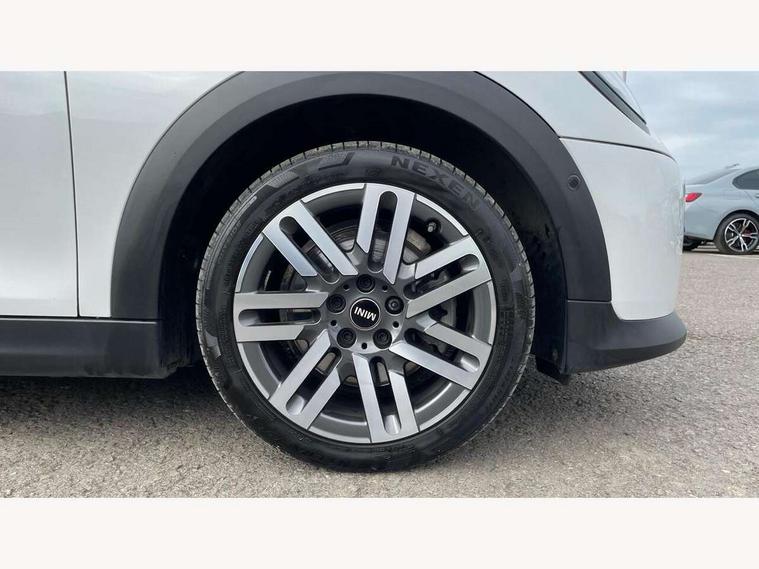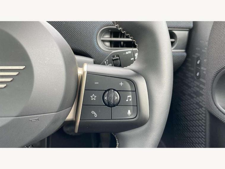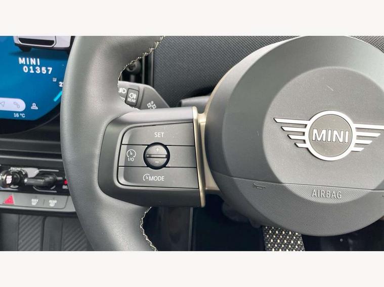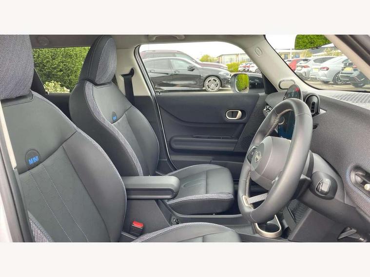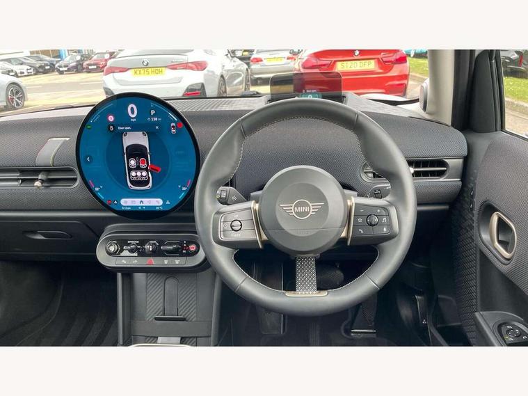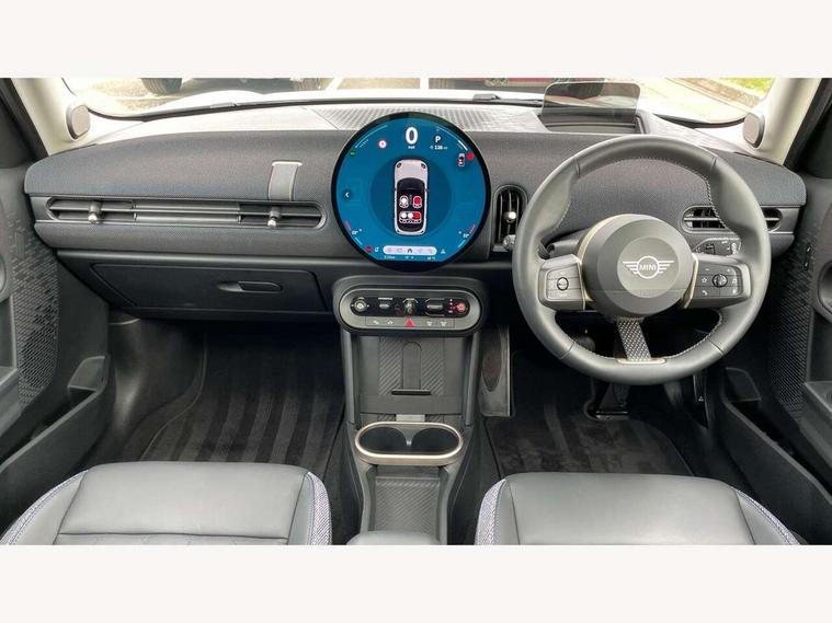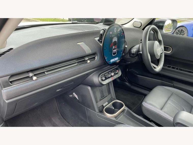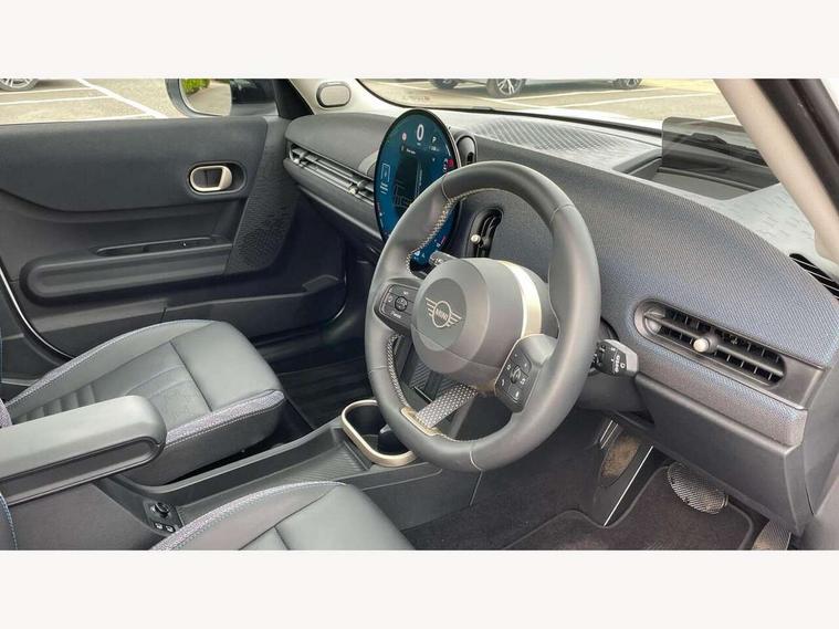Central toggle bar, Circular OLED Screen, Compatible mobile phone bluetooth with audio streaming, Cruise control, Digital instrument cluster, Electro-mechanical speed dependant steering assistance, Emergency call service, MINI Experience Modes, Mini navigation system, On board computer, Service interval indicator, Tailgate, 7 speed steptronic transmission with double clutch, DAB Digital radio, Personal eSim, Auto headlights, Electric adjustable heated door mirrors, Electric front+rear windows, Heated rear window, Heated windscreen washer jets, LED 3rd brake light, LED daytime running lights, LED Headlights, LED indicator lights, LED rear lights, Rain sensor window wipers, Rear fog lights, Rear side wing doors, Rear window wiper, 2 zone automatic air conditioning, 3 seat bench in 2nd row, 60/40 rear seat bench, Ambient lighting, Cupholders, Front and rear floor mats, Front and rear head restraints, Front compact armrest, Heated steering wheel, Height adjustable passenger seat, Light headliner, Luggage compartment lighting, Single front passenger seat, Sport Vescin Steering Wheel black with vibrant silver accents, Sunvisors with vanity mirrors, Vescin/Cloth upholstery includes dash knit in black with blue accents, Driving assistant pack - Cooper Hatchback, Park assistant pack - Cooper Hatchback, 3 point seatbelts on all five seats, 6 Airbags - front, side, head and seat belt tensioners, Anti-lock braking system (ABS), Child locks on rear doors, DSC - Dynamic Stability Control, Electronic parking brake, Front and rear disc brakes, Front ISOFIX (iSize), Front passenger airbag deactivation, Traction control, Tyre pressure monitoring system, Alarm, Immobiliser, Remote central locking, Tyre repair kit,