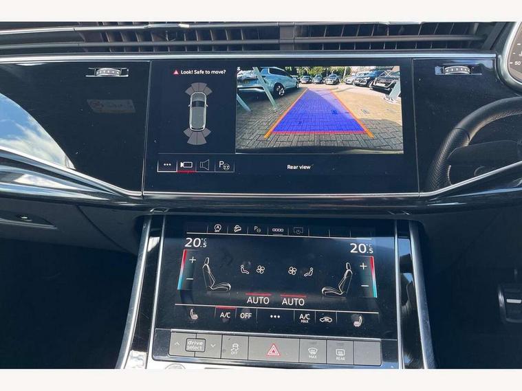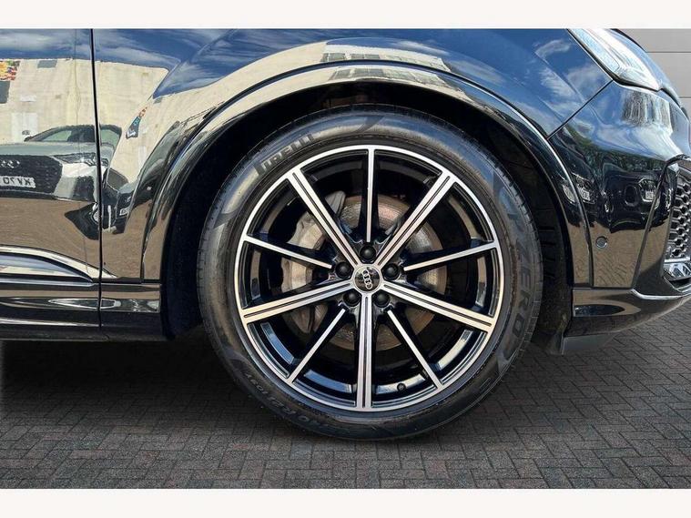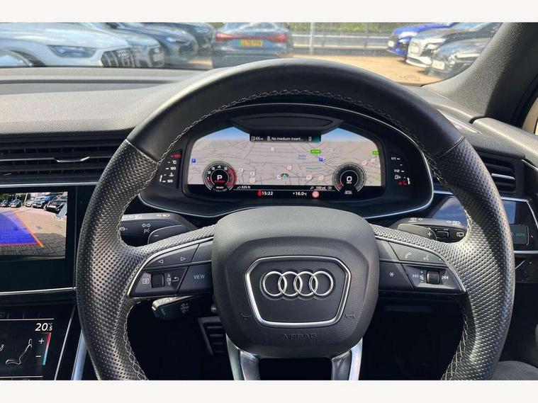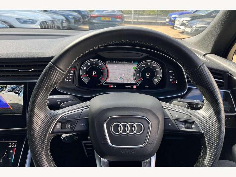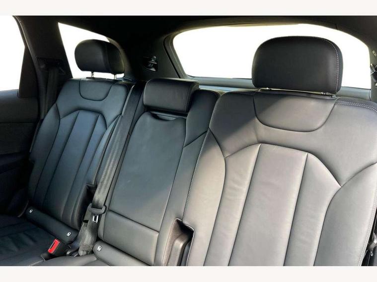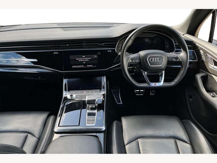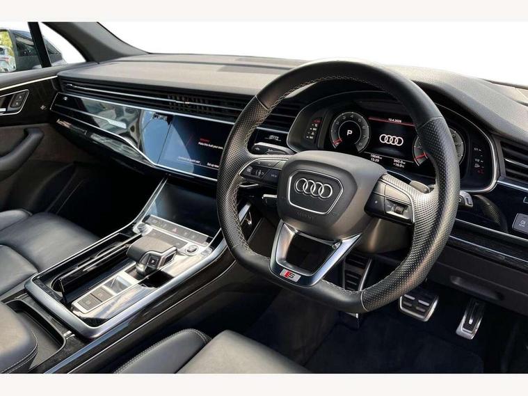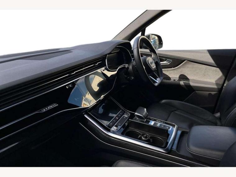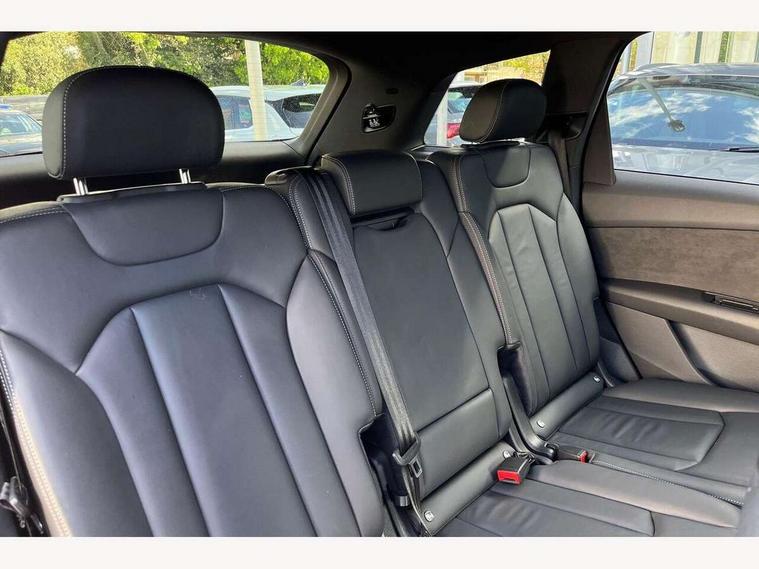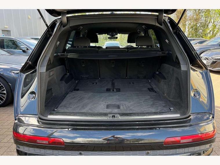 Audi connect safety and service (e-call), Audi connect with Amazon Alexa Integration, Audi drive select (Auto, Comfort, Dynamic, Efficiency, Individual, Off-road and All road), Bluetooth interface, Camera based traffic sign recognition, Electromechanical steering, MMI navigation plus with MMI touch screens includes 10.1" and 8.6" screens with haptic feedback, Natural voice recognition, Parking system plus with 360 degree display (front, rear and side sensors) - acoustic and visual park assist system, Power operated tailgate, Rear view camera, Smartphone interface includes wireless Apple carplay/Android Auto, Start/stop system, 48V Mild hybrid technology, 85 litre fuel tank, Adaptive air sports suspension, Quattro all wheel drive with self locking centre differential, Audi music interface - front 2 USB-C ports with charger and data functions, Audi sound system with 6 channel amplifier, 180 watt amplifying capacity and 10 loudspeakers including subwoofer, DAB digital radio module, 3rd brake light, Audi matrix LED headlights with dynamic front and rear indicators, Auto dimming frameless rear view mirror, Black roof rails, Bumpers in contrast paint scandium grey finish includes door trim and wheel arch trim strips, inlays in door strip contain quattro embossing, Electrically adj heated/folding + automatically dimming exterior mirrors with memory + automatic kerb side function for passenger side exterior mirror, Heat insulating glass in windshield, Integrated LED indications in door mirrors, LED daytime running lights, LED rear tail lights, Privacy glass - dark tinted rear and rear side windows from B-pillar backwards, Rear side wing doors, Rear wiper, 2 seat bench in 3rd row, 3 seat bench in 2nd row, 4 zone deluxe automatic climate control, 7 seat layout with ISOFIX points for the front passenger seat and rear passenger seat, Black cloth headlining, Comfort front centre armrest, Electric adjustable front seat with 4 way lumbar support, driver memory functionality, Folding rear seats, Front head restraints, Front/rear floor mats, Heated front seats, Illuminated door sill trims with S logo, LED interior ambient lighting, Luggage compartment cover, Luggage compartment sill protection in stainless steel, Rear head restraints, Single front passenger seat, Stainless steel pedals, Sunvisors with illuminated vanity mirrors, Titanium black styling pack - Q7/SQ7, 3 point seatbelts on all rear seats, Audi pre sense front, Child locks on rear doors, Driver and front passenger, front side and curtain airbags, Electromechanical parking brake, Electronic Stabilisation Control (ESC) including ABS, ASR and EDL, Extended pedestrian protection measures, Hill hold assist, Seatbelt monitoring, Tyre pressure loss indicator, Warning triangle and first aid kit, Anti theft alarm, Anti-theft wheel bolts and wheel loosening detection, Keyless Go, Remote central locking, Polished oak trim with grey finish inlay, Tool kit, Tyre repair kit,