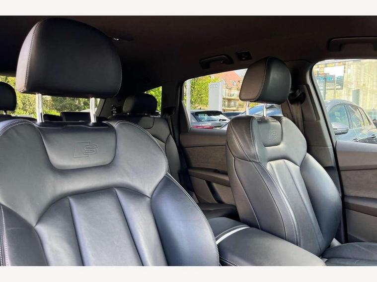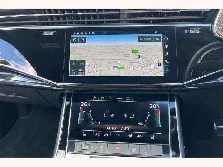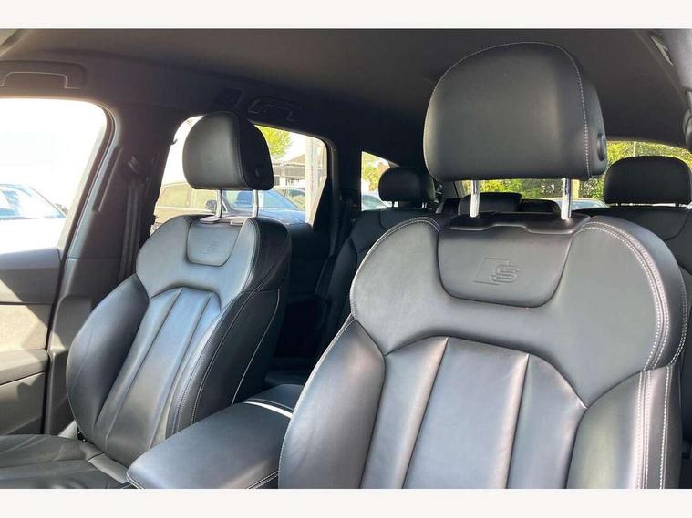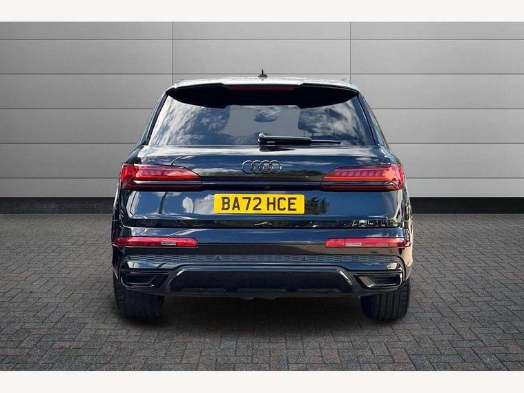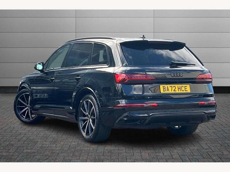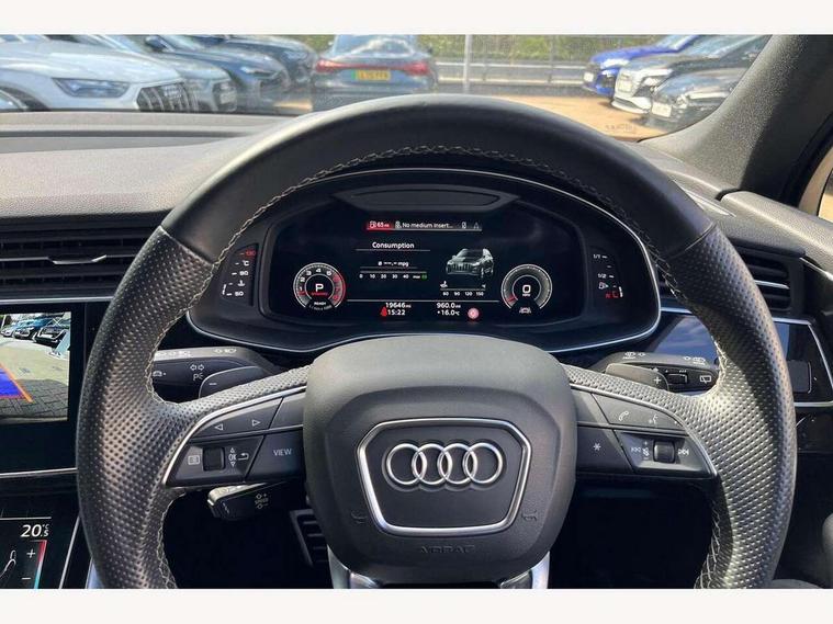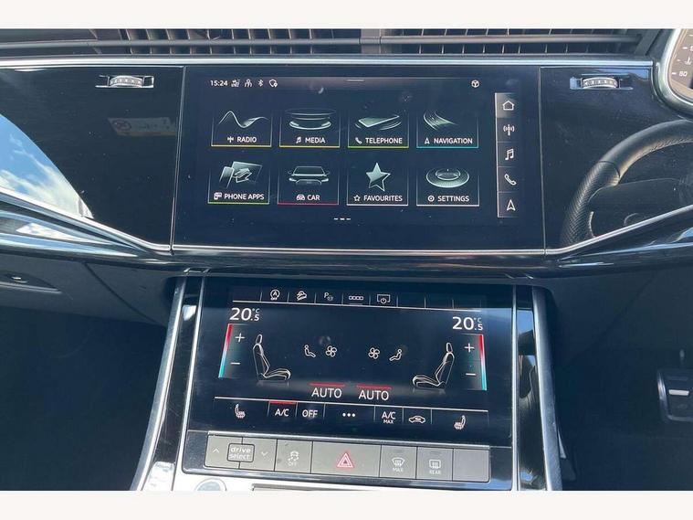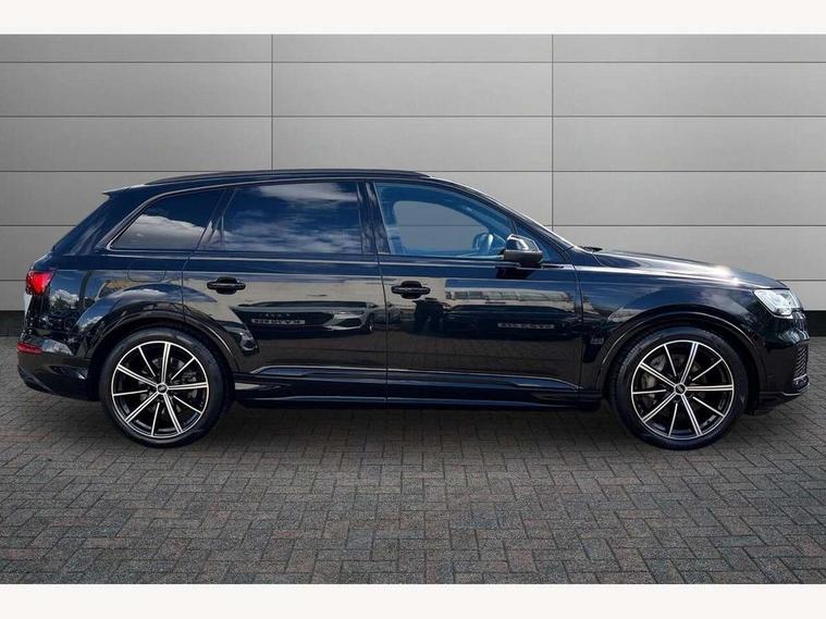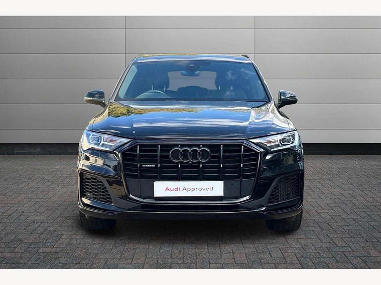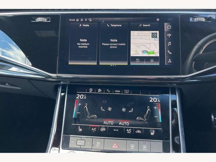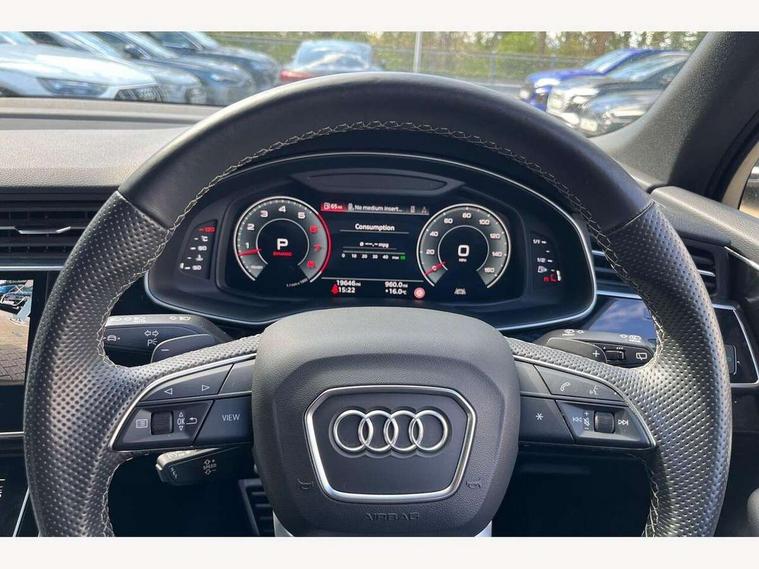 Audi connect safety and service (e-call), Audi connect with Amazon Alexa Integration, Audi drive select (Auto, Comfort, Dynamic, Efficiency, Individual, Off-road and All road), Bluetooth interface, Camera based traffic sign recognition, Electromechanical steering, MMI navigation plus with MMI touch screens includes 10.1" and 8.6" screens with haptic feedback, Natural voice recognition, Parking system plus with 360 degree display (front, rear and side sensors) - acoustic and visual park assist system, Power operated tailgate, Rear view camera, Smartphone interface includes wireless Apple carplay/Android Auto, Start/stop system, 48V Mild hybrid technology, 85 litre fuel tank, Adaptive air sports suspension, Quattro all wheel drive with self locking centre differential, Audi music interface - front 2 USB-C ports with charger and data functions, Audi sound system with 6 channel amplifier, 180 watt amplifying capacity and 10 loudspeakers including subwoofer, DAB digital radio module, 3rd brake light, Audi matrix LED headlights with dynamic front and rear indicators, Auto dimming frameless rear view mirror, Black roof rails, Bumpers in contrast paint scandium grey finish includes door trim and wheel arch trim strips, inlays in door strip contain quattro embossing, Electrically adj heated/folding + automatically dimming exterior mirrors with memory + automatic kerb side function for passenger side exterior mirror, Heat insulating glass in windshield, Integrated LED indications in door mirrors, LED daytime running lights, LED rear tail lights, Privacy glass - dark tinted rear and rear side windows from B-pillar backwards, Rear side wing doors, Rear wiper, 2 seat bench in 3rd row, 3 seat bench in 2nd row, 4 zone deluxe automatic climate control, 7 seat layout with ISOFIX points for the front passenger seat and rear passenger seat, Black cloth headlining, Comfort front centre armrest, Electric adjustable front seat with 4 way lumbar support, driver memory functionality, Folding rear seats, Front head restraints, Front/rear floor mats, Heated front seats, Illuminated door sill trims with S logo, LED interior ambient lighting, Luggage compartment cover, Luggage compartment sill protection in stainless steel, Rear head restraints, Single front passenger seat, Stainless steel pedals, Sunvisors with illuminated vanity mirrors, Titanium black styling pack - Q7/SQ7, 3 point seatbelts on all rear seats, Audi pre sense front, Child locks on rear doors, Driver and front passenger, front side and curtain airbags, Electromechanical parking brake, Electronic Stabilisation Control (ESC) including ABS, ASR and EDL, Extended pedestrian protection measures, Hill hold assist, Seatbelt monitoring, Tyre pressure loss indicator, Warning triangle and first aid kit, Anti theft alarm, Anti-theft wheel bolts and wheel loosening detection, Keyless Go, Remote central locking, Polished oak trim with grey finish inlay, Tool kit, Tyre repair kit,