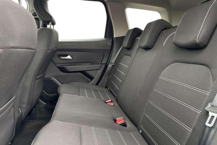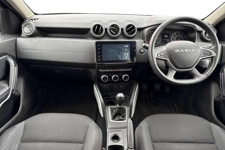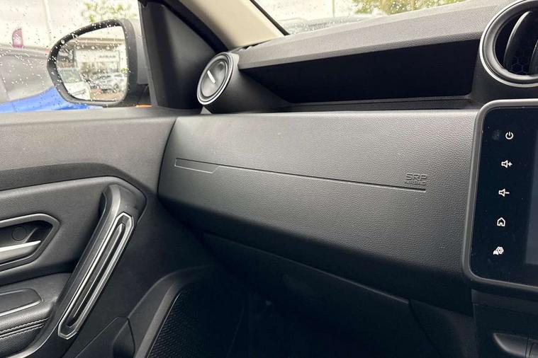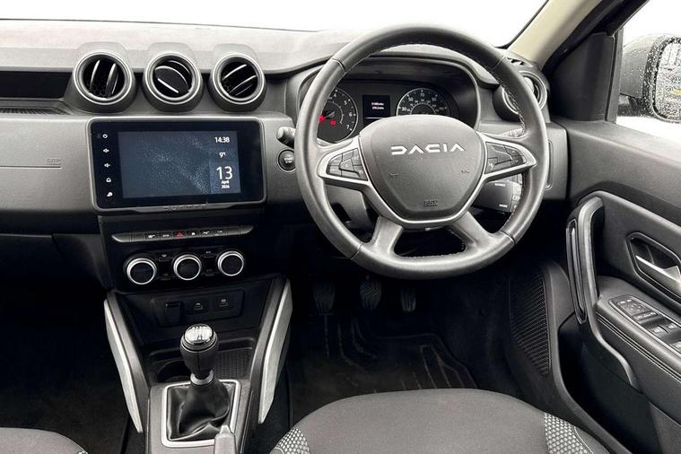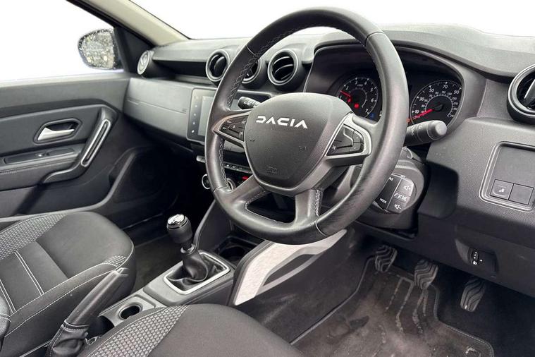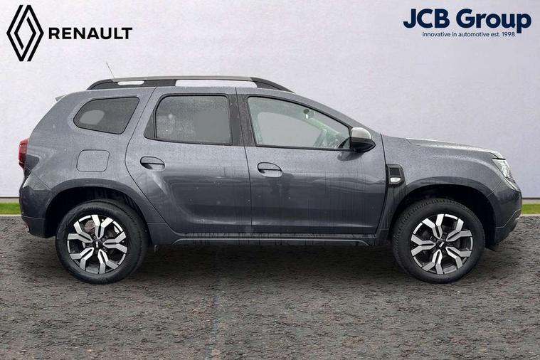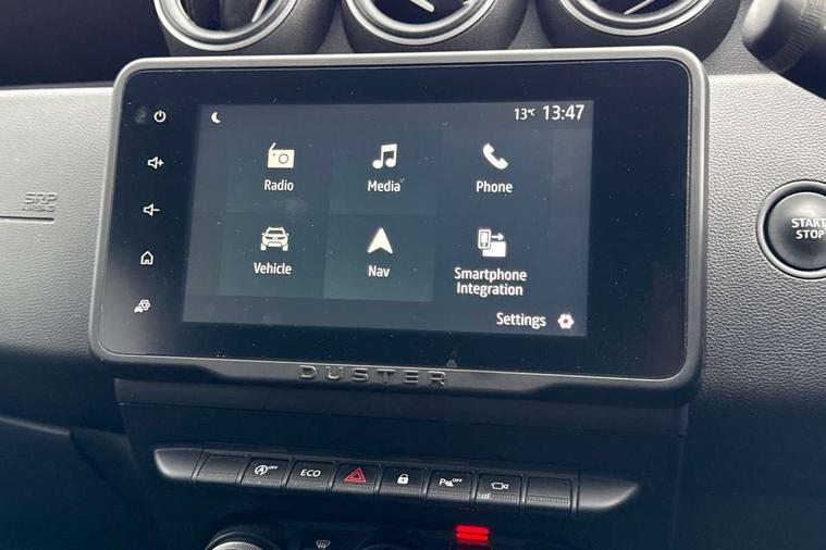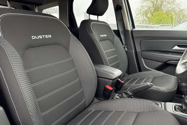 Blind spot warning, Cruise control and speed limiter, eCall emergency system, Eco mode, Electric power assisted steering, Multi view camera, On board computer, odometer, trip computer, average fuel consumption, average speed, service indicator, outside temperature gauge, Rear parking sensors, Rev counter, Reversing camera, Stop/start system, 8" Media Navigation with wireless smartphone replication, Dacia plug and radio/MP3/USB/bluetooth/DAB/steering wheel control, 3 speed windscreen wipers, Acoustic windshield, Automatic front wipers, Black side sills, Black/satin chrome tailgate trim with Duster inscription in black background and lettering, Body coloured door handles, Chrome front grille with hot stamping, Chrome logo surround on steering wheel, Dark glass on lateral rear windows, Daytime running lights, Drivers window one touch up/down, Dusk sensor, Electric adjustable/heated door mirrors, Electric folding door mirrors, Electric front windows, Electric rear windows, Front and rear body coloured bumpers, Front door sill protection strip, Front fog lights, Grey quartz longitudinal roof bars with Duster inscription, Heated rear window, High level third rear brake light, Modular roof bars, Rain sensor, Rear side wing doors, Rear spoiler, Rear wash/wipe, Satin chrome door mirrors, Underbody protection skid plates, Y shaped LED headlights with rear LED lights, 3 rear height adjustable headrests, 3 seat bench in 2nd row, 60/40 split folding rear seat, Automatic air conditioning, Backlighted steering wheel buttons, Boot light, Driver seat lumbar adjustment, Fabric decorative insert on door panels, Fabric upholstery, Front head restraints, Front passenger reading light, Gear shift indicator, Glovebox light, Heated seats, Height adjustable driver seat, Height adjustable front and rear headrests, Height and depth adjustable steering wheel, High centre console with driver armrest, Isofix points for child seats in both outer rear seats, Map pocket on front seat backs, Passenger sunvisor with vanity mirror, Rear passenger reading light, Satin chrome gear lever cap insert, Satin chrome interior door handles, Satin chrome lower steering wheel insert, Single front passenger seat, Soft feel leather steering wheel, 3x3 point rear seatbelts, ABS and Emergency brake assist, ASR traction control with Electronic stability control, Child locks on rear doors, Door open visual and audible warning, Driver airbag, Driver and passenger seatbelt not fastened - visual and audible warning, EBD - Electronic brakeforce distribution, Front passenger airbag, Front passenger airbag deactivation, Front seatbelt pretensioners, Front side airbags, Height adjustable front seatbelts, Hill start assist, Tyre pressure monitor, Keyless entry, Remote central locking, Thatcham approved engine immobiliser, Charcoal grey central console surround, Matt black central console fascia, Matt black decorative insert on rear door panels, Piano black decorative insert on front door panels, Satin chrome air vent surround, Satin chrome instrument dial surrounds, 17" Alloy wheels,