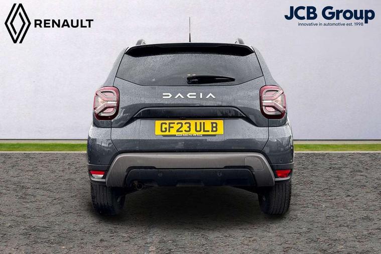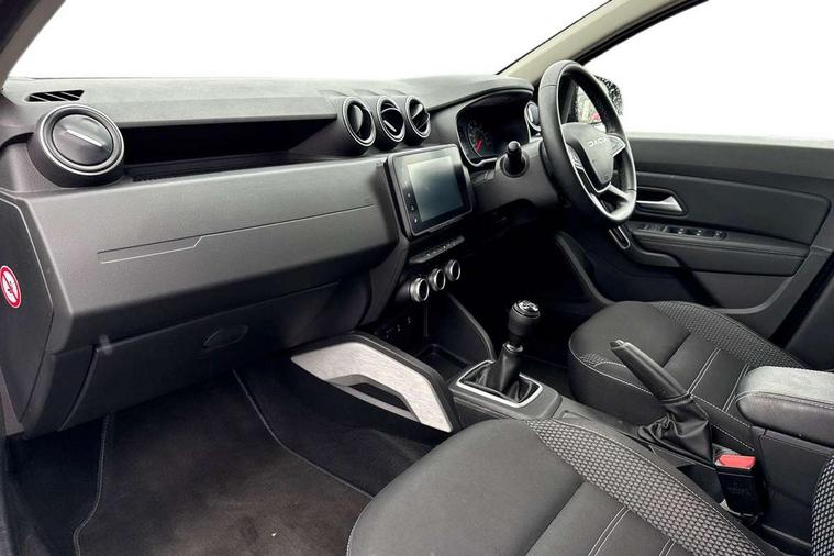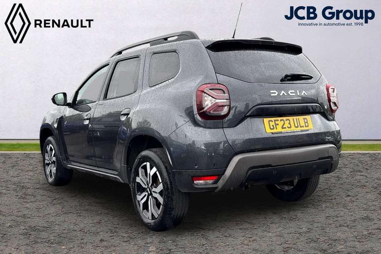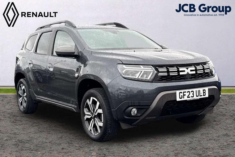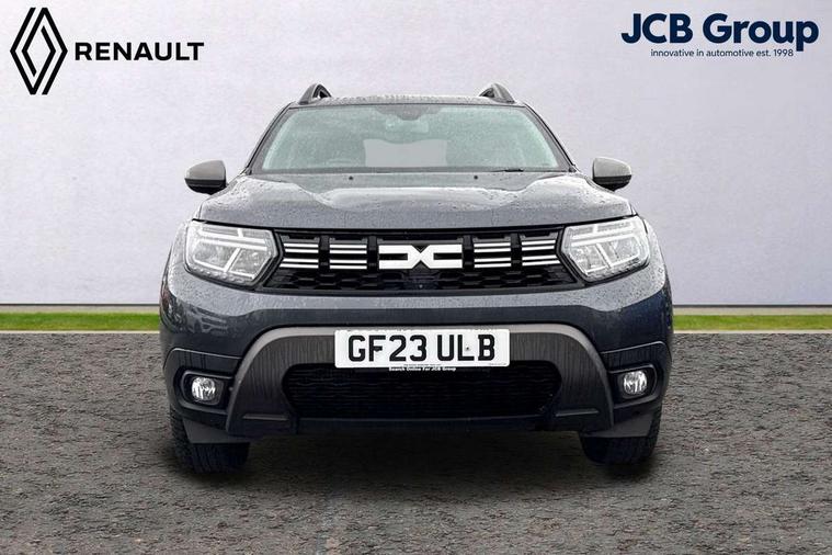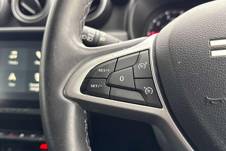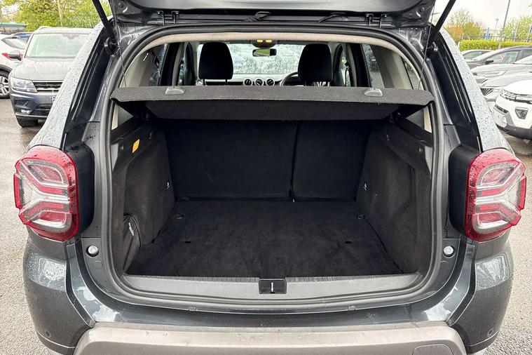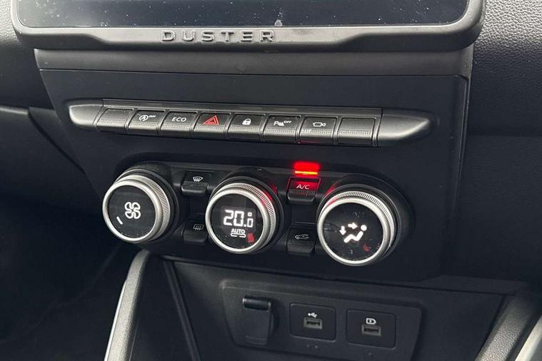 Blind spot warning, Cruise control and speed limiter, eCall emergency system, Eco mode, Electric power assisted steering, Multi view camera, On board computer, odometer, trip computer, average fuel consumption, average speed, service indicator, outside temperature gauge, Rear parking sensors, Rev counter, Reversing camera, Stop/start system, 8" Media Navigation with wireless smartphone replication, Dacia plug and radio/MP3/USB/bluetooth/DAB/steering wheel control, 3 speed windscreen wipers, Acoustic windshield, Automatic front wipers, Black side sills, Black/satin chrome tailgate trim with Duster inscription in black background and lettering, Body coloured door handles, Chrome front grille with hot stamping, Chrome logo surround on steering wheel, Dark glass on lateral rear windows, Daytime running lights, Drivers window one touch up/down, Dusk sensor, Electric adjustable/heated door mirrors, Electric folding door mirrors, Electric front windows, Electric rear windows, Front and rear body coloured bumpers, Front door sill protection strip, Front fog lights, Grey quartz longitudinal roof bars with Duster inscription, Heated rear window, High level third rear brake light, Modular roof bars, Rain sensor, Rear side wing doors, Rear spoiler, Rear wash/wipe, Satin chrome door mirrors, Underbody protection skid plates, Y shaped LED headlights with rear LED lights, 3 rear height adjustable headrests, 3 seat bench in 2nd row, 60/40 split folding rear seat, Automatic air conditioning, Backlighted steering wheel buttons, Boot light, Driver seat lumbar adjustment, Fabric decorative insert on door panels, Fabric upholstery, Front head restraints, Front passenger reading light, Gear shift indicator, Glovebox light, Heated seats, Height adjustable driver seat, Height adjustable front and rear headrests, Height and depth adjustable steering wheel, High centre console with driver armrest, Isofix points for child seats in both outer rear seats, Map pocket on front seat backs, Passenger sunvisor with vanity mirror, Rear passenger reading light, Satin chrome gear lever cap insert, Satin chrome interior door handles, Satin chrome lower steering wheel insert, Single front passenger seat, Soft feel leather steering wheel, 3x3 point rear seatbelts, ABS and Emergency brake assist, ASR traction control with Electronic stability control, Child locks on rear doors, Door open visual and audible warning, Driver airbag, Driver and passenger seatbelt not fastened - visual and audible warning, EBD - Electronic brakeforce distribution, Front passenger airbag, Front passenger airbag deactivation, Front seatbelt pretensioners, Front side airbags, Height adjustable front seatbelts, Hill start assist, Tyre pressure monitor, Keyless entry, Remote central locking, Thatcham approved engine immobiliser, Charcoal grey central console surround, Matt black central console fascia, Matt black decorative insert on rear door panels, Piano black decorative insert on front door panels, Satin chrome air vent surround, Satin chrome instrument dial surrounds, 17" Alloy wheels,