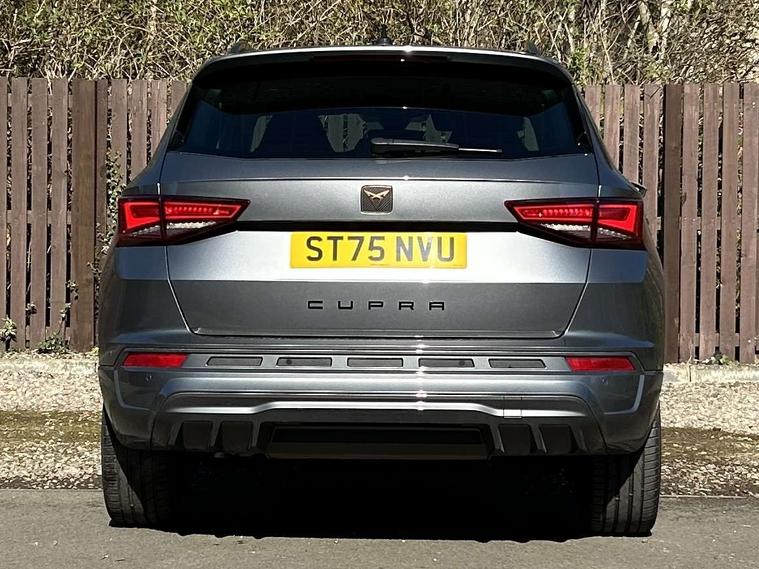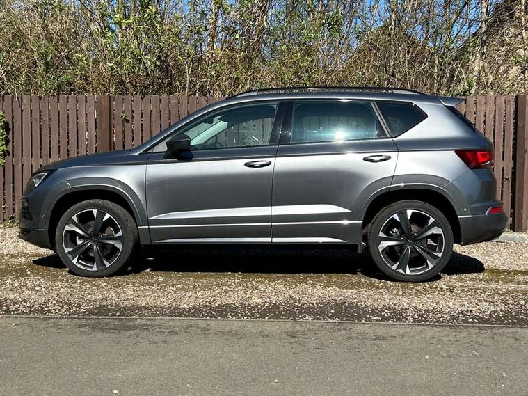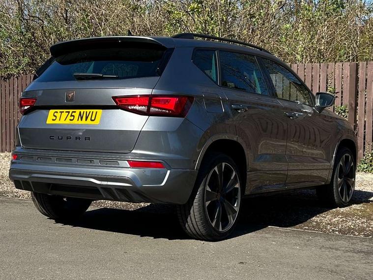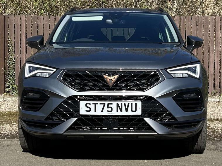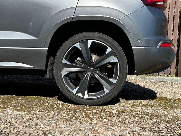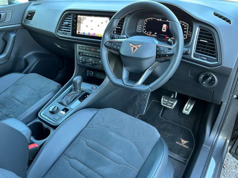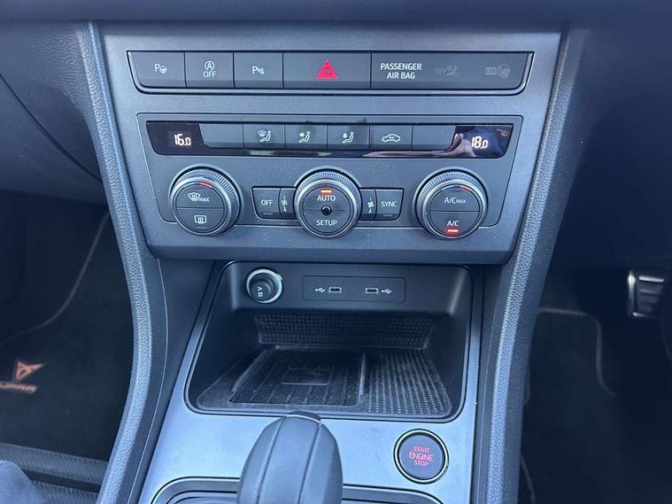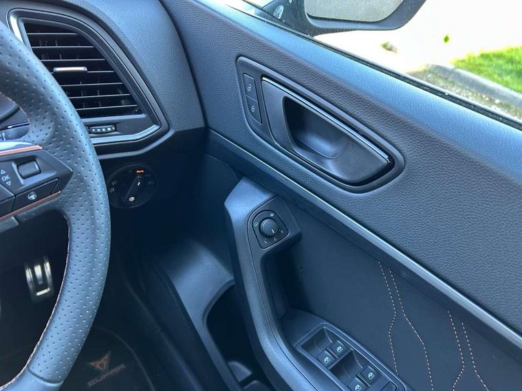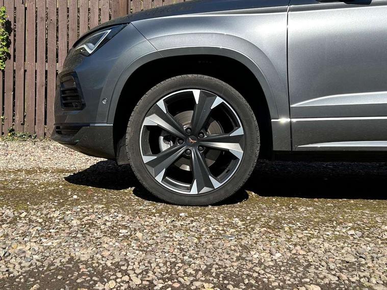 Cruise control system with speed limiter, Digital cockpit, Driving profile selection and conventional shock absorber, E-call, Outside temperature gauge, Progressive power assisted steering, Self parking functionality (includes front and rear parking sensors), Trip computer, wired and wireless full link smartphone integration, Front and rear shock absorption, chassis with increased ride height, Steering wheel mounted audio/phone controls, Body colour bumpers with dark aluminium diffusor, Body coloured wheel arch surrounds, Dark tinted rear windows, Daytime running lights, Door mirrors with welcome CUPRA light silhouette, Dynamic headlight range control with self adjusting whilst driving, Electric adjustable/heated/folding door mirrors, Front and rear electric windows, Front grille frame in chrome, Full LED headlamps with lens and LED front fog lamps with cornering function, Gloss black door mirrors, Gloss black roof rails, Gloss black side mouldings, Gloss black side window trim, Illuminated aluminium front door sill, LED rear tail lights with dynamic indicators, Rear fog lights, Rear side wing doors, Rear spoiler, Rear wash/wipe, Specific CUPRA design front bumper, Standard rear exhaust tailpipes, Third brake light, 12V socket in front, 3 seat bench in 2nd row, 60/40 split folding rear seat, Aluminium pedals, Bucket sport seats in dinamica upholstery, Cupra steering wheel emblem, Document holder under right front seat, Dual zone climate control, Front and rear head restraints, Front centre armrest, Front seat back storage pockets, Grey roof lining, Heated steering wheel, Height adjustable driver and passenger seat with lumbar adjustment, ISOFIX points in outer rear seats with top tether anchorage points, Leather steering wheel and gear knob, Multicoloured ambient lighting with LED interior illumination, Pedal cluster, Rear armrest and easy back seat release mechanism from boot, Single front passenger seat, Sports steering wheel, Steering wheel mounted gearshift paddles, Storage compartment in roof console for sunglass, Storage compartment under driver's seat, Convenience pack - Ateca, Interior lighting pack - Ateca, Navigation system plus pack with DAB - Ateca, Safety and driving pack - Ateca, 3x3 point rear seatbelts, ABS, Traction control system (TCS), Electronic stability control (ESC) and Electronic differential lock system (XDS), Airbags - Driver and front passenger airbag with deactivation, front side, two curtain and driver's knee airbags, Black brake callipers with CUPRA logo, Electric parking brake with auto hold function, Front and rear seatbelt reminder, Front assist with autonomous emergency braking, Hill hold control, Manual rear child locks, Single tone horn, Tiredness recognition system, Tyre pressure monitoring system, Alarm, Keyless entry, Locking wheel bolts, 19" Sport machined alloy wheels in black/silver,