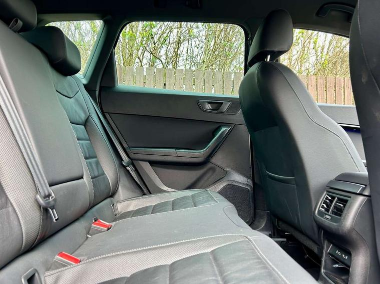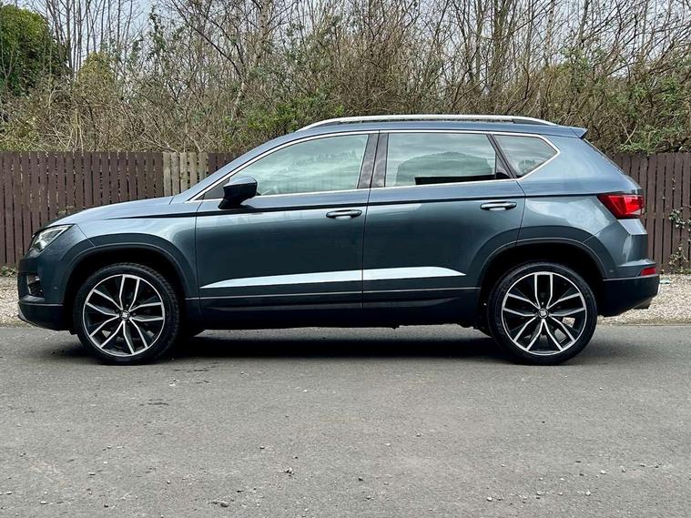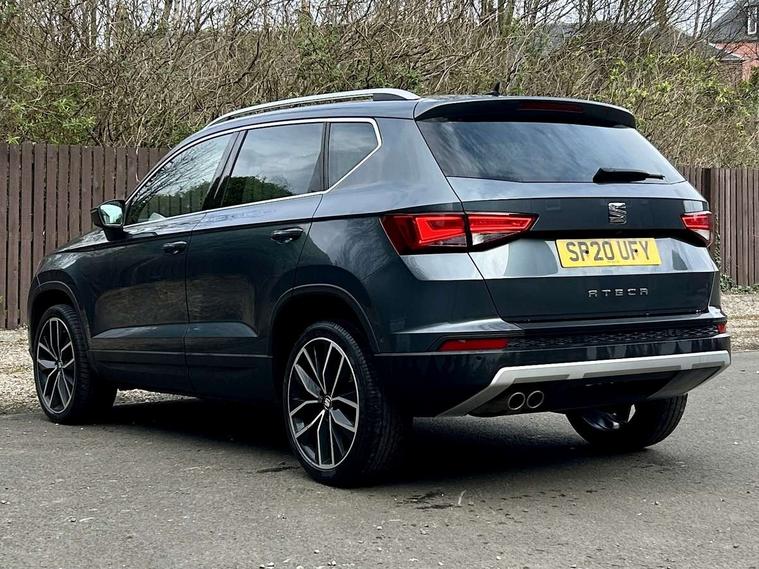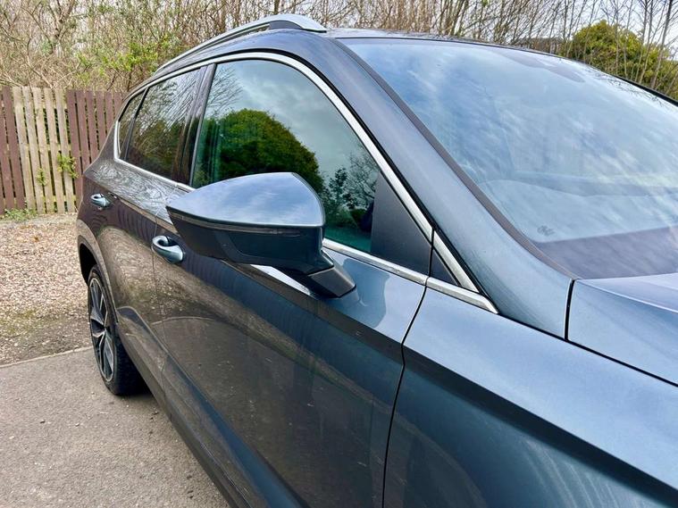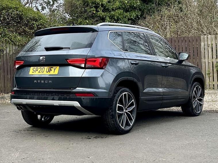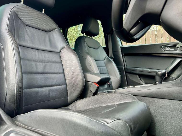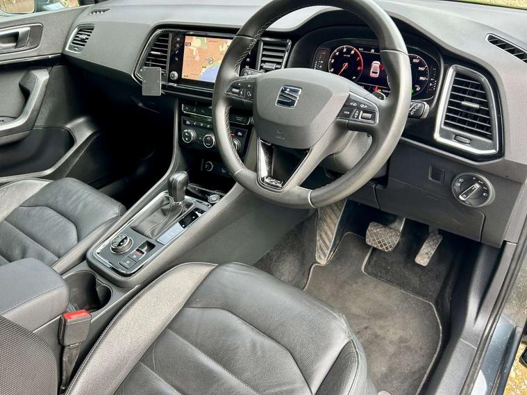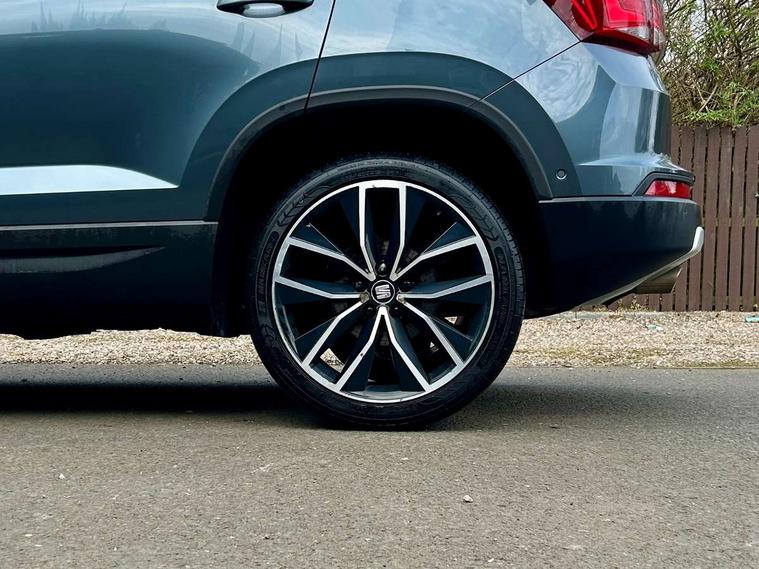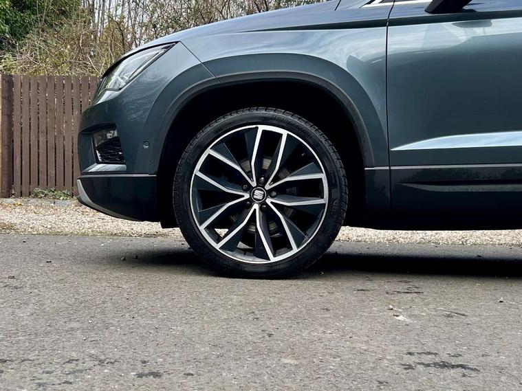 'Lights On' Reminder warning buzzer, Adaptive cruise control, Digital clock, Digital cockpit, Driver alert system, Electric tailgate with virtual pedal, Front assist city emergency braking and pedestrian protection, Full Link Smartphone Integration with Mirror Link, Apple Car Play, Google Android Auto, Low fuel warning light, Multi function display, Outside temperature gauge, Power assist steering, Rear view camera, Remote fuel flap release, RPM counter, Satellite navigation system, SEAT drive profile with driving experience button, SEAT logo boot release, Self parking functionality (includes front and rear parking sensors), Top view camera, Trip computer, Wash water level indicator, Comfort suspension, XDS electronic differential lock, SEAT USB media cable, Steering wheel mounted audio/phone controls, Aluminium front door sills, Armrest with air outlet in rear, Auto dimming rear view mirror, Auto headlights with automatic coming and leaving home function, Black wheel arch extensions, Body colour bumpers, Body colour door handles, Body colour door mirrors, Chrome front grille frame, Chrome roof rails, Chrome side window trim, Dark tinted rear windows, Door mirrors with welcome light silhouette, Electric adjustable/heated/folding door mirrors, Frameless interior mirror, Front and rear electric windows, Front grille in glossy black, Full LED headlights, Headlight washers, Heated windscreen, Illuminated aluminium front door sill with trim logo, LED daytime running lights, LED front fog lights, Rear fog lights, Rear LED tail lights, Rear wash/wipe, Twin chromed exhaust pipes, Visible dual exhaust pipes, 12V socket in front, 4 Lashing eyes in boot, 60/40 split folding rear seat, Adjustable front armrest with storage compartment, Ambient spot lighting and front footwell illumination, Black roof lining, Driver and passenger seats, height-adjustable, with lumbar adjustment and height-adjustable headrests, Driver and passenger sun visor, covered and illuminated mirror, driver sun visor with card holder, Dual zone climate control, Front and rear head restraints, Front courtesy lights, Front cupholders, Front reading lights, Front seat back storage pockets, Gear shift indicator, Heated front seats, Illuminated boot, Illuminated glovebox, Instrument lighting with brightness control, ISOFIX points in outer rear seats with top tether anchorage points, Leather steering wheel and gear knob, Leather upholstery with front sports seats, Multicoloured ambient lighting with LED interior illumination, Rear armrest and easy back seat release mechanism from boot, Rear reading lights, Steering wheel gearshift paddles, Storage box under drivers seat, Advanced Driving Assistance Pack - Ateca Xcellence, Convenience pack - Ateca, Navigation system pack - Ateca, Winter Pack - Ateca, 3x3 point rear seatbelts, ABS, Automatic post collision braking, Driver/Front Passenger airbags, Drivers knee airbag, Electronic parking brake with auto hold, Electronic stability control, ESP+EBA, Front and rear seatbelt reminder, Front passenger airbag deactivation, Front side airbags, Hill hold control, Tiredness recognition system, Traction control, Twin curtain airbags, Tyre pressure monitoring system, 2 folding remote keys with window open/close function, Immobiliser, Keyless entry and go and connectivity hub with wireless charger, Locking wheel bolts, Remote central locking, Volumetric alarm with back up horn, Chrome interior detailing, 19" Exclusive machined bi-colour alloy wheels,