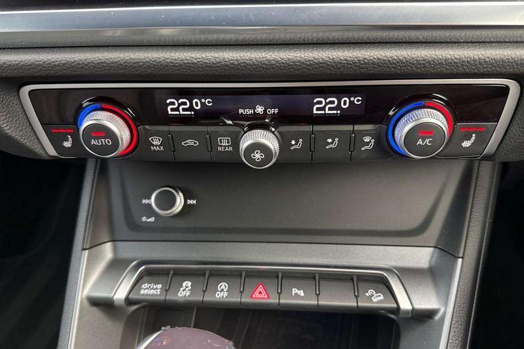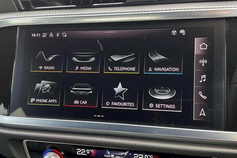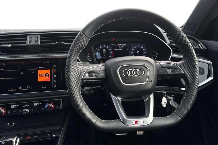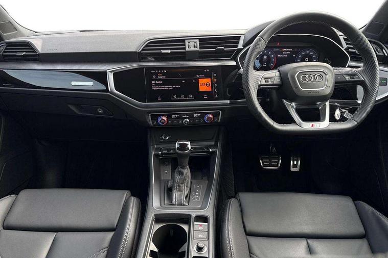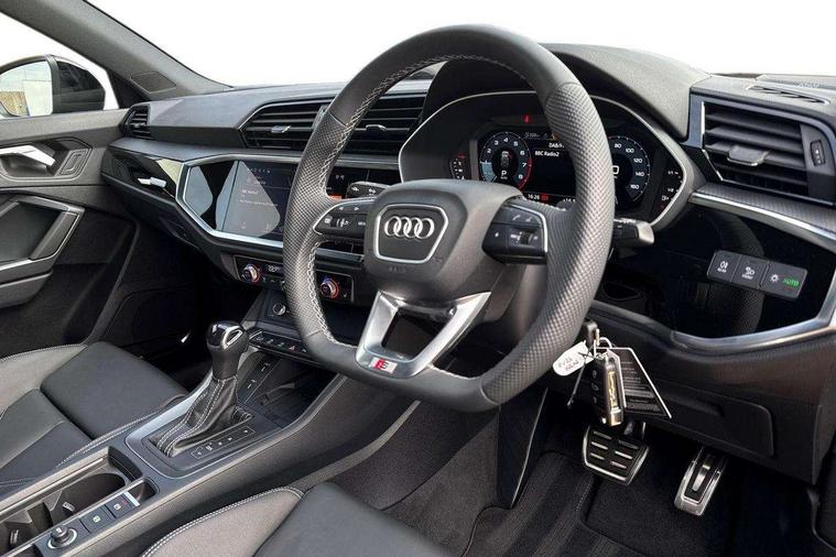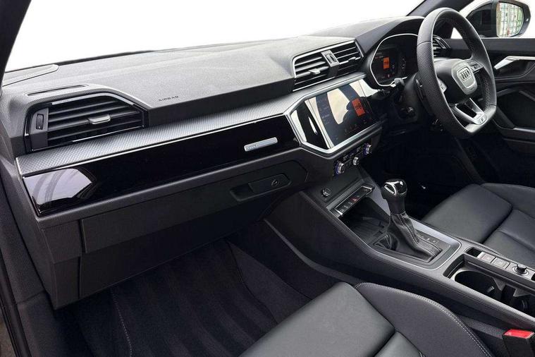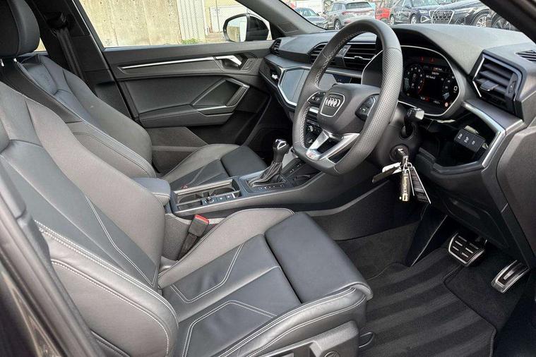 Amazon alexa Integration, Audi connect safety and service, Audi drive select, Audi lane departure warning, Audi Virtual Cockpit - 10.25" display, Bluetooth interface, Camera based traffic sign recognition, Distraction and Fatigue warning, Legal emergency call, MMI Navigation Plus with high resolution 10.1 inch touchscreen colour display, Power operated tailgate, Progressive steering, Service interval indicator, Smartphone interface includes wireless Apple carplay/Android Auto, Start stop system with recuperation, Voice control system with natural language interaction, Sports suspension, 2 USB-C ports with charge and data functions, 6 passive loudspeakers, DAB digital radio module, Acoustic windscreen, Anthracite black radiator grille, Audi Beam uses LEDs to project the Audi logo onto the ground as you exit your Q3, Auto dimming door mirrors, Auto dimming frameless rear view mirror, Black roof rails, Electrically folding, adjustable and heated door mirrors with integrated LED side indicators and kerb view function for passenger side, Front and rear electric windows, Front fog lights, Grille vertical bars in aluminium silver/Matt, High gloss black finish B and C pillars, LED Dynamic rear indicators, LED headlights with LED daytime running lights, LED rear lights, LED third brake light, Privacy glass dark tinted rear and rear-side windows (from B-pillar backwards), Rain and light sensors, Rear diffuser grille in grained matt black, Rear diffuser strip in matt anthracite black, Rear side wing doors, Rear wiper, S line bumpers in contrasting Manhattan grey, Variable front intermittent wipers, 12V socket in rear centre console, 3 seat bench in 2nd row, 40:20:40 folding with manual adjustment for 60:40 forwards/backwards position and backrest angle, Adjustable rear seat bench/backrest with centre armrest and cupholder, Black carpet mats, Black cloth headlining, Dual zone electronic climate control, Electric lumbar support, Front and rear black floor mats with contrast stitching in rock grey, Front and rear headrests, Front centre armrest, Height and reach adjustable steering wheel, Illuminated door sill trims with S logo, ISOFIX child seat mounting for front passenger with airbag deactivation and outer rear seat including top tether attachment point for outer rear seats, Luggage compartment sill protection in stainless steel, Manual front seats with height adjustment, Perforated leather gearknob, Single front passenger seat, Stainless steel pedals, Twin leather upholstery with front sport seats + S embossing, Black styling pack - Q3, Non smoking pack - Q3, 3x3 point rear seatbelts, 6 airbags - Driver, front passenger, curtain and side windows, Audi pre-sense front with pedestrain and cyclist recognition, Electrically operated child locks on rear doors, Electromechanical parking brake, Electronic stabilisation control including ABS, ASR and EDL, Front seatbelt reminder, Hill descent control, Hill hold assist, Pre sense basic, Seatbelt monitoring, Tyre pressure warning, Warning triangle and first aid kit, Anti theft wheel bolts, Immobiliser, Remote central locking, Thatcham approved category 1 anti theft alarm, Aluminium look interior elements, Detail dashboard around MMI touch colour display in glass look, black with surround in aluminium look, Leatherette door armrest, Piano black inlay,