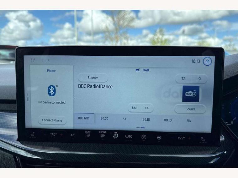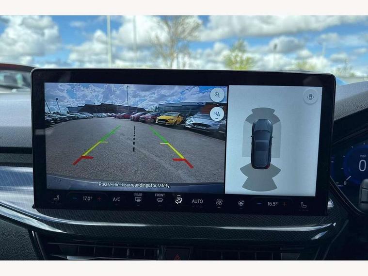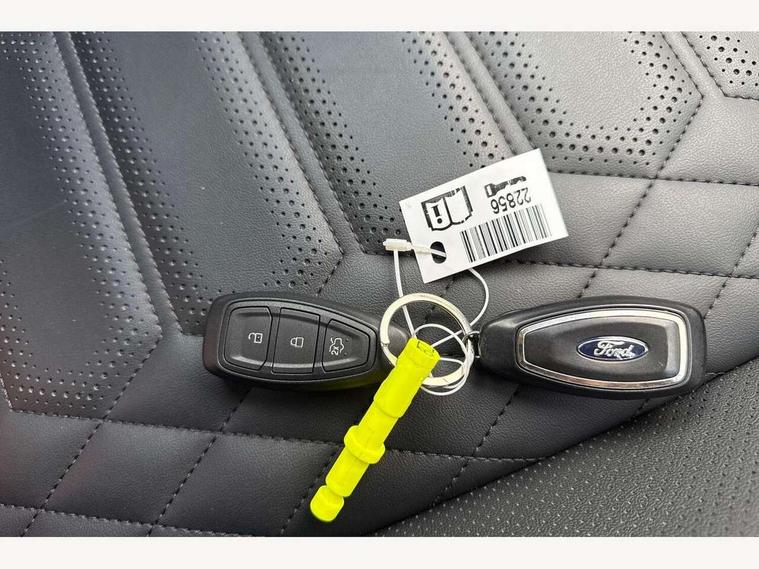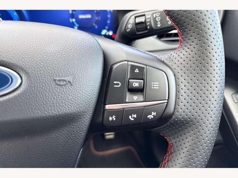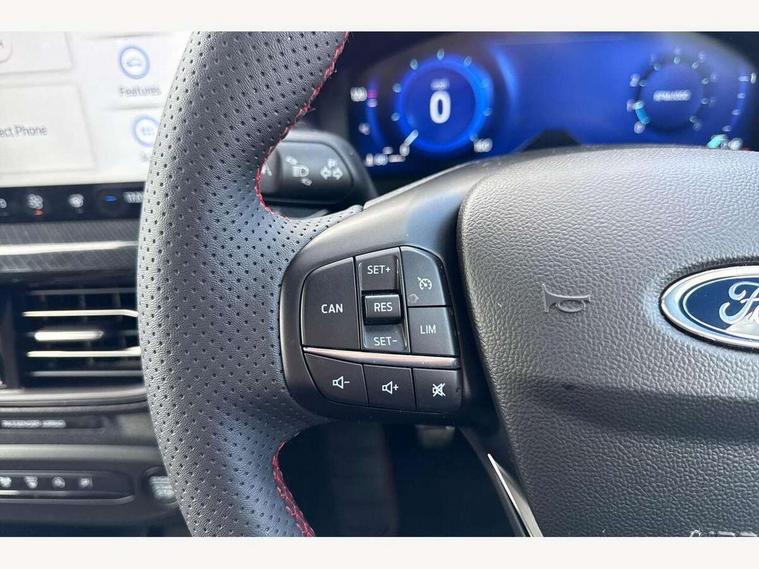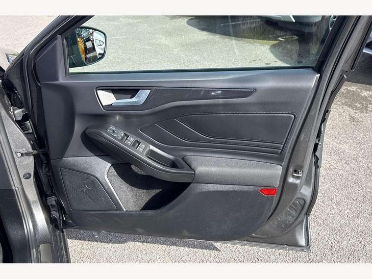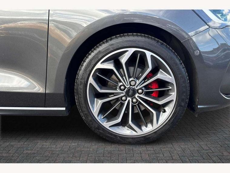 12.3" Digital instrument cluster, Bluetooth system, Digital clock, Easy fuel capless refuelling system, Eco mode, Ford SYNC4 Nav with 13.2'' touchscreen, DAB, Emergency Assistance, Apple Carplay & Android Auto, B&O Premium Audio with 10 speakers, FordPass Connect, Lane keeping system - lane keeping alert and lane keeping aid, PAS, Rev counter, Selectable drive mode, Service interval indicator, Trip computer, Wireless charging pad, Sports tuned suspension, 2 USB ports, Auto headlamps (on/off), Body coloured door handles, Electrically operated front and rear windows with one touch opening and closing, Electrically operated heated power fold door mirrors with puddle lamp with side indicators, Front variable intermittent wipers with electric wash, Heated rear window, LED daytime running lamp, LED rear lamps, LED third brake light, Polished twin tailpipe, Privacy glass, Quickclear heated windscreen, Rain sensor, Rear side wing doors, Tailgate wash/wipe, Unique ST-Line grille, full bodystyling kit, and large body coloured rear spoiler, 3 rear headrests, 3 seat bench in 2nd row, Dual zone electronic air temperature control, Full sensico premium upholstery, Height adjustable front headrests, Isofix child seat preparation, Load through ski hatch, Manual 4-way passenger seat adjusts, Power 4-way driver seat adjust, with power lumbar adjust, Reach + rake adjustable steering column, Single front passenger seat, Winter pack - Focus, 3x3 point rear seatbelts, ABS+Electronic Brake force Distribution, Auto hold function, Driver airbag, EDL traction control, Electronic parking brake, Electronic stability control, Front and rear seatbelt reminder, Front inertia reel height adjustable seatbelts with pre-tensioners, Front passenger airbag, Front side airbags, Passenger airbag deactivate switch, Post collision braking, Pre collision assist with autonomous emergency braking and pedestrian/cyclist detection, Red brake calipers, Remote/power child rear door locks, Side curtain airbags, Three rear inertia reel lap/diagonal seatbelts, Tyre pressure monitoring system, Keyless entry and keyless start, MyKey system, Remote central locking & engine immobiliser, Thatcham alarm with power door dead locks, 18" 5x3 spoke pearl grey high gloss machined finish alloy wheels with mini spare wheel,
