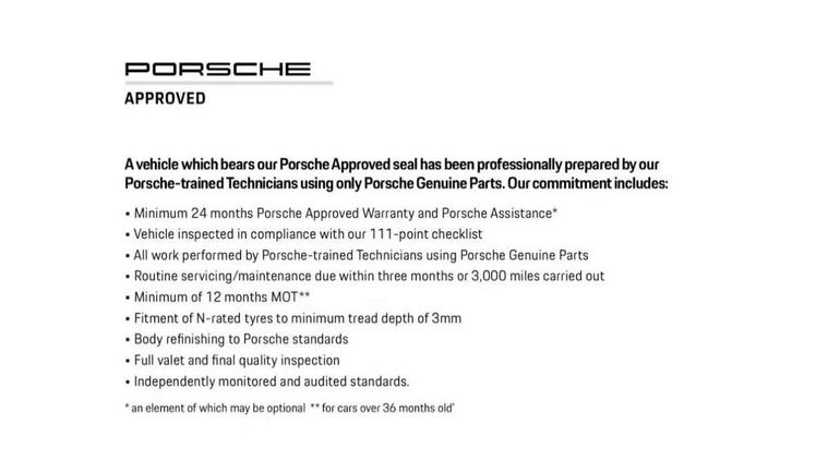Auto blip button to activate automatic rev-matching for downshifts, Auto start and stop system, Digital displays for vehicle speed, chosen gear, odometer, trip odometer and clock, Electromechanical direct steering with variable steering ratio, Instrument cluster with central rev counter and high-resolution 4.6 inch colour display, Performance orientated shift indicator in the colour display of the instrument cluster, 6 speed manual transmission with dual mass flywheel, 64 litre fuel tank, Adjustable chassis for race track use (toe, camber, anti-roll bars), Aluminium block and cylinder heads, Central cooler, Direct fuel injection (DFI), Dynamic gearbox mount system, Integrated dry-sump lubrication with an on-demand oil pump, Porsche Active Suspension Management (PASM) sport suspension with lowered 30mm ride height, Porsche stability management (PSM) including ABS with two switchable stages (SC OFF and SC+TC OFF), Porsche TORQUE Vectoring (PTV) with mechanical rear differential lock, Rear wheel drive, Shortened gear lever, Two seater vehicle with mid mounted engine, Two three-way catalytic converters and on-board diagnostics for monitoring emission control system and coated particulate filter, Variable intake manifold with two switchable resonance valves, VarioCam (camshaft control for inlet and exhaust valves) and adaptive cylinder management, Water cooled with thermal management, DAB Digital radio, Integrated 4G/LTE compatible SIM including data for the Porsche Connect Services, Navigation incl porsche + Apple Carplay, connect module, wireless internet access, carfinder, remote vehicle status, remote service and vehicle track, Auto deploying 718 Spyder specific rear wing, Automatic headlight activation including welcome home lighting, Black side air intakes, Body colour bumpers, Closed underbody panel with two additional ventilation openings (NACA) for exhaust system, Electrically adjustable heated exterior mirrors on door waist rails, aspherical on driver's side, Front apron with large cooling intakes with grilles and spoiler lip with recessed Spyder logo in black and central air outlet, Green tinted heat insulating glass, Grey top tinted windscreen, Intelligent lightweight body in Aluminium/Steel composite construction, LED auxiliary light units in the front end with position lights, direction indicators and side indicators, Manually operated lightweight hood with electric locking function and two rear fins, Net wind deflector, Power windows with one touch operation and door seal protection, Rear apron lower part in black with integrated rear diffuser, Tinted LED taillights and integral 4 point brake lights and reversing lights, Twin tract sports exhaust system with two tailpipe in stainless steel high gloss black, Two dynamic streamliners on aluminium rear lid, Windscreen washer system with aero wiper blades and washer jets, 12V sockets in passenger footwell and centre console storage compartment, 718 logo on gear lever, Adjustable fan with air recirculation and defroster functions, Ascending centre console with uncovered storage compartment and closed storage compartment, Clothes hooks on front seat backrests, Footwell illumination, Front and rear luggage compartments, Front headrests, Heated seats, LED reading lights, orientation, ignition lock, additionally luggage compartment and glove compartment lighting, Lockable glovebox, Performance display in Porsche communication management (PCM), Storage compartments in each doors, Two individual cup holders (Passenger side, integrated into dashboard trim strip), Chrono Pack - 718 Spyder, 3 point automatic seatbelts, ASR, Electrically controlled parking brake, Front seatbelt pretensioners + load limiters, Full size driver and passenger airbags, Lightweight spring strut front axle, anti-roll bar and suspension mountings partly ball jointed, Lightweight spring strut rear axle, helper springs, anti roll bar, suspension mountings partly ball jointed, Passenger airbag deactivate switch, Porsche side impact protection doors with thorax airbag in outer backrest side bolster and head airbag for driver/passenger in door panel, Tyre pressure monitoring system, Alarm system, Anti-theft wheel bolts, Remote central locking and engine immobiliser, 20" 718 Spyder alloy wheels in silver colour with sports tyres includes wheel centres with Porsche crest,