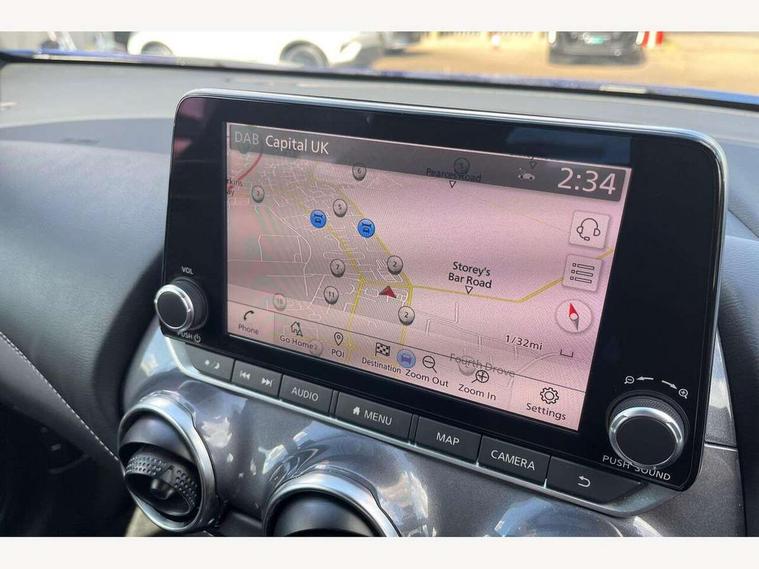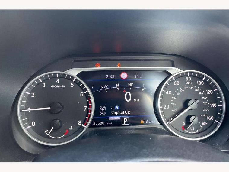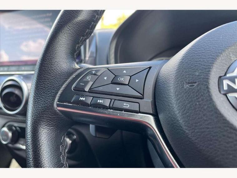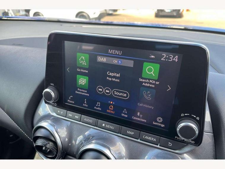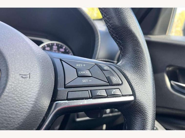 7" full colour TFT screen combimeter, Apple CarPlay and Google Android auto, Drive modes select (Eco, normal and sport), Emergency and breakdown call, Front parking sensor, Idle start/stop system, Intelligent lane intervention, Lane departure warning system, Nissan connect 8" touch screen entertainment system, Nissan connect nav with TomTom traffic, Nissan connect services and Wifi connection, Outside temperature sensor, Power Steering, Rear parking sensor, Traffic sign recognition, Trip computer, Voice recognition, Gasoline particulate filter, 6 speakers, Bluetooth system, USB, Aux-in and 12V socket, DAB Digital radio, Rear console USB port, Auto dimming interior rear view mirror, Auto headlights, Automatic hazard signal with emergency stop signal, Body colour bumpers, Body colour door handles, Electrically adjustable door mirrors with integrated indicators, Follow me home headlights, Front and rear electric window with one touch driver window, Heated and auto folding door mirrors, High beam assist, LED daytime running lights, LED headlamps, LED rear fog lamp, LED rear lamps, Rain sensor windscreen wipers, Rear privacy glass, Rear side wing doors, Rear wiper, Shark fin roof antenna in Pearl Black, Three blink turn signal, 3 height adjustable rear headrests, 3 seat bench in 2nd row, 60/40 split folding rear seat, Automatic climate control, Card holder on driver sunvisor, Cloth upholstery with black and metallic grey syntech leather inserts, Driver and passenger sliding and reclining seats, Driver side rear coat hanger, Driver/passenger sunvisors and vanity mirrors, Front and rear cabin lights, Front armrest, Front door pockets with bottle holders, Front head restraints, Front/rear passenger grab handles, Grey synthetic leather kneepad, Height adjustable driver's seat, Internal chrome door handles, Leather gearshift knob, Leather steering wheel, Luggage board, Luggage space lighting, Monoform sporty seats, Multifunction steering wheel, Rear door bottle holders, Single front passenger seat, Steering wheel mounted gearshift paddles, Telescopic steering wheel adjustment, Two cupholders in front centre console, Two rear isofix child seat anchorage points with top tether, Welcome light and console tray ambient lighting, ABS with EBD and brake assist, Active ride control, Active Trace Control, Driver and passenger airbags, Driver and passenger side airbags, Electric handbrake with auto hold function, Electronic Stability Programme (ESP), Front and rear curtain airbags, Height adjustable seatbelts, Hill start assist, Intelligent emergency braking with pedestrian and cyclist recognition, Rear door child safety locks, Seatbelt reminder for driver/front passenger and rear seats, Single tone horn, Three 3 point rear seatbelts, Traction control, Tyre pressure monitoring system, VDC Dynamic Vehicle Control, Ventilated rear brake discs, Alarm, Immobiliser, Intelligent key and start push button with walk away lock and approach unlock functions, Remote central locking,