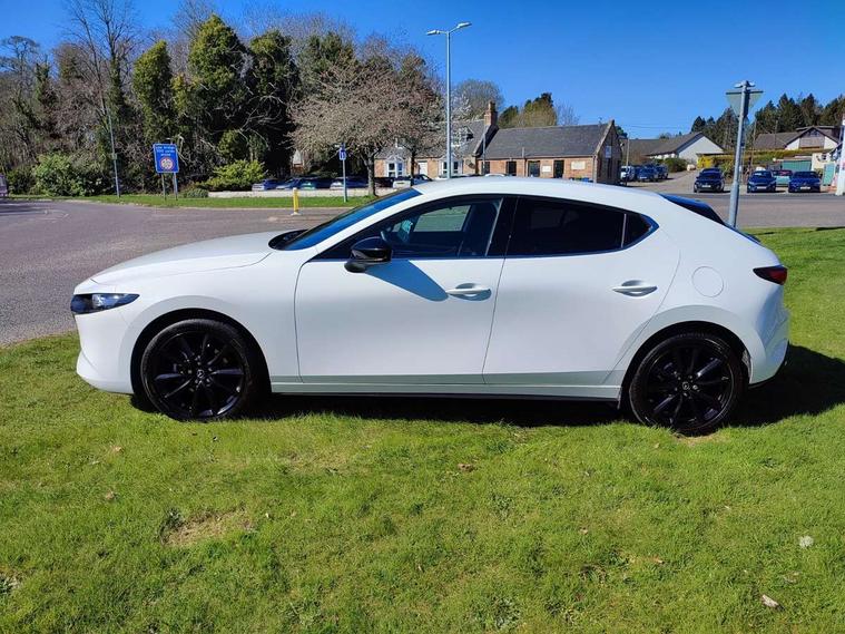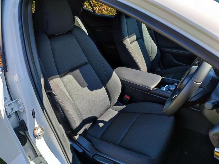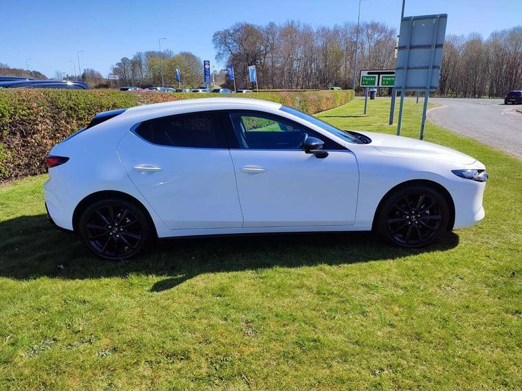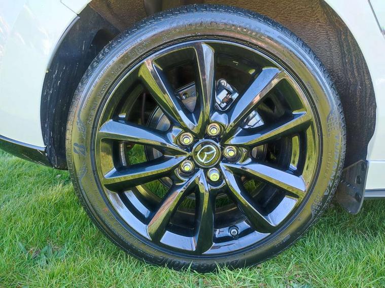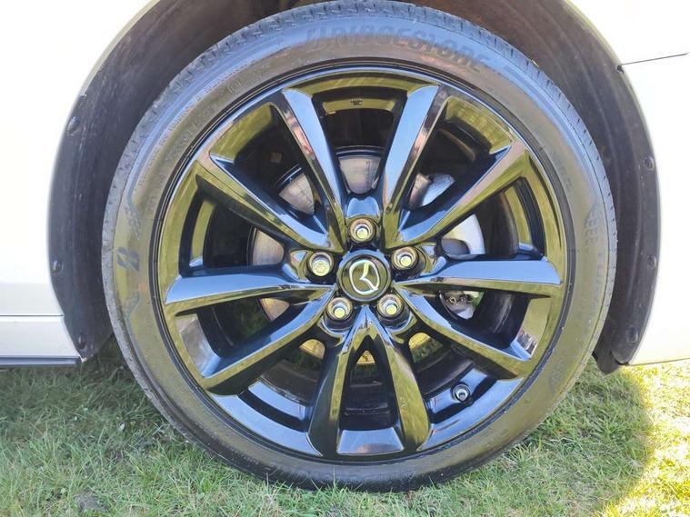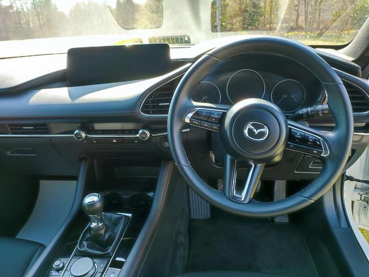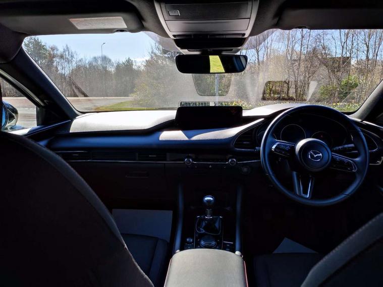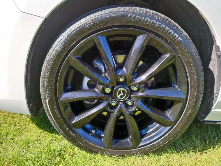 10.25" display with Mazda Connect infotainment, 7" colour TFT display, Audio transfer from bluetooth devices, Blind spot monitoring with rear cross traffic alert, Colour active driving display inc Windscreen projected, Traffic Sign Recognition, turn-by- turn navigation and Mazda Radar Cruise Control information, Digital instrument cluster, Driver attention alert system, E-call with GPS, Emergency stop signalling system, Engine start/stop button, Front and rear parking sensor with audible and visual warning, Head up Display, Integrated bluetooth with steering wheel mounted controls, Intelligent speed assist, Lane keep assist system (LAS) with Lane departure warning system (LDWS), Mazda connected services, Mazda Navigation System with european mapping, Mazda Radar Cruise Control, Mobile App interface, Multimedia Commander, PAS, Reversing camera, Service indicator, Tailgate, Traffic sign recognition (TSR), Trip computer, Wireless Apple CarPlay/Android Auto, Wireless charging, i-stop, 2 USB-C ports in the front, Mazda Multimedia System with AM / FM / DAB radio with 8 speakers, Auto dimming rear view mirror, B-pillar garnish in piano black, Black door mirrors, Coming/leaving home lighting function, Dark metallic finish signature wing, Daytime running lights, Dual chrome tailpipes tip, Dusk sensing headlights, Electric front/rear windows with one touch/auto up/down, Electrically adjustable, heated auto power folding door mirrors, Front body coloured bumper with black lower bezel, Front kodo turn signal, Gloss black finish front grille, Gloss black rear roof spoiler, High beam control, LED front fog lights, LED headlamps with auto levelling, LED indicator lights, LED rear combination lights, LED third brake light, Privacy glass with dark tinting on rear side windows and rear window, Rain sensing front wipers with adjustable sensitivity and speed, Rear colour coded bumper with gloss black lower moulding, Rear fog lights, Rear side wing doors, Speed adjustable rear wash wiper with intermittent wipe, 12v electrical power outlet, 3 seat bench in 2nd row, 60/40 split fold down rear seats, Black with red stiching steering wheel, gearshift gaitor, dashboard panel, armrest, Cloth upholstery, Dark cloth door panel inserts, Dark roof headlining, ceiling and pillars, Driver seat manual slide, recline, height and seat tilt adjust, Driver, front passenger and two rear door pockets, Driver, Front passenger and two rear grab handles with coathooks, Driver/passenger sunvisors + vanity mirrors (drivers side with ticket holder), Dual zone climate control air conditioning, Folding rear centre armrest with two cup holders, Front and rear courtesy lamps, Front armrest, Front centre storage with two cupholders, Front head restraints, Front passenger seatback pocket, Front passengers seat manual slide, recline and height adjustment, Gear shift indicator, Heated front seats with 3 stage setting, Illuminated glovebox, Interior colouration dashboard and doorcards in black with dark stitching, ISOFIX child seat anchorage points attached on outer rear seats, Leather wrapped gear shift knob, Leather wrapped steering wheel, LED interior light, LED light in luggage compartment, Power outlet in luggage compartment, Roof mounted sunglasses holder, Single front passenger seat, Three height adjustable rear head restraints, Tilt/height adjustable steering wheel, 3 point ELR front seatbelts with pretensioners, 3 rear 3 point seatbelts with ELR, Anti-lock braking system (ABS), Drivers knee airbag, DSC - Dynamic Stability Control, Dual stage driver and single stage passenger airbags, EBD - Electronic brakeforce distribution, Electronic parking brake with auto disengage function and auto hold function, Front and rear curtain airbags, Front passenger airbag cut-off switch, Front side airbags, Front smart city brake support, G-Vectoring control plus, Hill launch assist, Intelligent Traction Control system, Manual child lock in rear doors, Mild Hybrid system with regenerative braking, Seatbelt reminder for driver/front passenger and rear seats, Tyre pressure monitoring system (TPMS), Auto door lock when driving, Remote central locking + deadlocks, Smart keyless entry, Thatcham accredited alarm and immobiliser, 18" Black alloy wheels, Emergency tyre repair kit,