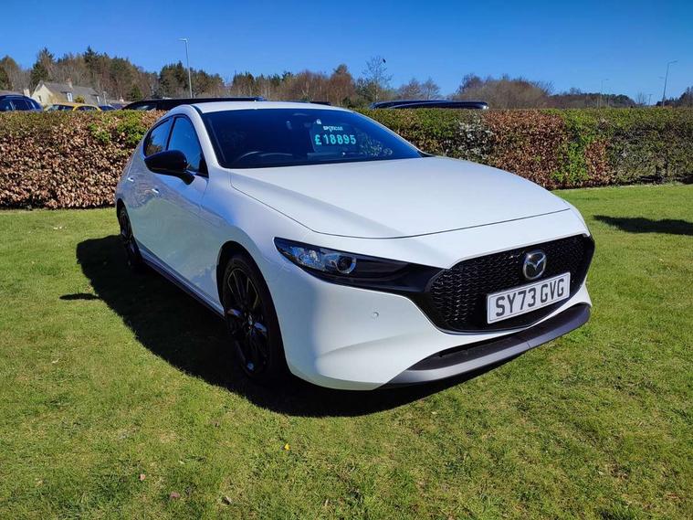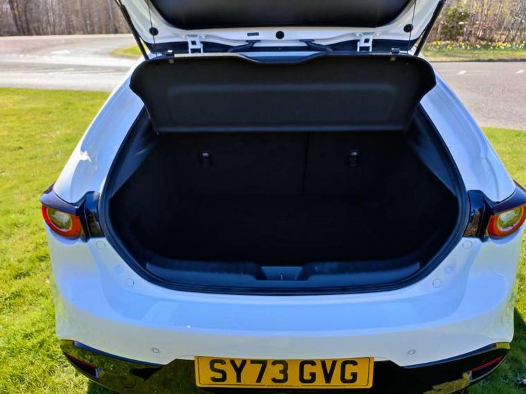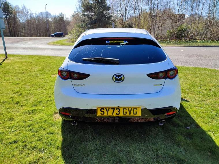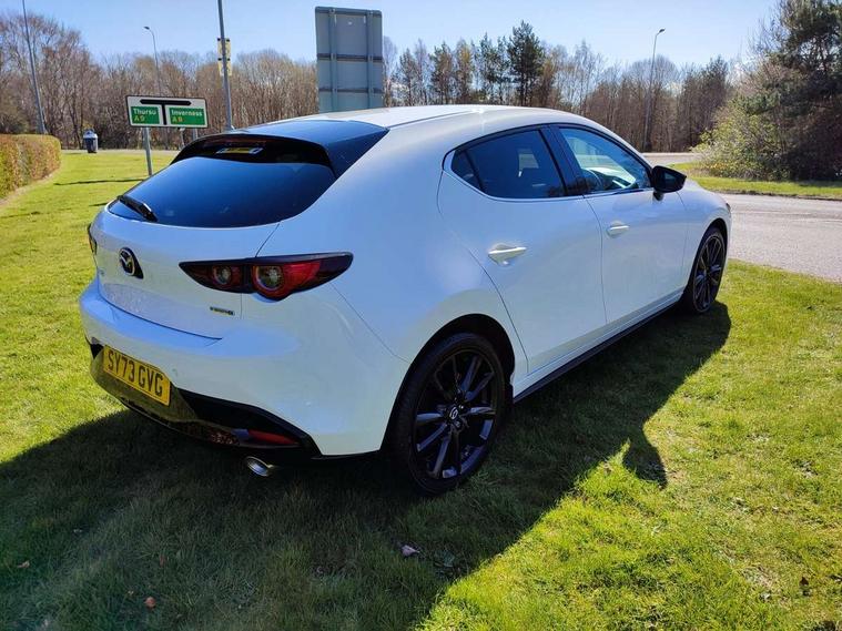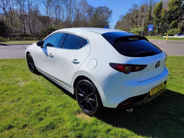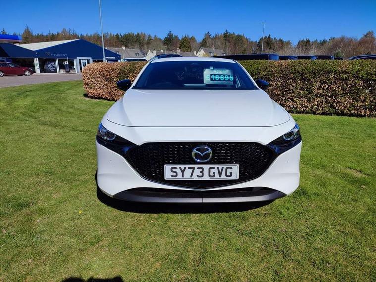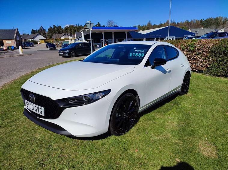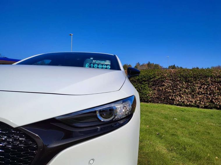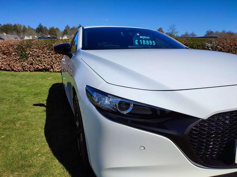 10.25" display with Mazda Connect infotainment, 7" colour TFT display, Audio transfer from bluetooth devices, Blind spot monitoring with rear cross traffic alert, Colour active driving display inc Windscreen projected, Traffic Sign Recognition, turn-by- turn navigation and Mazda Radar Cruise Control information, Digital instrument cluster, Driver attention alert system, E-call with GPS, Emergency stop signalling system, Engine start/stop button, Front and rear parking sensor with audible and visual warning, Head up Display, Integrated bluetooth with steering wheel mounted controls, Intelligent speed assist, Lane keep assist system (LAS) with Lane departure warning system (LDWS), Mazda connected services, Mazda Navigation System with european mapping, Mazda Radar Cruise Control, Mobile App interface, Multimedia Commander, PAS, Reversing camera, Service indicator, Tailgate, Traffic sign recognition (TSR), Trip computer, Wireless Apple CarPlay/Android Auto, Wireless charging, i-stop, 2 USB-C ports in the front, Mazda Multimedia System with AM / FM / DAB radio with 8 speakers, Auto dimming rear view mirror, B-pillar garnish in piano black, Black door mirrors, Coming/leaving home lighting function, Dark metallic finish signature wing, Daytime running lights, Dual chrome tailpipes tip, Dusk sensing headlights, Electric front/rear windows with one touch/auto up/down, Electrically adjustable, heated auto power folding door mirrors, Front body coloured bumper with black lower bezel, Front kodo turn signal, Gloss black finish front grille, Gloss black rear roof spoiler, High beam control, LED front fog lights, LED headlamps with auto levelling, LED indicator lights, LED rear combination lights, LED third brake light, Privacy glass with dark tinting on rear side windows and rear window, Rain sensing front wipers with adjustable sensitivity and speed, Rear colour coded bumper with gloss black lower moulding, Rear fog lights, Rear side wing doors, Speed adjustable rear wash wiper with intermittent wipe, 12v electrical power outlet, 3 seat bench in 2nd row, 60/40 split fold down rear seats, Black with red stiching steering wheel, gearshift gaitor, dashboard panel, armrest, Cloth upholstery, Dark cloth door panel inserts, Dark roof headlining, ceiling and pillars, Driver seat manual slide, recline, height and seat tilt adjust, Driver, front passenger and two rear door pockets, Driver, Front passenger and two rear grab handles with coathooks, Driver/passenger sunvisors + vanity mirrors (drivers side with ticket holder), Dual zone climate control air conditioning, Folding rear centre armrest with two cup holders, Front and rear courtesy lamps, Front armrest, Front centre storage with two cupholders, Front head restraints, Front passenger seatback pocket, Front passengers seat manual slide, recline and height adjustment, Gear shift indicator, Heated front seats with 3 stage setting, Illuminated glovebox, Interior colouration dashboard and doorcards in black with dark stitching, ISOFIX child seat anchorage points attached on outer rear seats, Leather wrapped gear shift knob, Leather wrapped steering wheel, LED interior light, LED light in luggage compartment, Power outlet in luggage compartment, Roof mounted sunglasses holder, Single front passenger seat, Three height adjustable rear head restraints, Tilt/height adjustable steering wheel, 3 point ELR front seatbelts with pretensioners, 3 rear 3 point seatbelts with ELR, Anti-lock braking system (ABS), Drivers knee airbag, DSC - Dynamic Stability Control, Dual stage driver and single stage passenger airbags, EBD - Electronic brakeforce distribution, Electronic parking brake with auto disengage function and auto hold function, Front and rear curtain airbags, Front passenger airbag cut-off switch, Front side airbags, Front smart city brake support, G-Vectoring control plus, Hill launch assist, Intelligent Traction Control system, Manual child lock in rear doors, Mild Hybrid system with regenerative braking, Seatbelt reminder for driver/front passenger and rear seats, Tyre pressure monitoring system (TPMS), Auto door lock when driving, Remote central locking + deadlocks, Smart keyless entry, Thatcham accredited alarm and immobiliser, 18" Black alloy wheels, Emergency tyre repair kit,