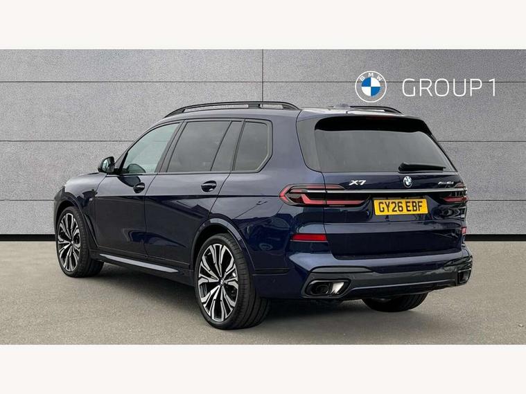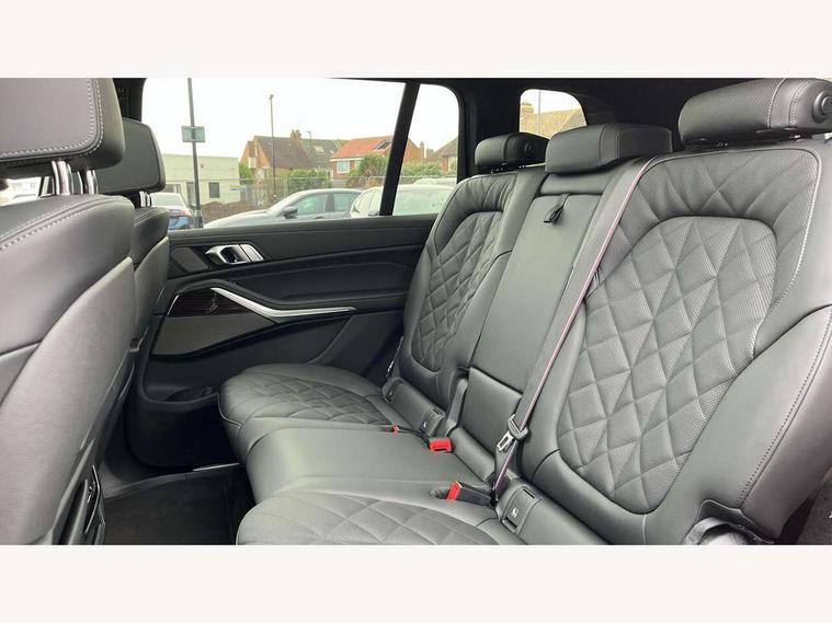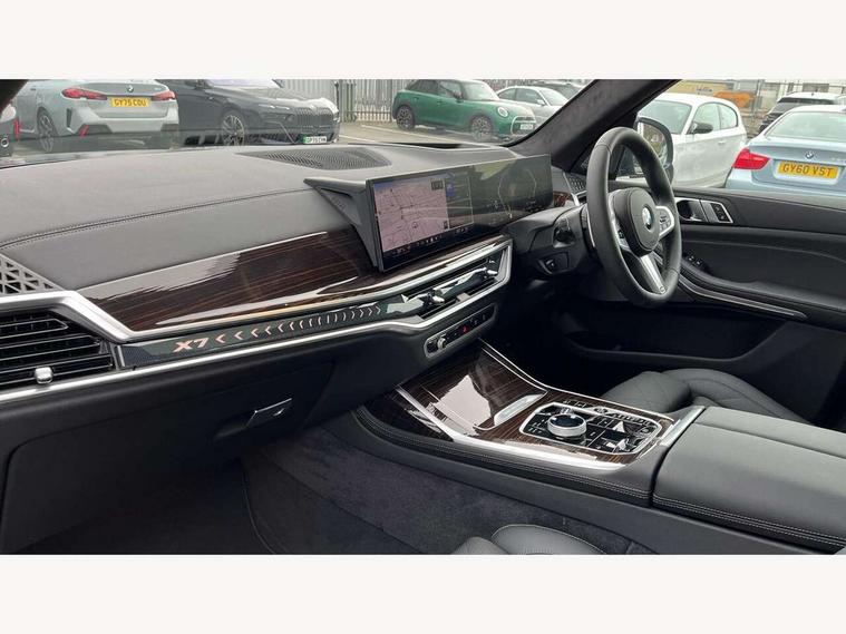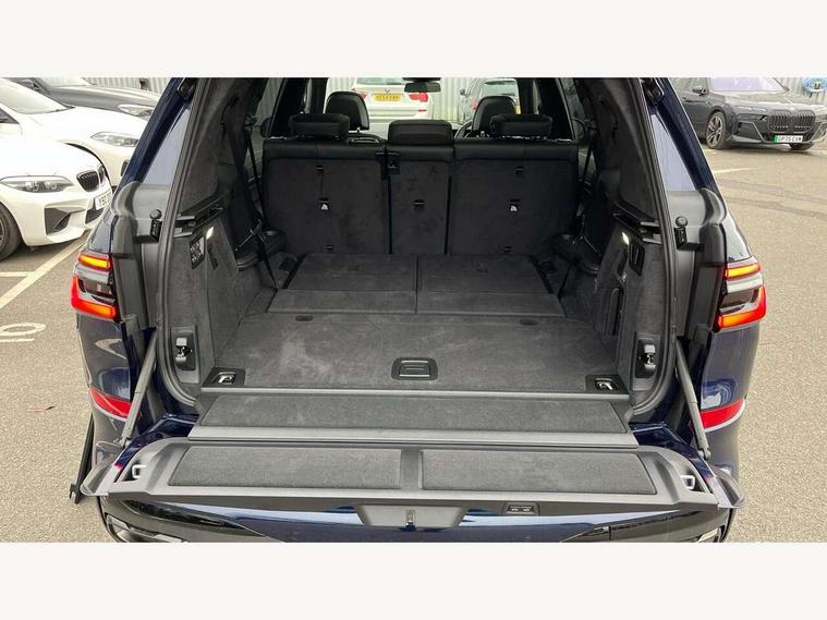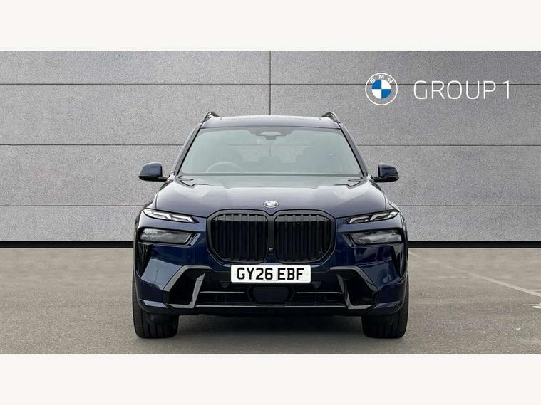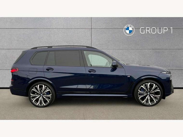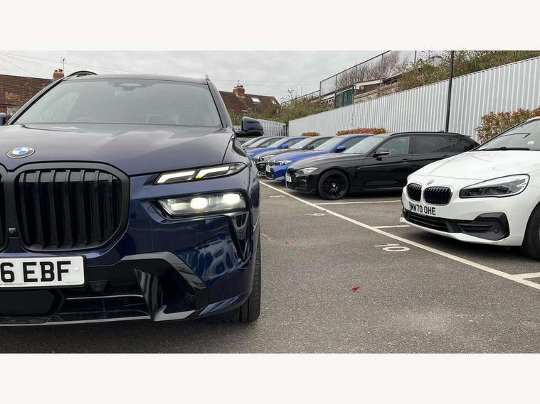 Attentiveness assist, Automatic start/stop function, Automatic tailgate operation, BMW ConnectedDrive online services, BMW Drive recorder, BMW gesture control, BMW Teleservices, Brake pad wear indicator in front and rear, Condition based service, Integrated owner's handbook, Live Cockpit Professional with head up display including 12.3" instrument cluster and 14.9" central display, Parking assistant pro including reversing assistant, PDC, lateral parking aid, reversing assist camera, parking drive off monitoring, 48V Mild hybrid technology, 8 speed automatic with steptronic transmission including automatic hold function and gearshift paddles on the steering wheel, Drive experience switch with comfort mode + ECO PRO + sport mode, Front and rear air suspension, Permanent all wheel drive, 2 rear USB-C ports, 2x Front USB (1x USB-C, 1x USB-A), DAB radio, Personal eSim, Acoustic glazing, Adaptive air flap control bars in high gloss black, Air breather and door claddings in high gloss chrome, Body coloured wheel arches, Dynamic brake lights with LED technology, Electrically adjustable and heated aspheric folding side mirrors with auto dimming, electric fold in function, automatic parking function, Exterior and central air inlets in front bumper painted pearl chrome, Follow me home headlight function, Frameless interior mirror, Front and rear electric windows, Heated windscreen washer nozzles, High beam assist, High gloss black shadow line roof rails, High gloss black shadowline trim in side/window frame, window recess cover, window guide, B and C pillar, mirror triangle, mirror base, mirror frame, Integrated turn indicators (door), LED daytime running lights, LED rear lights, LED third brake light in rear spoiler, Rain sensor with automatic headlight activation and windscreen wiper control, Rear side wing doors, Side window graphic bars + B and C pillar trim panels in black high gloss, Sump guard front and rear painted in silver, Trailer stabilisation logic, 12V - Power sockets with 2x centre console and 1x luggage compartment, 2 seat bench in 3rd row, 2x cupholders in front, rear centre armrest and two in third row seats, 3 seat bench in 2nd row, 3 spoke M leather multifunction steering wheel, 40:20:40 split folding rear seat backrests, Ambient lighting strip in the instrument panel with illuminated, Armrest in front centre console, Compartment in front of cupholder, Driver and front passenger sunvisors with illuminated vanity mirrors and ticket holder, Electrical steering column with adjustable height and length with activation and control on the steering column, Entry sills with illuminated M inscription, Fold down flush into floor of luggage compartment 50:50, Front and rear colour co-ordinated with all standard carpet colours, Front and rear door pockets, Front and rear side armrests integrated into door trim, Front seat back pockets, Grab handles, Height adjustable front headrests, Height adjustable rear headrests, Lockable glove compartment, Nano filter, Single front passenger seat, Soft close doors, Storage tray and compartment with lid in centre console, Wireless charging tray, Additional storage compartment pack - X7, Ambient light interior pack - X7, Connected Package Professional - X7, Interior lighting pack - X7, Luggage compartment pack - X7, M aerodynamics pack - X7, M Sport pack - X7, 3 point seatbelts on all seats, front pyrotechnic belt tensioners, stopper and belt force limiters, front and outer rear seats, Acoustic protection for pedestrians, Active protection, Airbag - Front driver and passenger, side airbags and Head airbags, Anti lock braking system (ABS) with cornering brake control, BMW emergency call, Child seat ISOFIX attachment rear outer seats in 2nd row and both seats in 3rd row includes top tether, Comfort access system with digital key plus, Comfort cushion seats for outer seats in 2nd row, Crash sensor inclu activation of airbags, interior light, safety battery terminal clamp, hazard warn flasher, unlock doors, deactivation of fuel pump, DSC - Dynamic Stability Control, Dynamic Traction Control - DTC, Electromechanical parking brake with automatic drive away release and auto hold function, Front and rear brake discs with interior ventilation, Hill descent control, Integrated braking system, Manual child lock in rear doors, PC iBrake PostCrash approach control warning with light braking function, Tyre pressure monitoring system, Tyre pressure sensors, Variable torque distribution, Warning triangle and first aid kit, Alarm, Central locking including 2 vehicle keys with integrated emergency key, Engine immobiliser, Locking wheel bolts, Galvanic embellisher for controls,