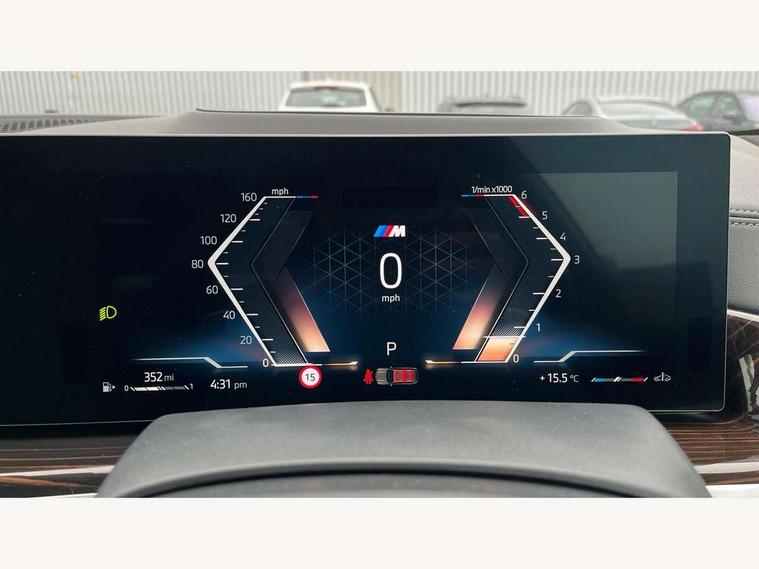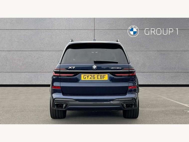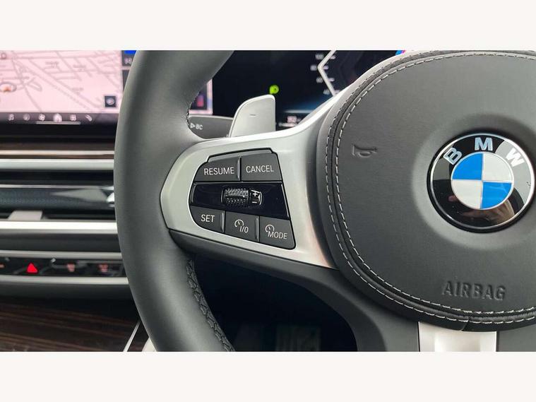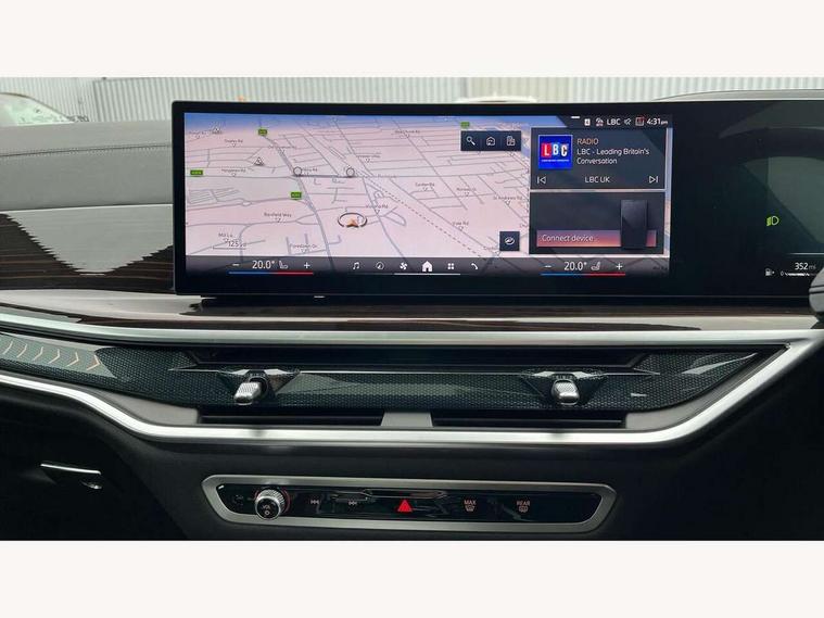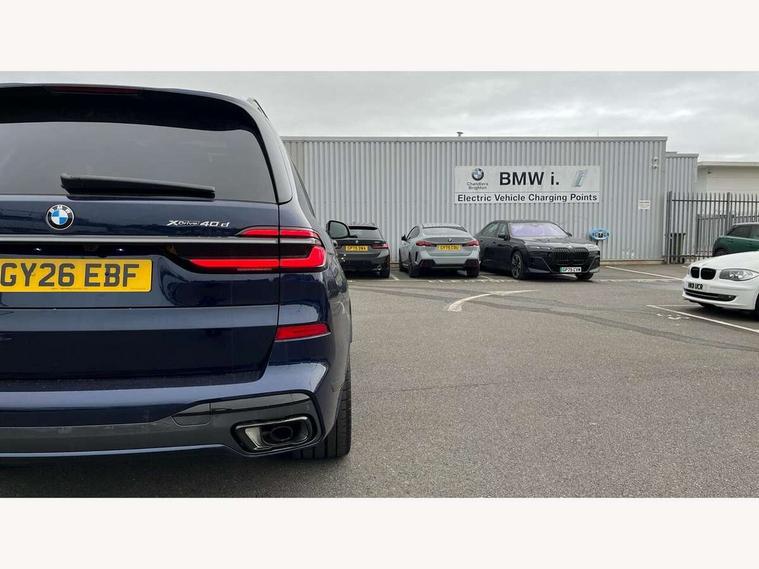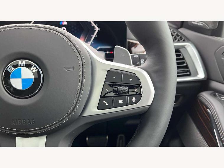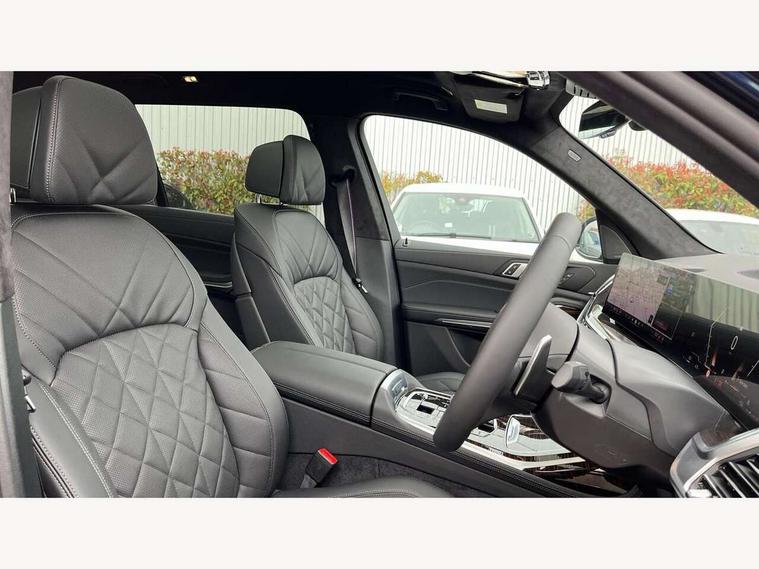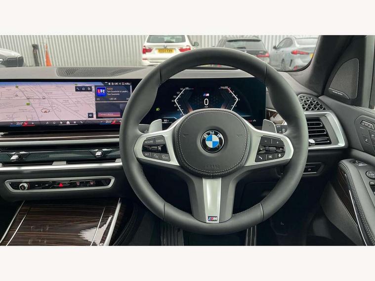 Attentiveness assist, Automatic start/stop function, Automatic tailgate operation, BMW ConnectedDrive online services, BMW Drive recorder, BMW gesture control, BMW Teleservices, Brake pad wear indicator in front and rear, Condition based service, Integrated owner's handbook, Live Cockpit Professional with head up display including 12.3" instrument cluster and 14.9" central display, Parking assistant pro including reversing assistant, PDC, lateral parking aid, reversing assist camera, parking drive off monitoring, 48V Mild hybrid technology, 8 speed automatic with steptronic transmission including automatic hold function and gearshift paddles on the steering wheel, Drive experience switch with comfort mode + ECO PRO + sport mode, Front and rear air suspension, Permanent all wheel drive, 2 rear USB-C ports, 2x Front USB (1x USB-C, 1x USB-A), DAB radio, Personal eSim, Acoustic glazing, Adaptive air flap control bars in high gloss black, Air breather and door claddings in high gloss chrome, Body coloured wheel arches, Dynamic brake lights with LED technology, Electrically adjustable and heated aspheric folding side mirrors with auto dimming, electric fold in function, automatic parking function, Exterior and central air inlets in front bumper painted pearl chrome, Follow me home headlight function, Frameless interior mirror, Front and rear electric windows, Heated windscreen washer nozzles, High beam assist, High gloss black shadow line roof rails, High gloss black shadowline trim in side/window frame, window recess cover, window guide, B and C pillar, mirror triangle, mirror base, mirror frame, Integrated turn indicators (door), LED daytime running lights, LED rear lights, LED third brake light in rear spoiler, Rain sensor with automatic headlight activation and windscreen wiper control, Rear side wing doors, Side window graphic bars + B and C pillar trim panels in black high gloss, Sump guard front and rear painted in silver, Trailer stabilisation logic, 12V - Power sockets with 2x centre console and 1x luggage compartment, 2 seat bench in 3rd row, 2x cupholders in front, rear centre armrest and two in third row seats, 3 seat bench in 2nd row, 3 spoke M leather multifunction steering wheel, 40:20:40 split folding rear seat backrests, Ambient lighting strip in the instrument panel with illuminated, Armrest in front centre console, Compartment in front of cupholder, Driver and front passenger sunvisors with illuminated vanity mirrors and ticket holder, Electrical steering column with adjustable height and length with activation and control on the steering column, Entry sills with illuminated M inscription, Fold down flush into floor of luggage compartment 50:50, Front and rear colour co-ordinated with all standard carpet colours, Front and rear door pockets, Front and rear side armrests integrated into door trim, Front seat back pockets, Grab handles, Height adjustable front headrests, Height adjustable rear headrests, Lockable glove compartment, Nano filter, Single front passenger seat, Soft close doors, Storage tray and compartment with lid in centre console, Wireless charging tray, Additional storage compartment pack - X7, Ambient light interior pack - X7, Connected Package Professional - X7, Interior lighting pack - X7, Luggage compartment pack - X7, M aerodynamics pack - X7, M Sport pack - X7, 3 point seatbelts on all seats, front pyrotechnic belt tensioners, stopper and belt force limiters, front and outer rear seats, Acoustic protection for pedestrians, Active protection, Airbag - Front driver and passenger, side airbags and Head airbags, Anti lock braking system (ABS) with cornering brake control, BMW emergency call, Child seat ISOFIX attachment rear outer seats in 2nd row and both seats in 3rd row includes top tether, Comfort access system with digital key plus, Comfort cushion seats for outer seats in 2nd row, Crash sensor inclu activation of airbags, interior light, safety battery terminal clamp, hazard warn flasher, unlock doors, deactivation of fuel pump, DSC - Dynamic Stability Control, Dynamic Traction Control - DTC, Electromechanical parking brake with automatic drive away release and auto hold function, Front and rear brake discs with interior ventilation, Hill descent control, Integrated braking system, Manual child lock in rear doors, PC iBrake PostCrash approach control warning with light braking function, Tyre pressure monitoring system, Tyre pressure sensors, Variable torque distribution, Warning triangle and first aid kit, Alarm, Central locking including 2 vehicle keys with integrated emergency key, Engine immobiliser, Locking wheel bolts, Galvanic embellisher for controls,