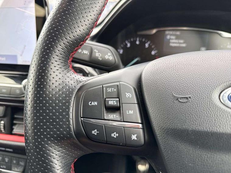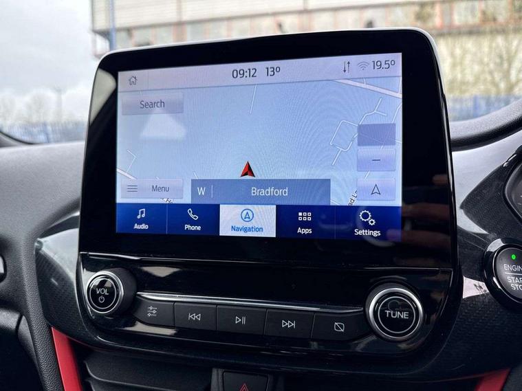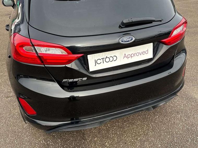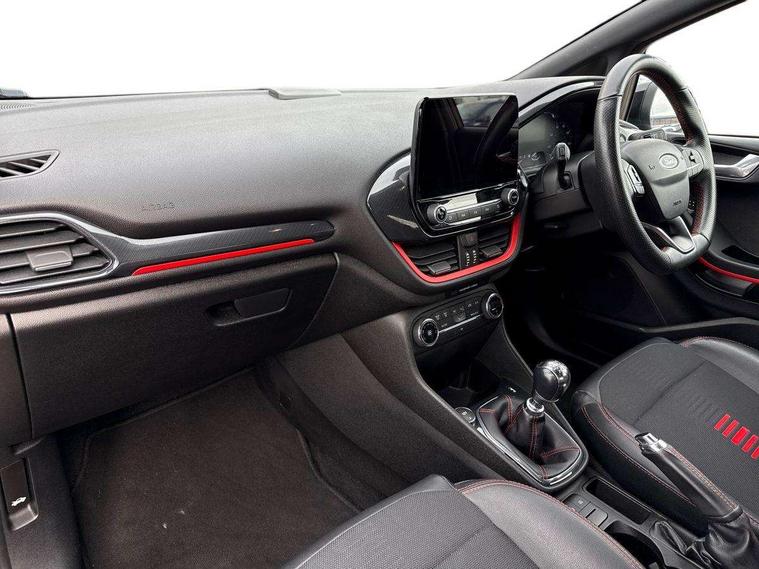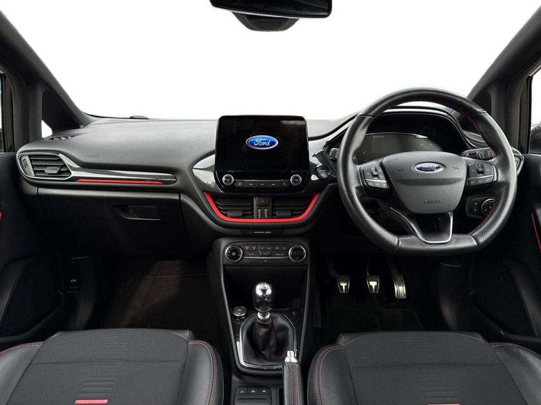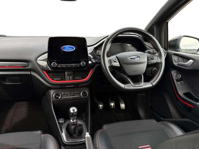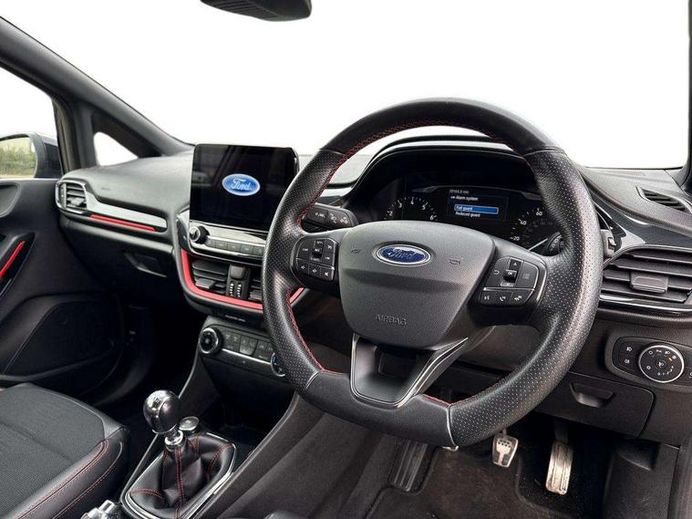 Bluetooth system, Electric power steering, Ford easy fuel, Trip computer, Sports suspension, 2 USB ports, Auxiliary input socket, DAB Digital radio, Steering wheel mounted controls, Auto dimming rear view mirror, Automatic headlights, Body colour bumpers, Body colour door handles, Body colour electric adjustable heated door mirrors with integral indicators, Body colour large rear spoiler, Chrome door handles, Chrome lower window surround, Cornering front fog lights, Electric front windows/one touch facility, LED Night signature to rear lights, LED rear lights, Power foldable door mirrors with puddle lights, Quickclear heated windscreen, Rain sensing wipers and auto dimming rear view mirror, Rear privacy glass, Rear wiper, Rugged body styling kit with active front wing badges, Tinted glass, Unique ST-Line upper grille & full bodystyling kit with ST-Line wing badges, 12V Accessory socket in centre console, 3 spoke flat bottomed leather steering wheel, 60/40 split folding rear seat, Adjustable head restraints, Black headlining, Boot carpet, Centre console with armrest and illuminated cupholders, Chrome inner door handles, Drivers and Passenger lumbar support, EATC - Electronic Auto Temperature control, Footwell illumination, Front and rear velour floor mats, Front map reading lights, Front seat and rear pockets, Illuminated glovebox, Leather gear knob, Leather trimmed handbrake handle, Load area light, Overhead console with sunglasses holder, Pollen filter, Rake/reach adjustable steering wheel, Rear centre head restraint, Sports front seats, Sports pedals, Driver assistance pack - Fiesta/Titanium/Titanium X/Active B+O/Active X/ST-Line X, NCAP Pack - Fiesta, Red pack - Fiesta ST-Line X, 3 point seatbelts on all rear seats, ABS+EBA, Curtain airbags, Driver and passenger airbags, Drivers knee airbag, Electronic stability control with hill start assist, Front passenger airbag deactivation, Front side airbags, Seatbelt warning, Tyre pressure monitoring system, MyKey system, Remote central locking & engine immobiliser, Thatcham Cat.1 alarm,
