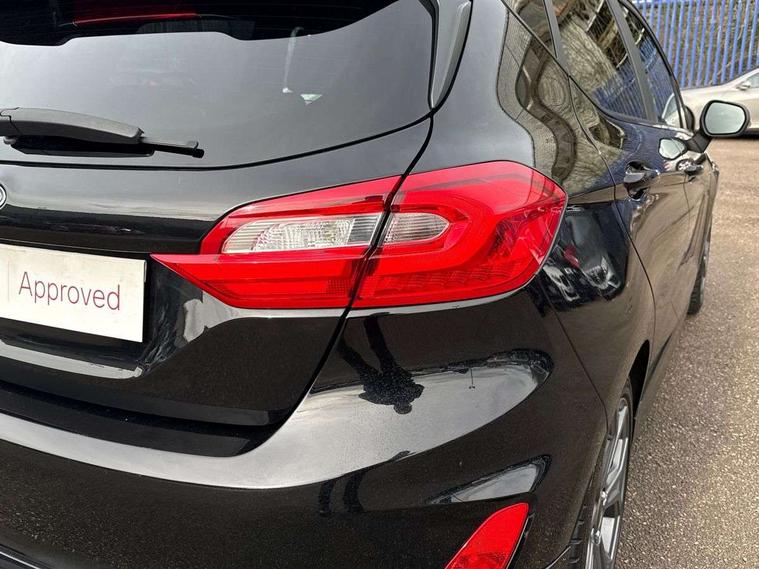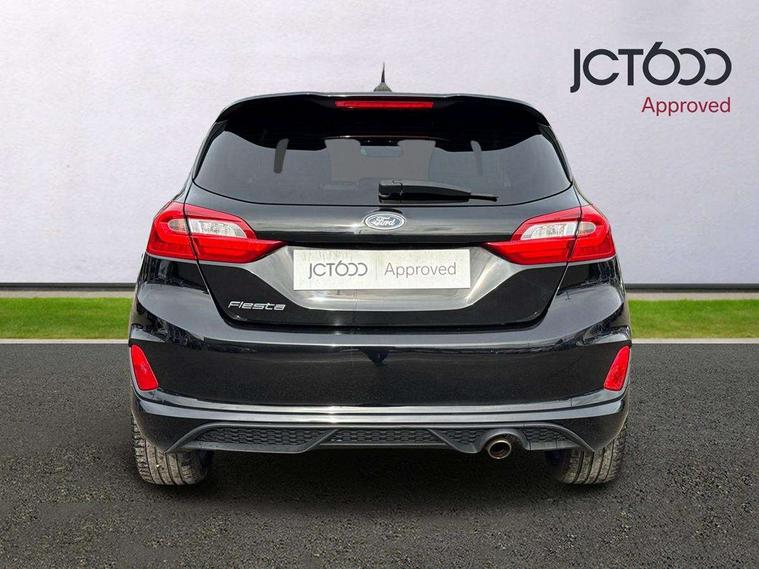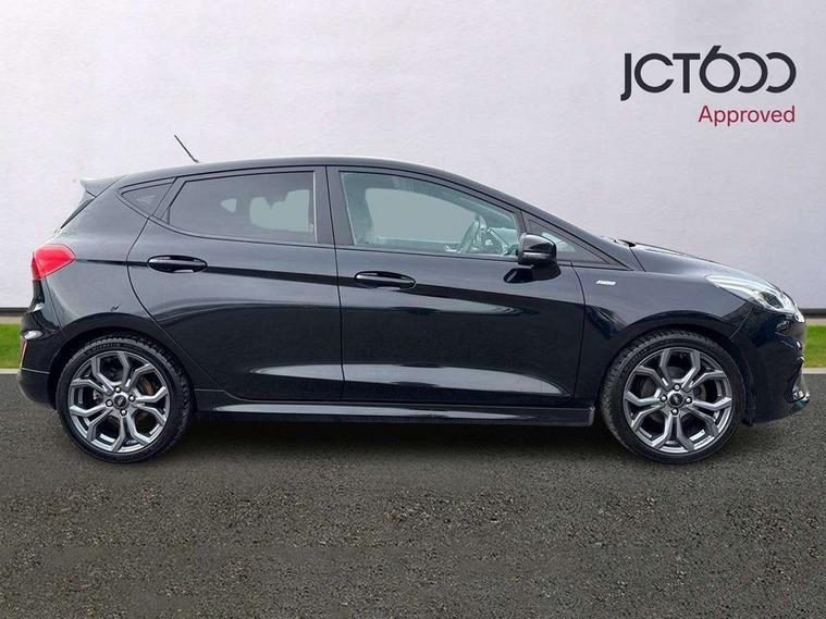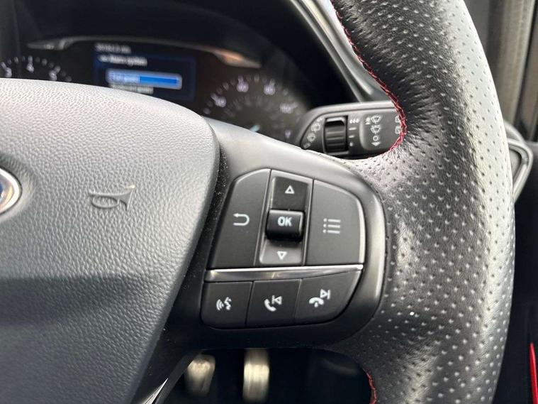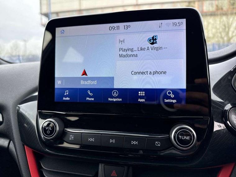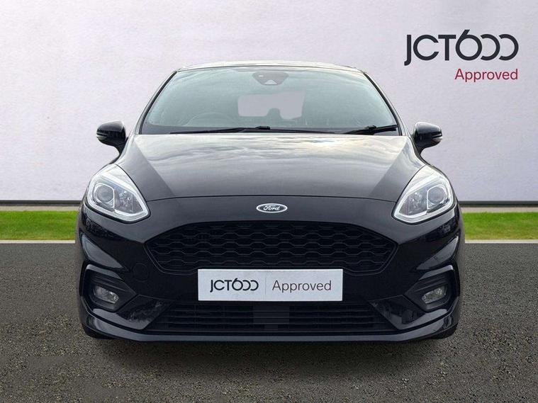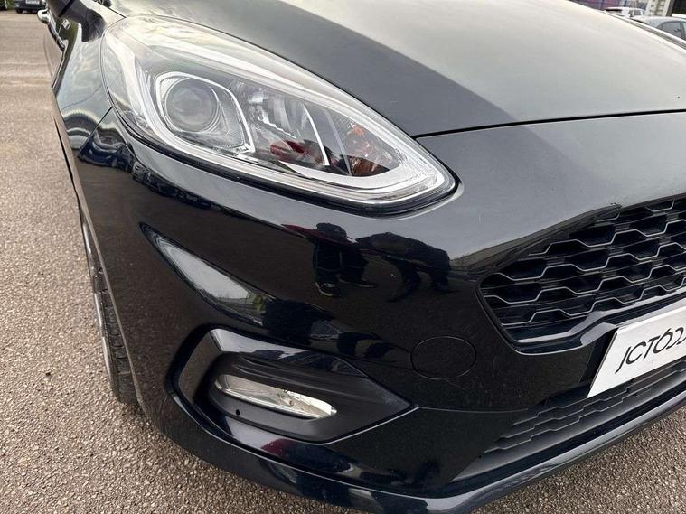 Bluetooth system, Electric power steering, Ford easy fuel, Trip computer, Sports suspension, 2 USB ports, Auxiliary input socket, DAB Digital radio, Steering wheel mounted controls, Auto dimming rear view mirror, Automatic headlights, Body colour bumpers, Body colour door handles, Body colour electric adjustable heated door mirrors with integral indicators, Body colour large rear spoiler, Chrome door handles, Chrome lower window surround, Cornering front fog lights, Electric front windows/one touch facility, LED Night signature to rear lights, LED rear lights, Power foldable door mirrors with puddle lights, Quickclear heated windscreen, Rain sensing wipers and auto dimming rear view mirror, Rear privacy glass, Rear wiper, Rugged body styling kit with active front wing badges, Tinted glass, Unique ST-Line upper grille & full bodystyling kit with ST-Line wing badges, 12V Accessory socket in centre console, 3 spoke flat bottomed leather steering wheel, 60/40 split folding rear seat, Adjustable head restraints, Black headlining, Boot carpet, Centre console with armrest and illuminated cupholders, Chrome inner door handles, Drivers and Passenger lumbar support, EATC - Electronic Auto Temperature control, Footwell illumination, Front and rear velour floor mats, Front map reading lights, Front seat and rear pockets, Illuminated glovebox, Leather gear knob, Leather trimmed handbrake handle, Load area light, Overhead console with sunglasses holder, Pollen filter, Rake/reach adjustable steering wheel, Rear centre head restraint, Sports front seats, Sports pedals, Driver assistance pack - Fiesta/Titanium/Titanium X/Active B+O/Active X/ST-Line X, NCAP Pack - Fiesta, Red pack - Fiesta ST-Line X, 3 point seatbelts on all rear seats, ABS+EBA, Curtain airbags, Driver and passenger airbags, Drivers knee airbag, Electronic stability control with hill start assist, Front passenger airbag deactivation, Front side airbags, Seatbelt warning, Tyre pressure monitoring system, MyKey system, Remote central locking & engine immobiliser, Thatcham Cat.1 alarm,